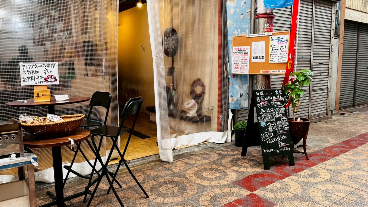 繁栄商店街を進んでいくと、開放感のあるオープンな雰囲気の店舗が見えてきます。ビニールカーテンで囲まれた入口の前には、小さなテーブルとイスが置かれていて、まるで屋台のような親しみやすい佇まい。