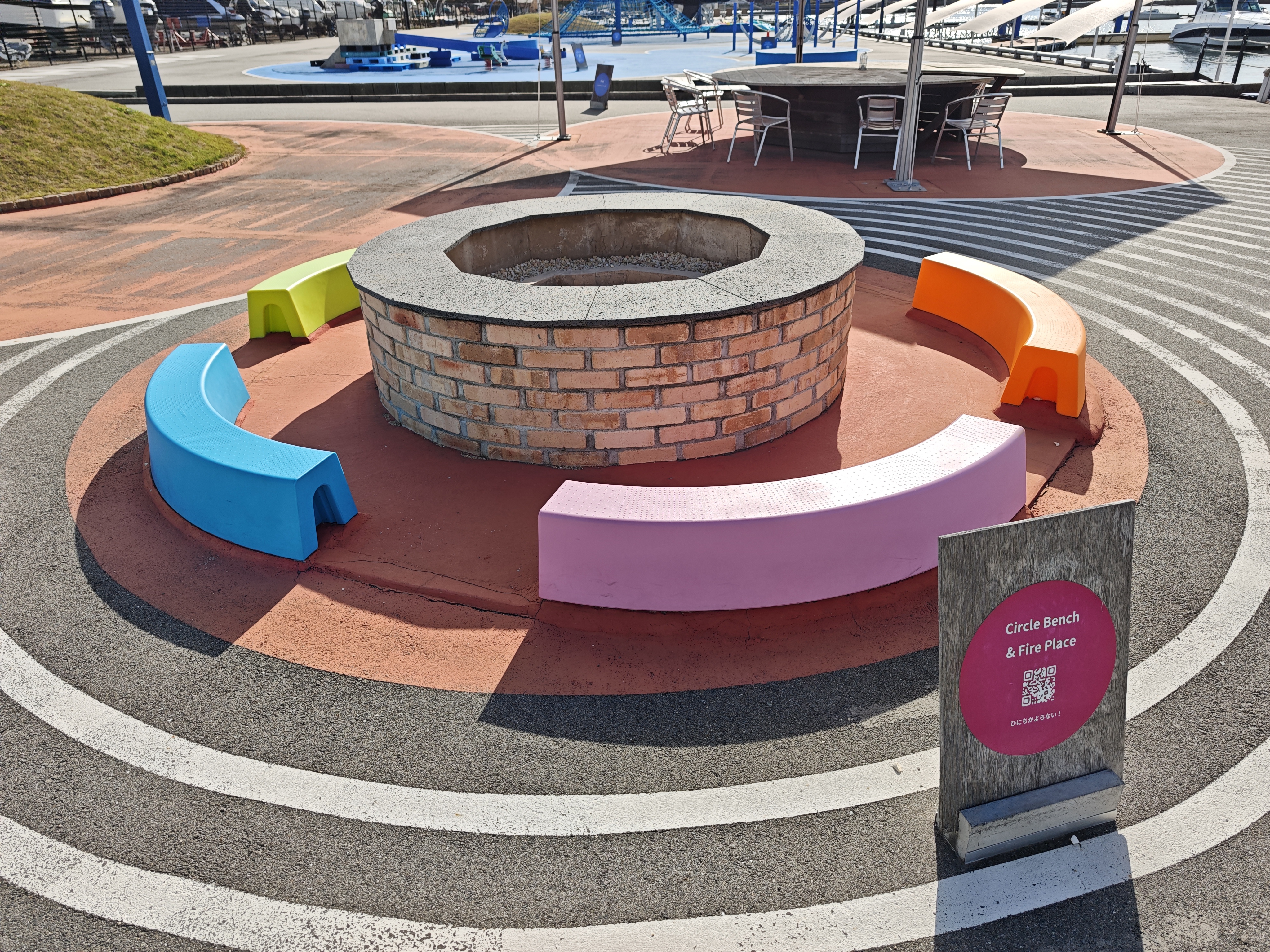 カラフルで可愛いサークルベンチ。冬の寒い日は真ん中で焚き火がされるようです。