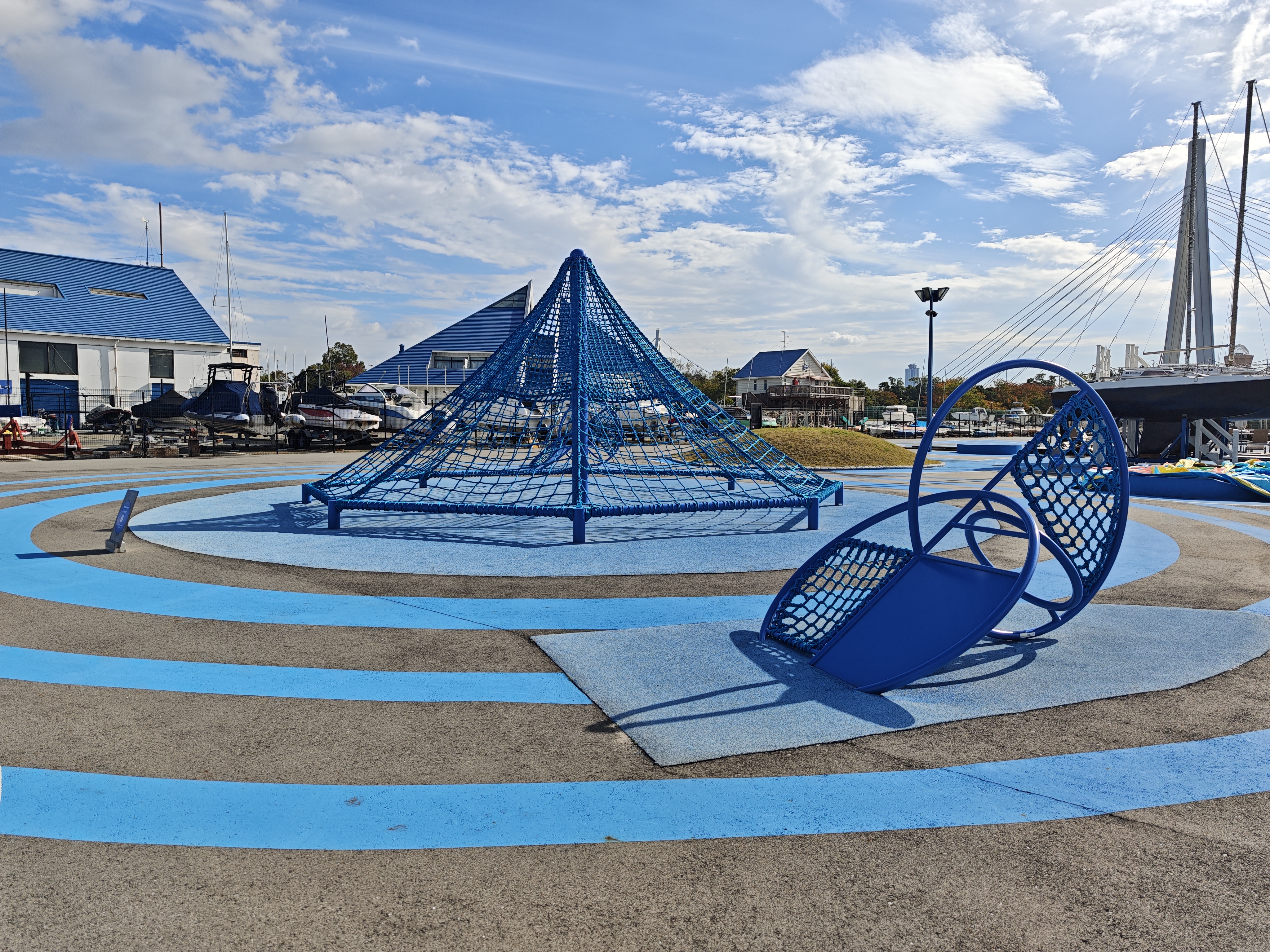 マストに見立てたネット遊具。上まで登って海を眺める景色は綺麗です。