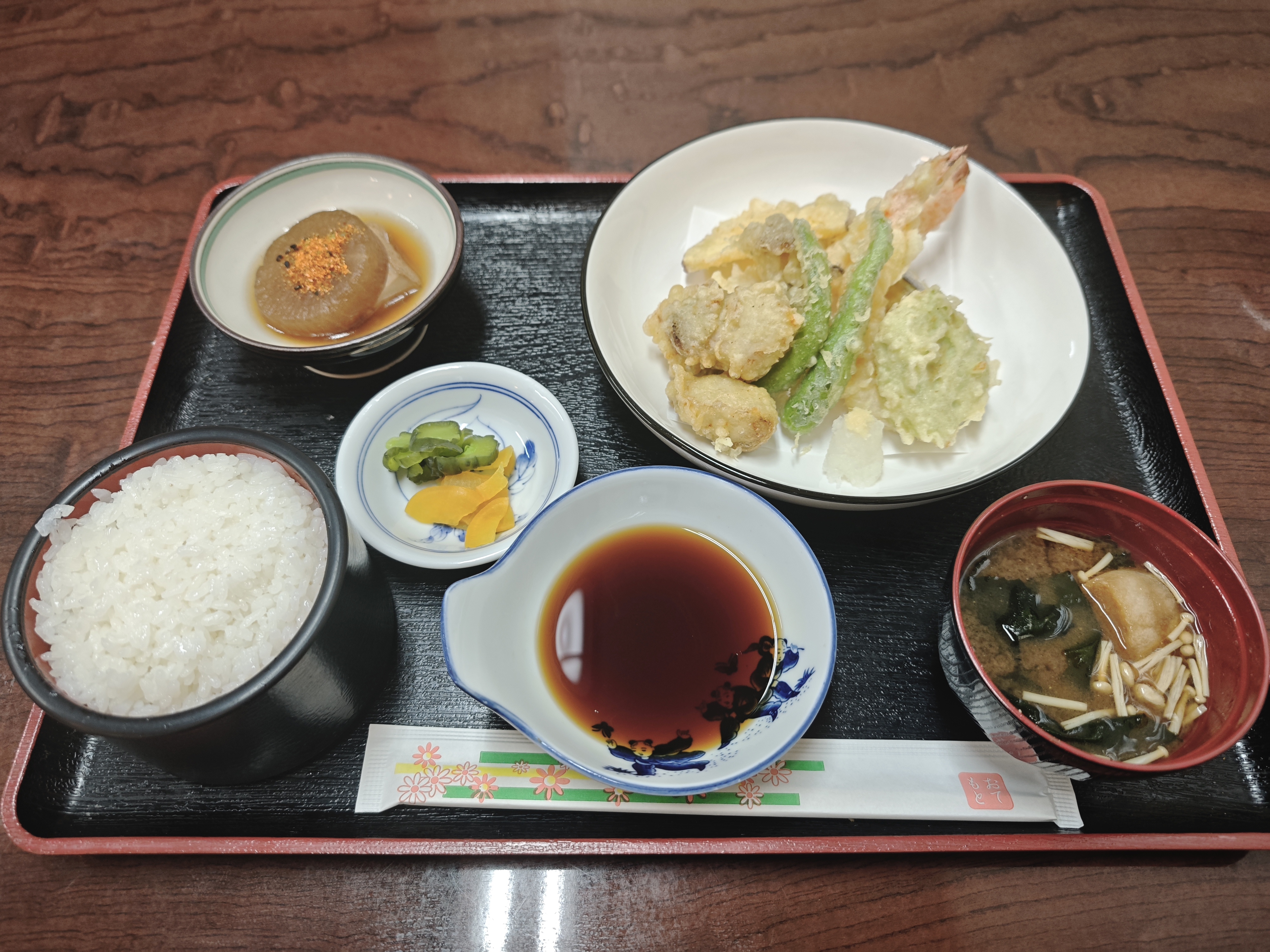 天ぷら定食を注文しました。揚げたての天ぷらに白飯、赤だしの味噌汁、大根と豆腐の煮物、お漬物がセットになっています。