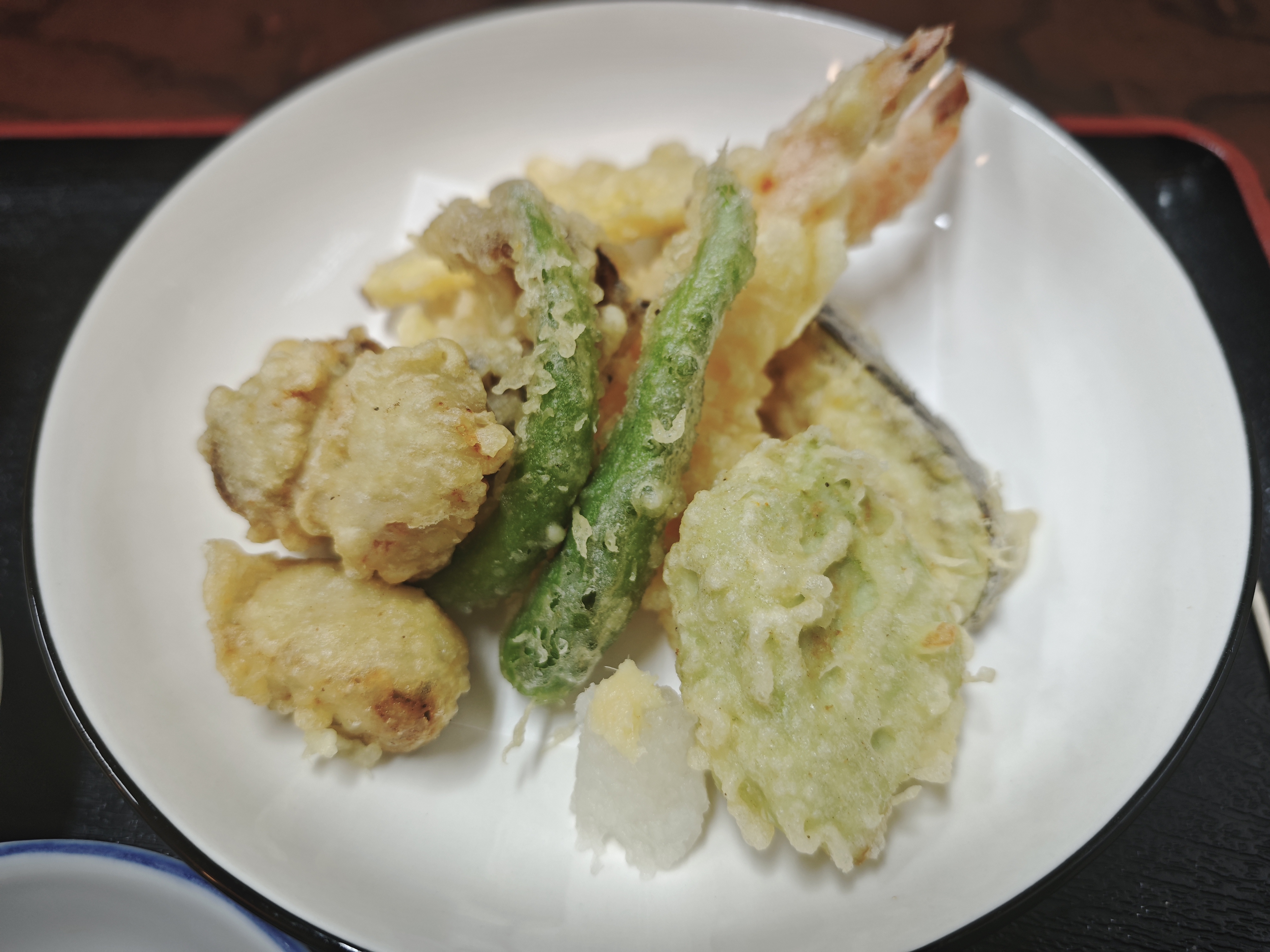 揚げたての天ぷらは薄い衣でサクサクの食感です。食べ終わる頃の少し冷めた状態でもサクッとした食感のままで美味しくいただきました。