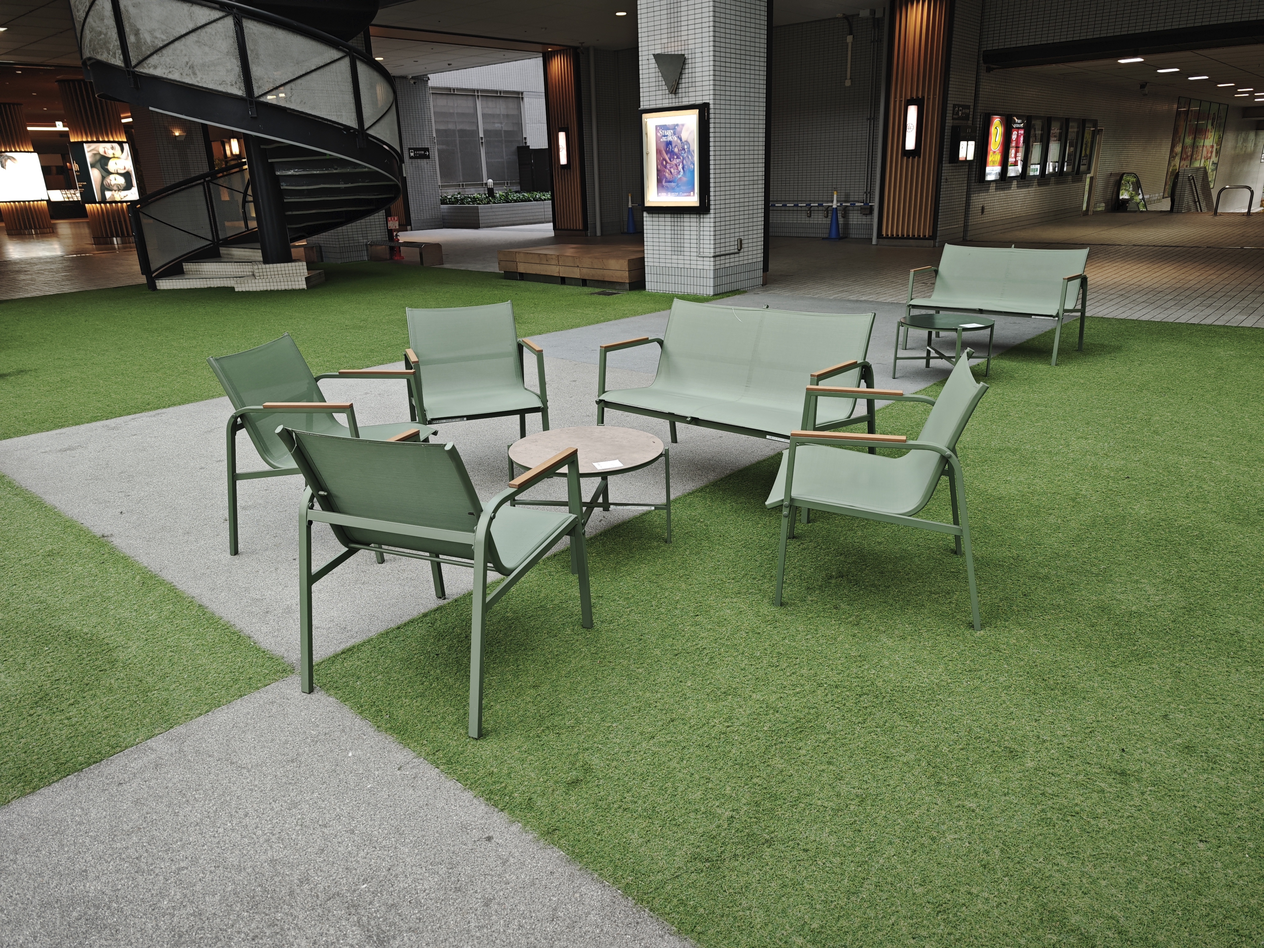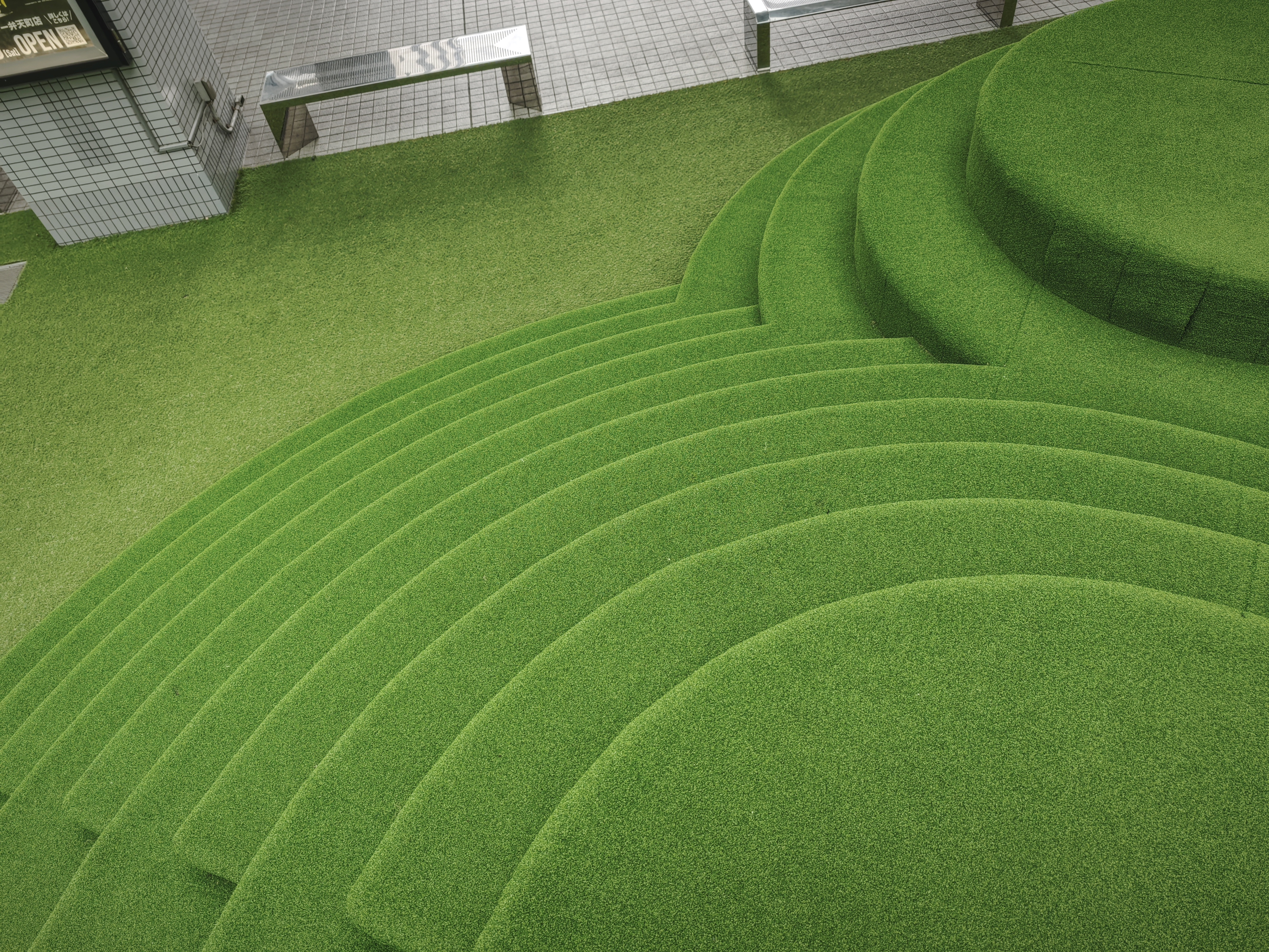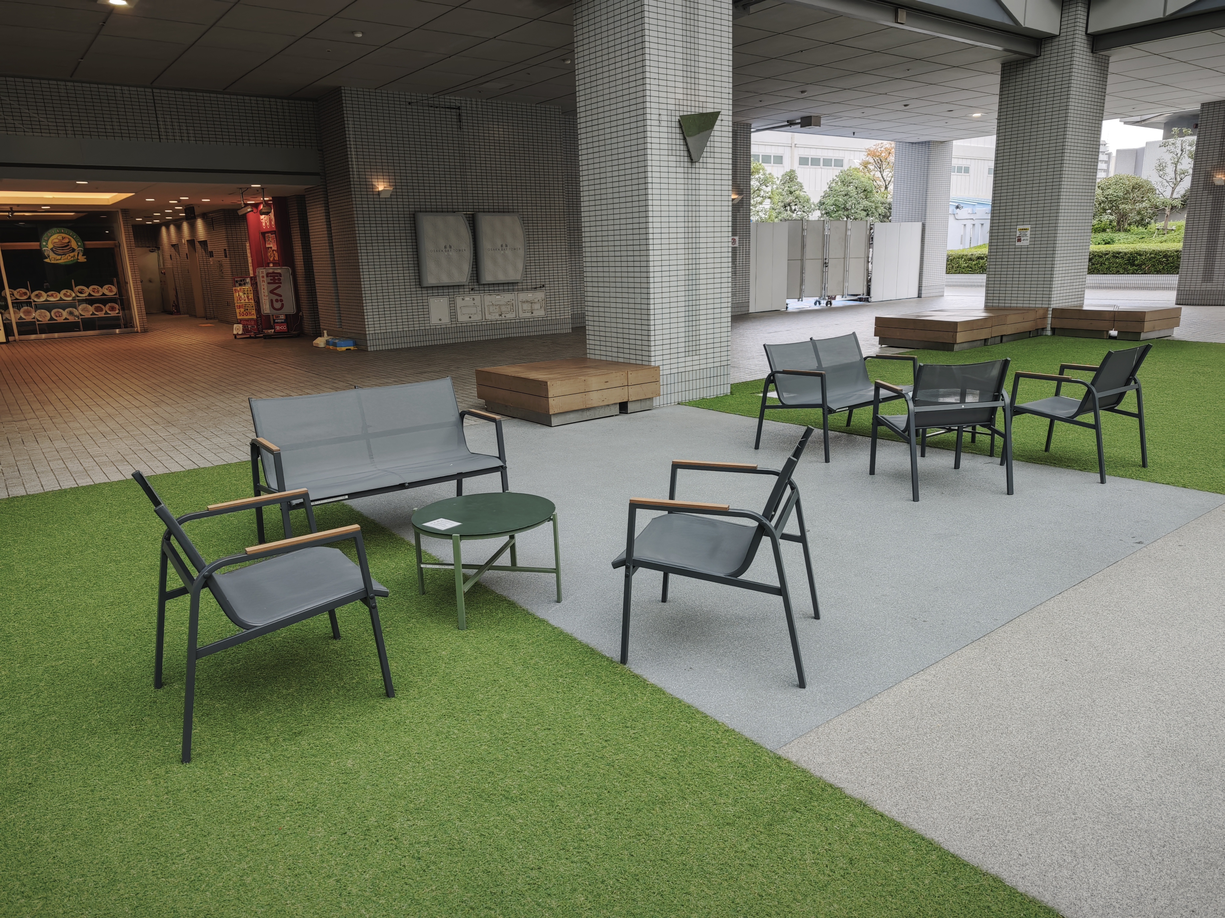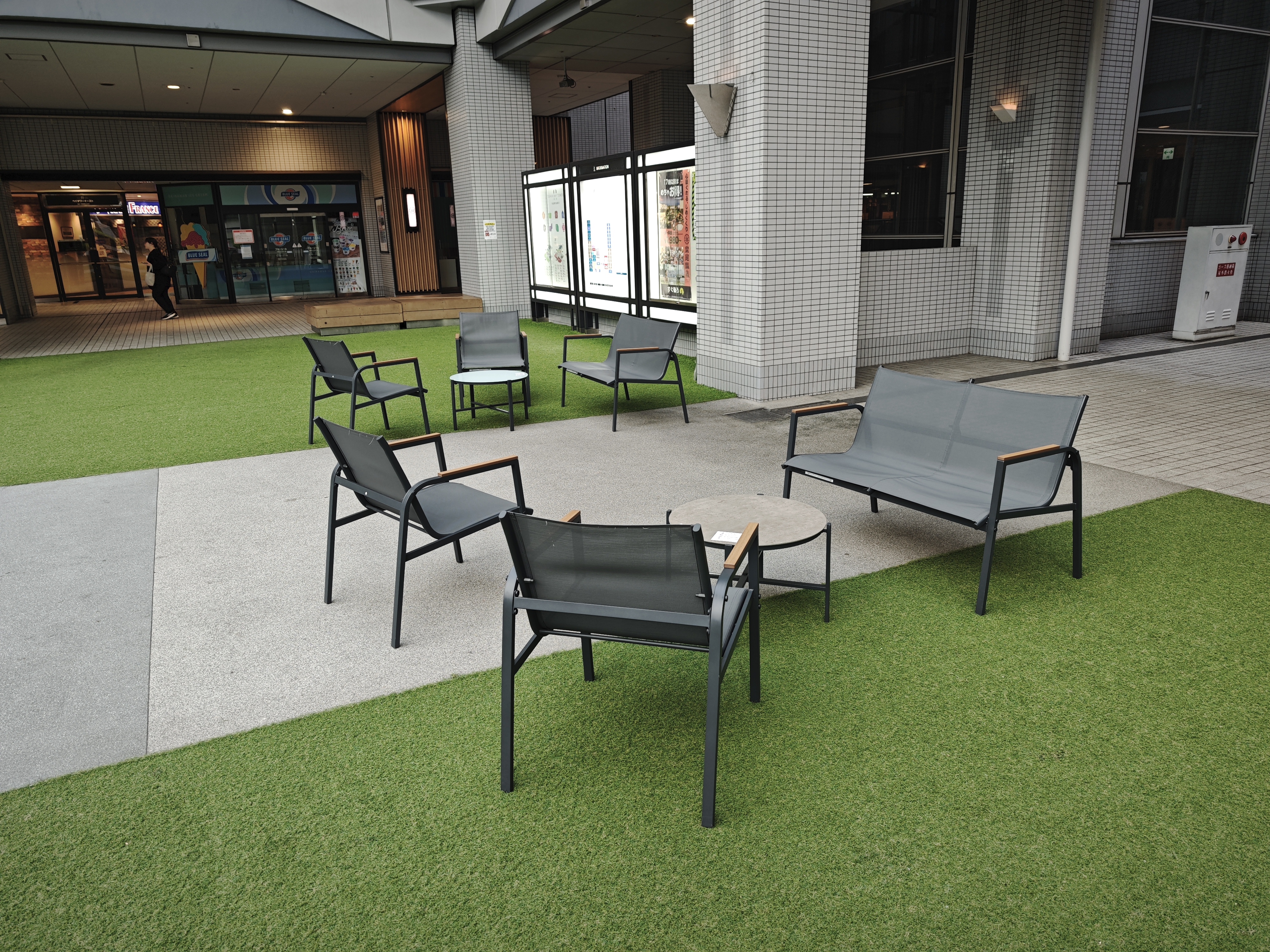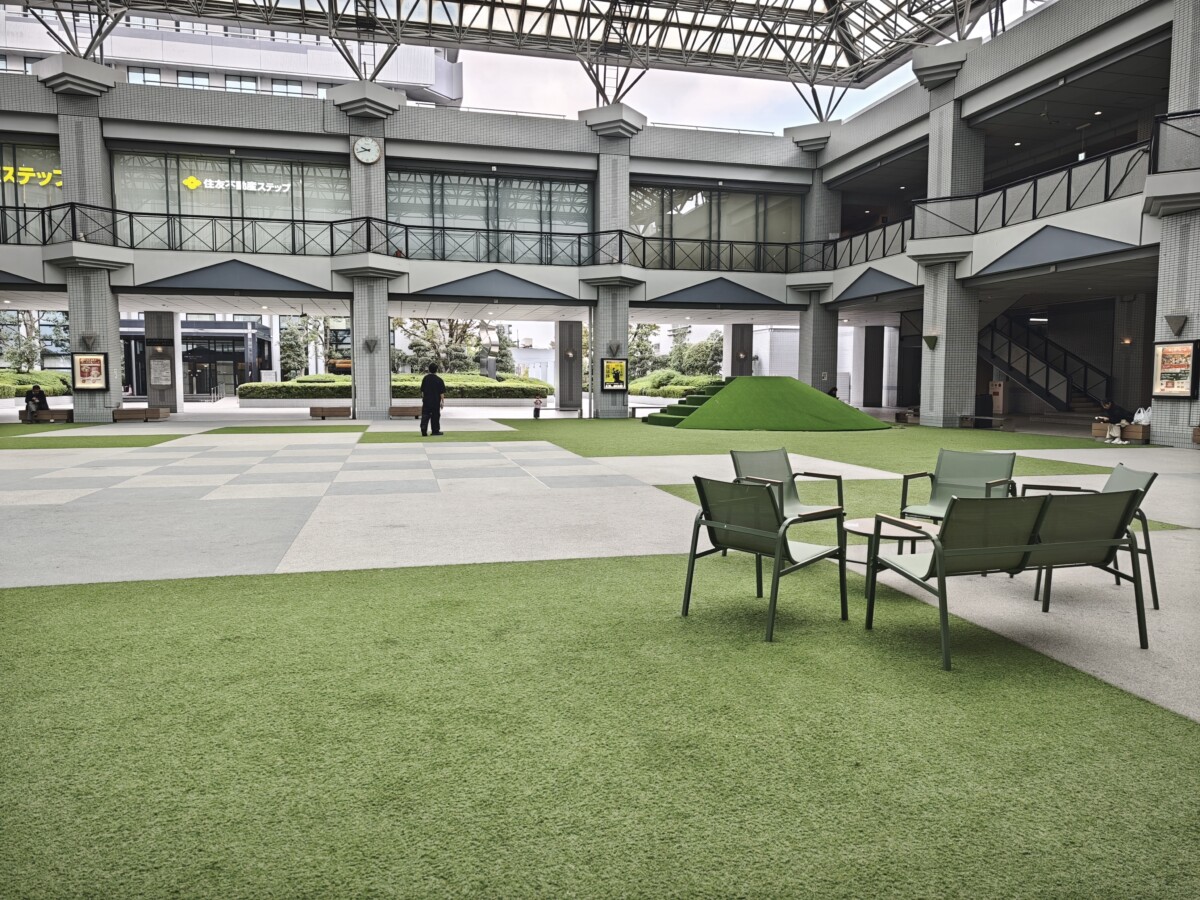 人工芝が美しい広場は、子供から大人まで楽しめる憩いのスポットでした。