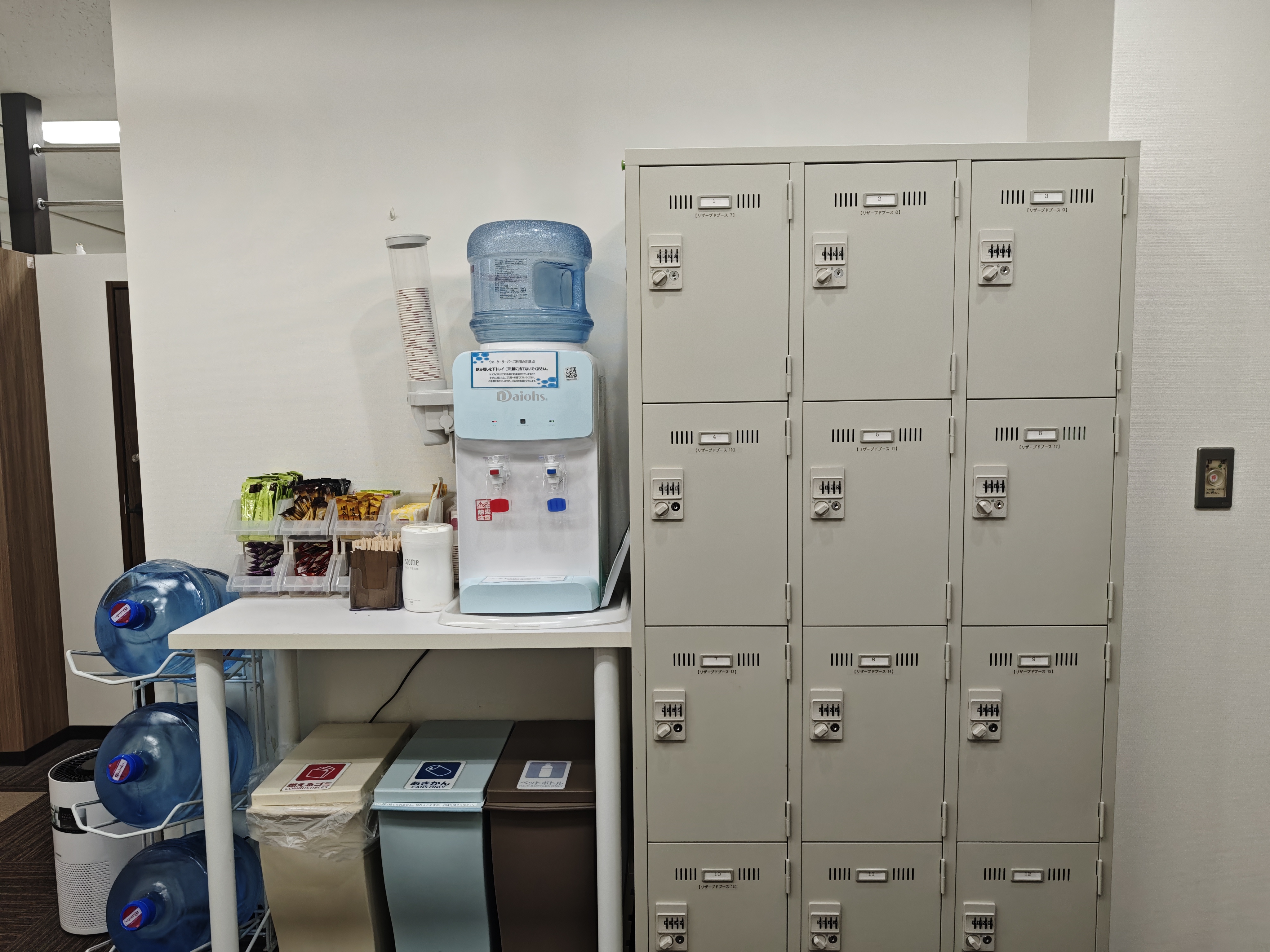 入ってすぐに有料ロッカーとドリンクバーがあります。