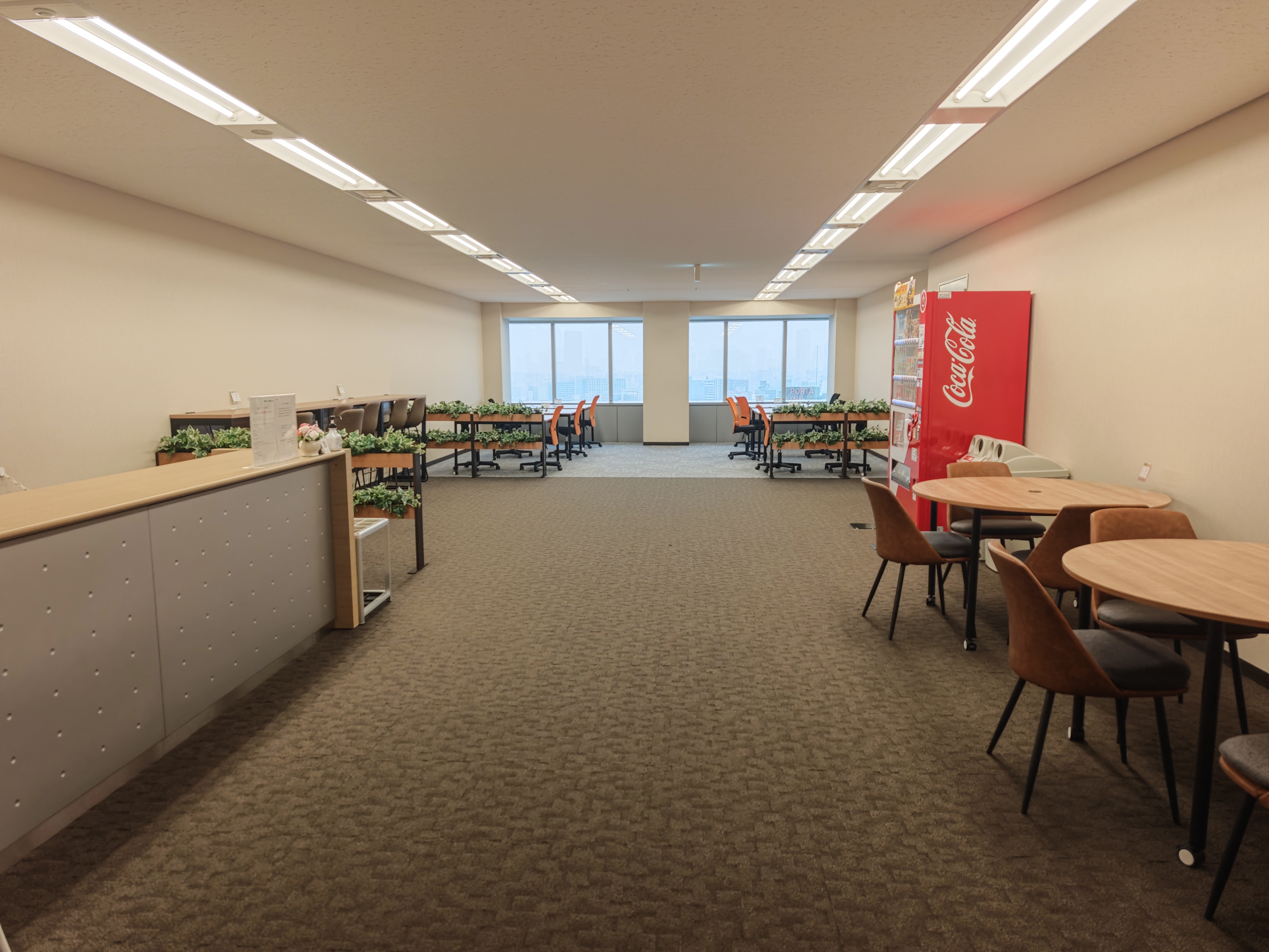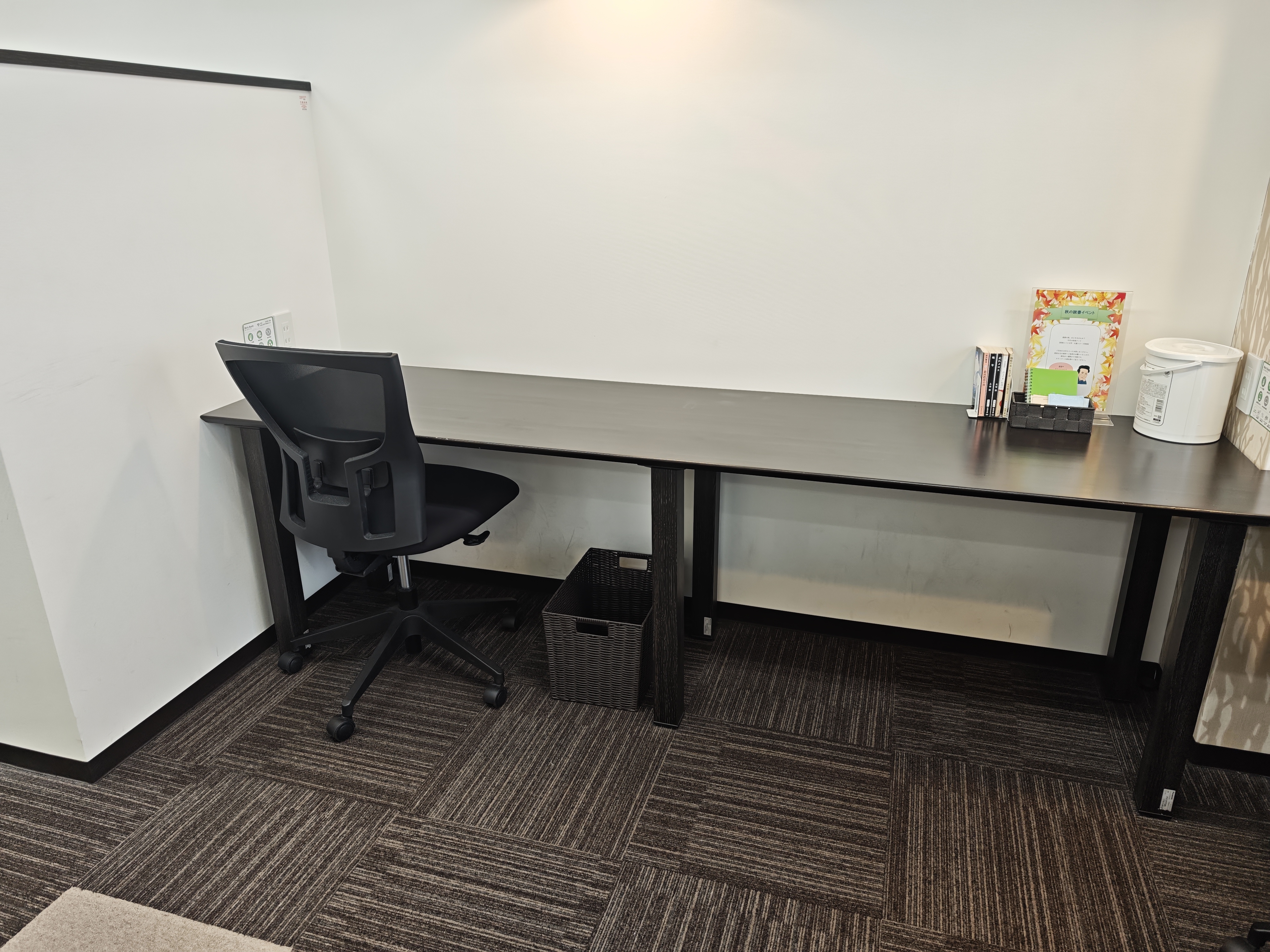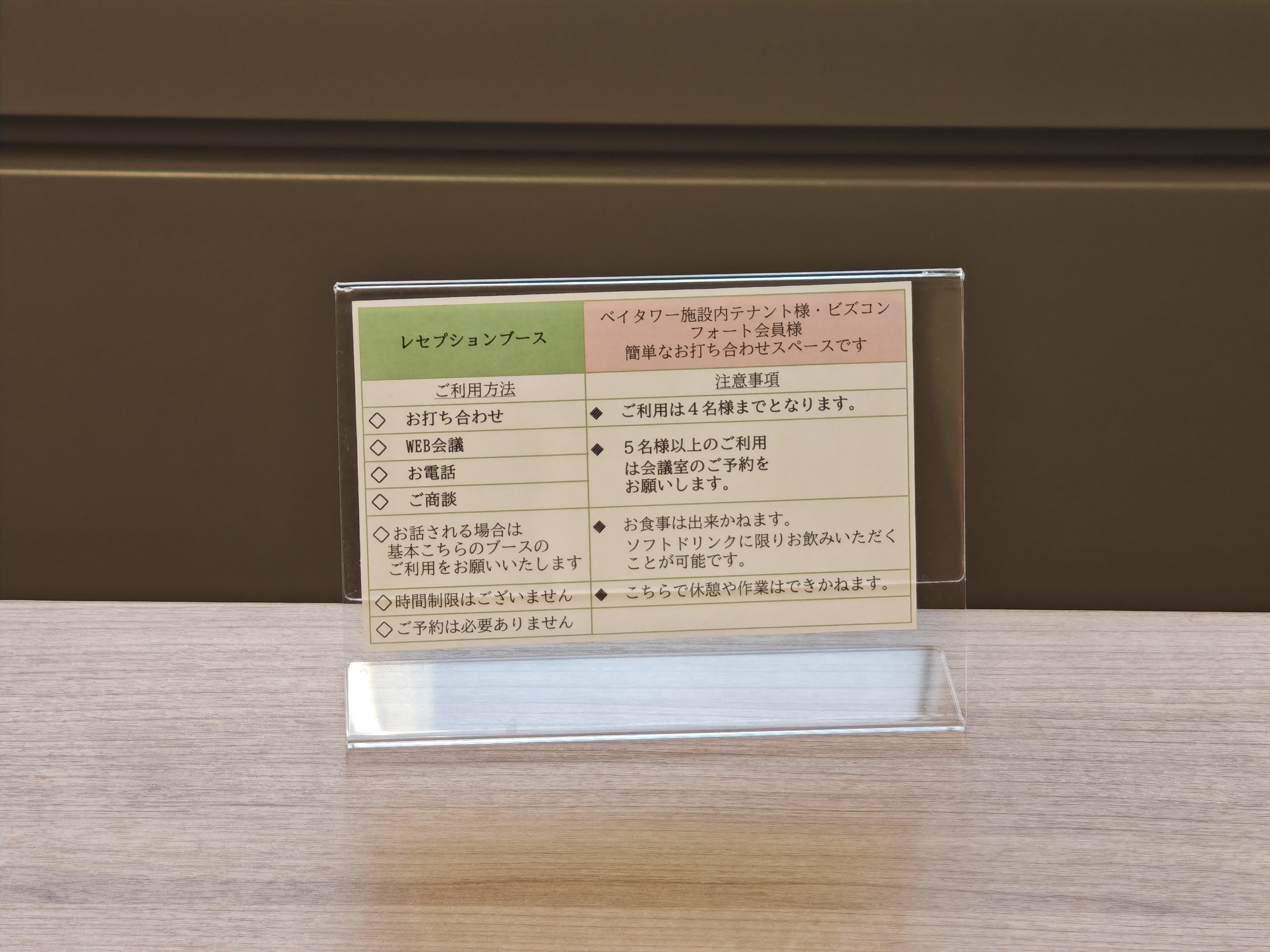 奥はレセプションブース。こちらは打ち合わせやWeb会議、電話などが可能ですが作業は出来ません。