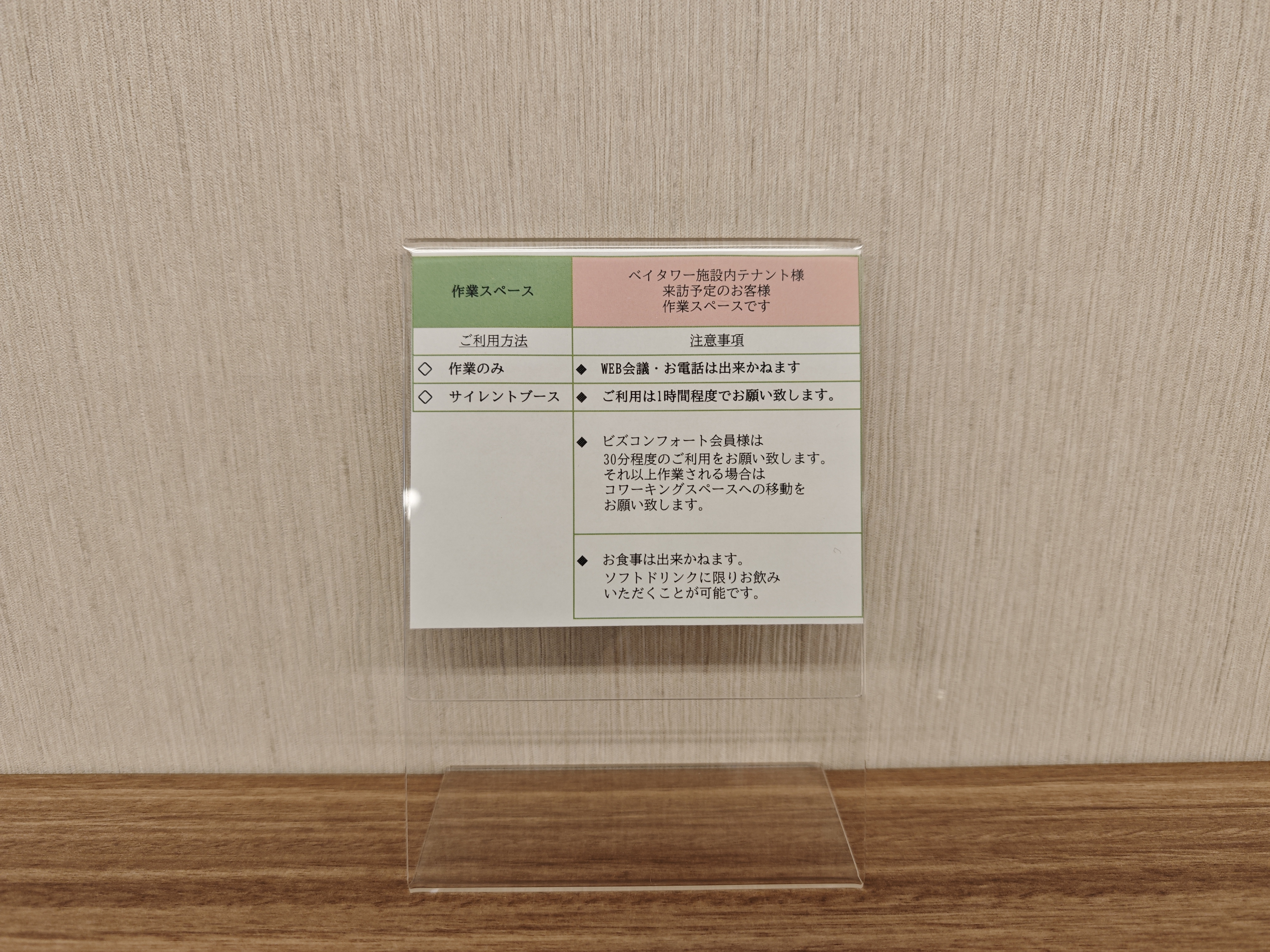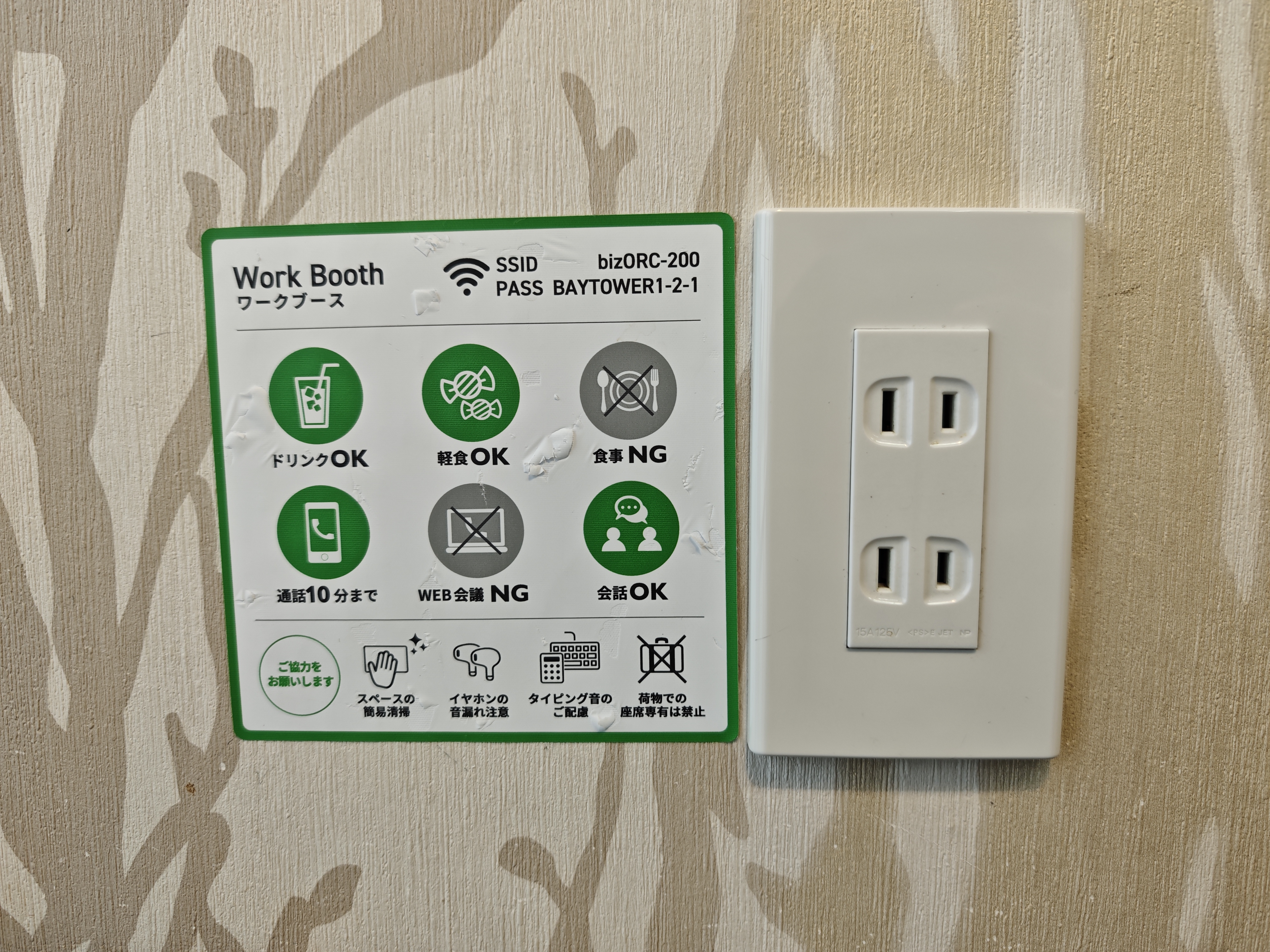 ワークブースは土日プラン2200円、全日プラン5500円などで利用可能です。