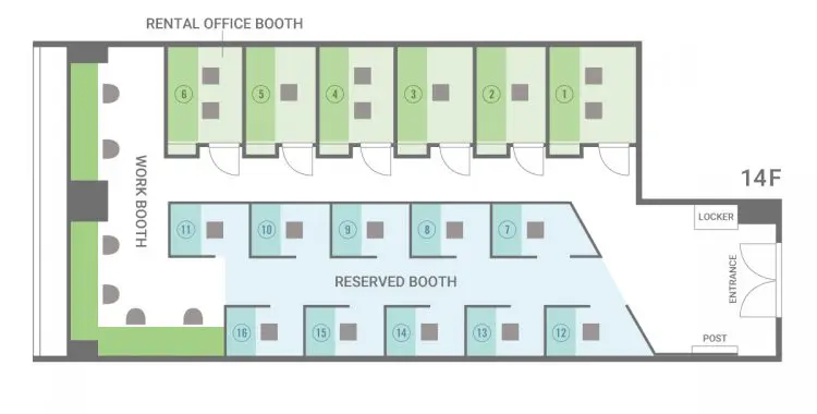 店内はフリースペースのワークブース、半個室のリザーブブース、完全個室のレンタルオフィスブースがあります。