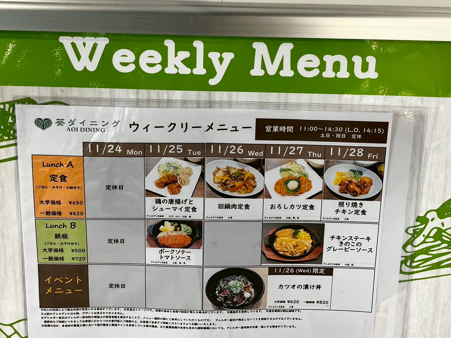 日替わりメニューやイベントメニューがあり、何度も足を運びたくなる食堂でした。大学関係者のみならず、近隣企業のサラリーマンなど多くの人に親しまれているようです。安くてボリューミーな食事が楽しめる「葵ダイニング」で、ぜひお気軽にランチタイムをお楽しみください。