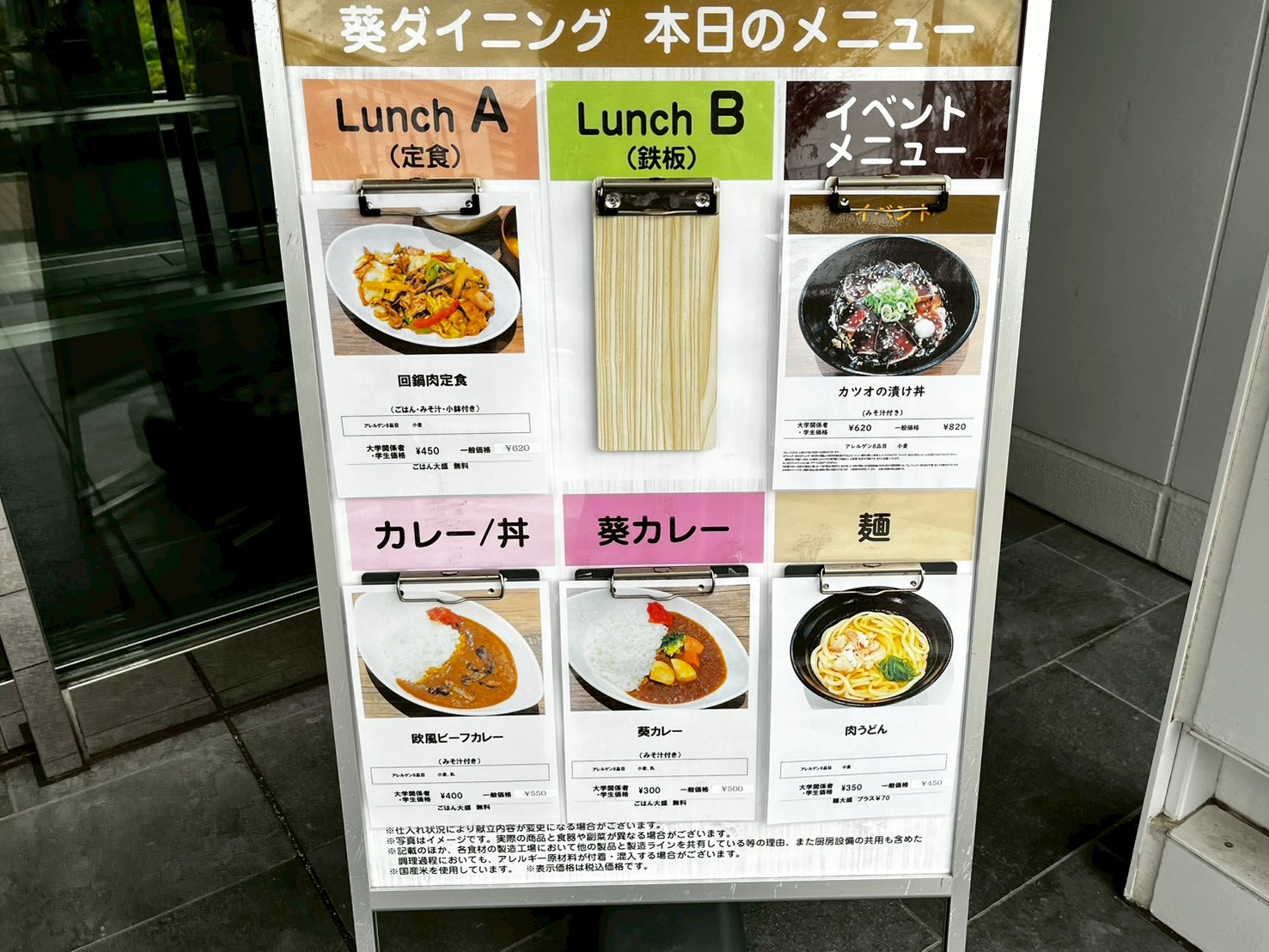 玄関前に本日のメニューが掲示されているので要チェックです。