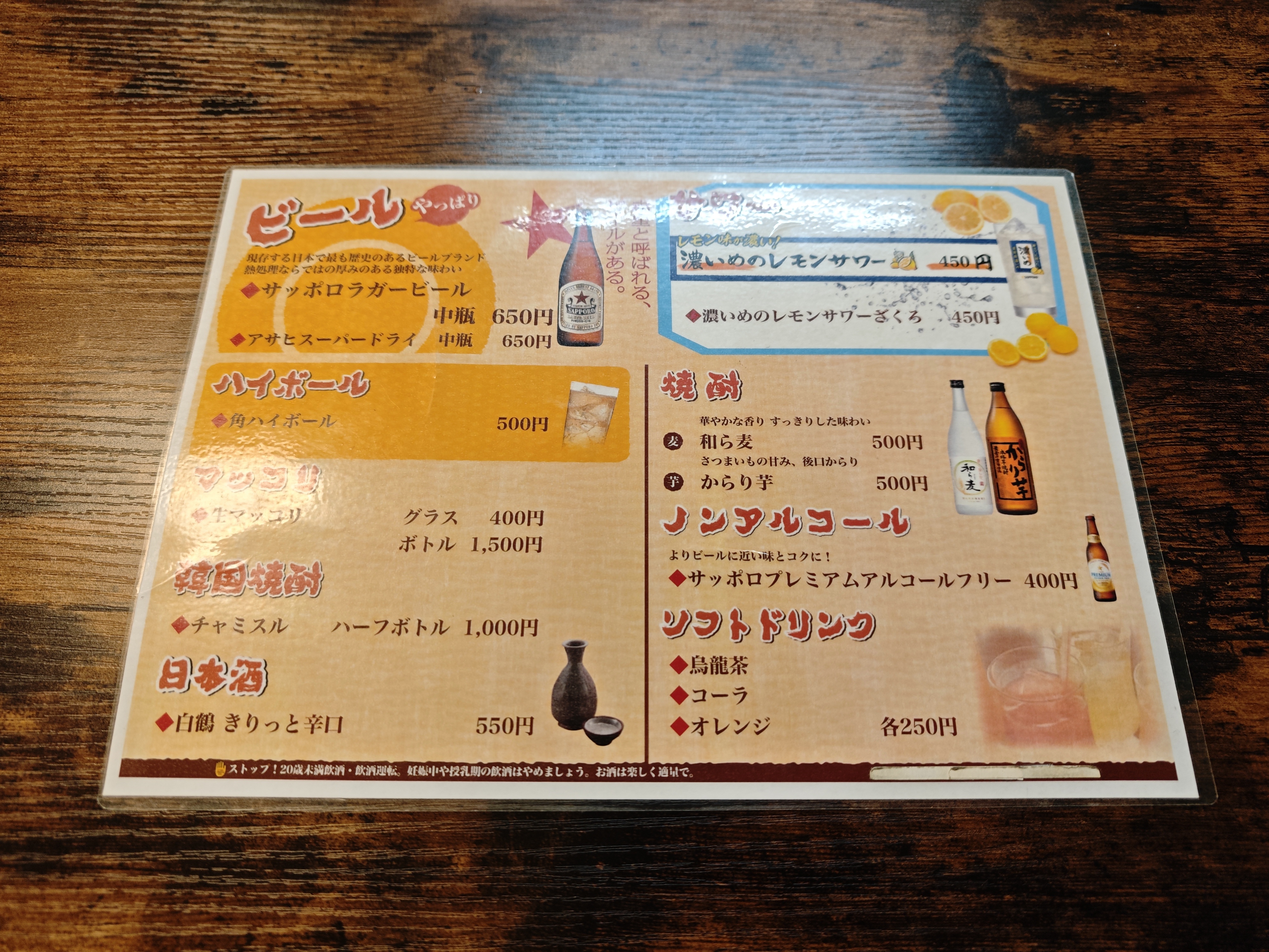 お酒は韓国焼酎やマッコリもあるので、朝潮橋にいながらプチ韓国旅行気分が味わえます。
