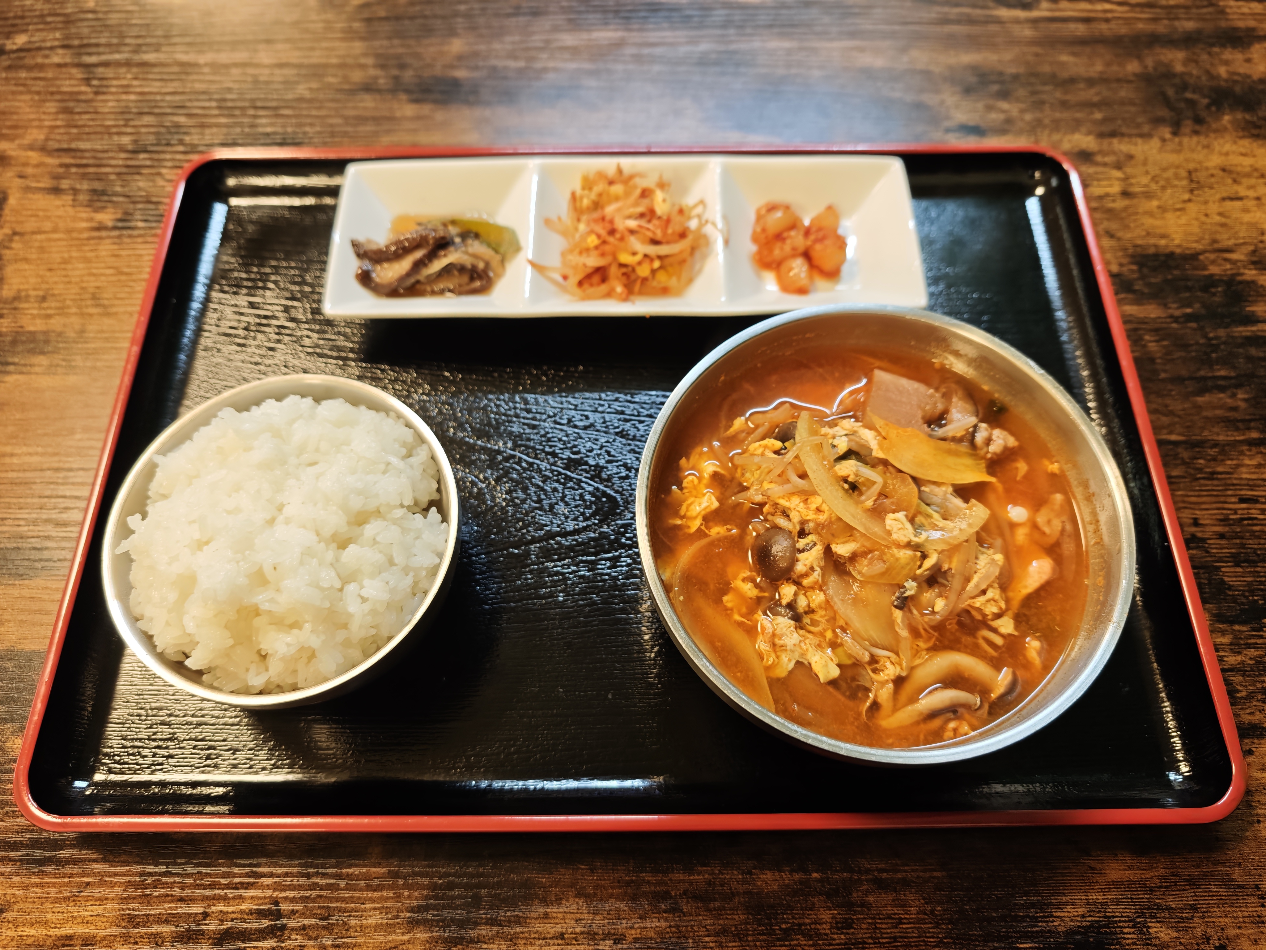 ランチにユッケジャン定食を頼みました。ユッケジャンとは、牛肉と野菜をコチュジャンや唐辛子で辛く煮込んだ韓国の旨辛スープ料理で、ご飯と小鉢がセットになっています。