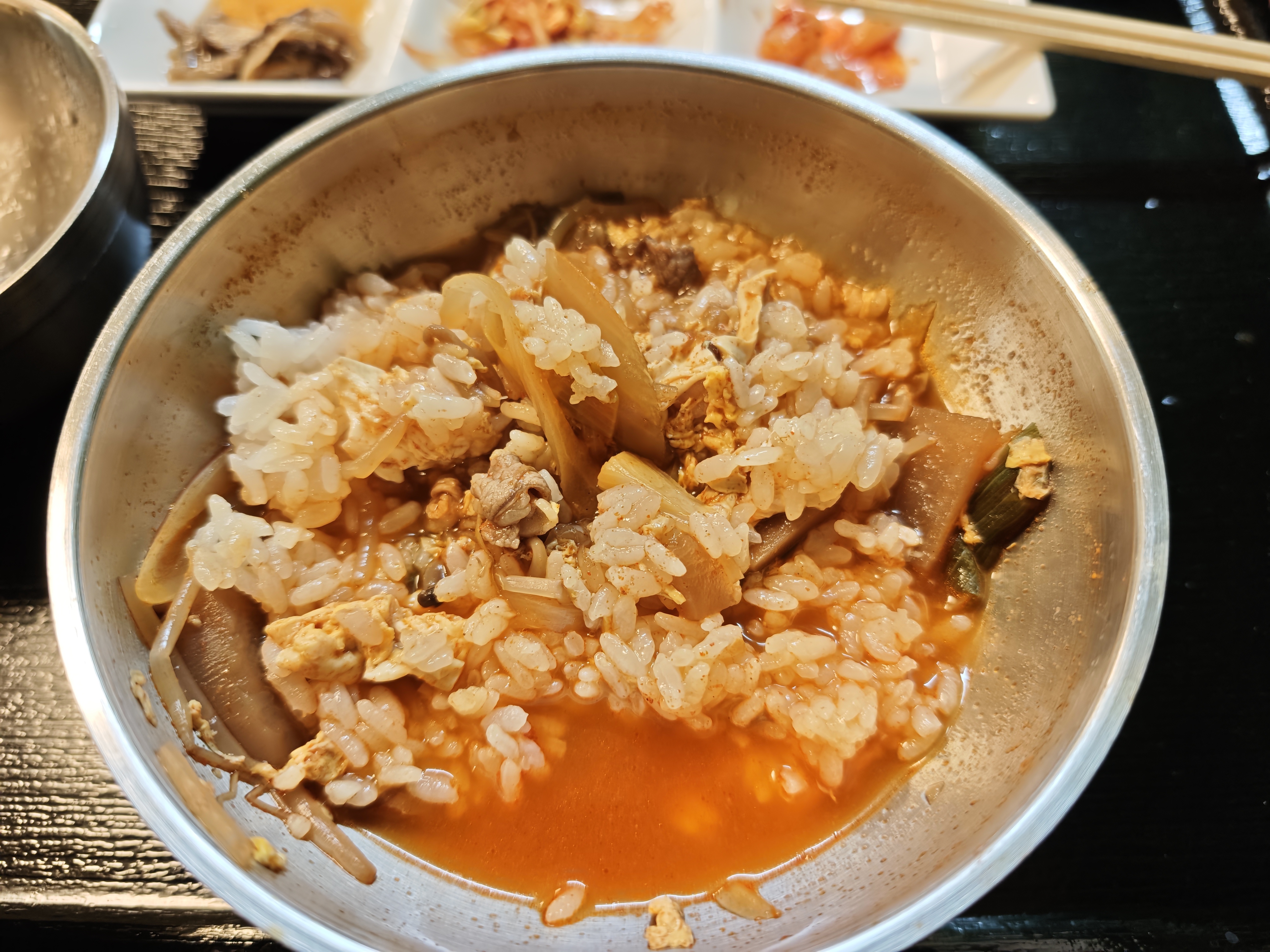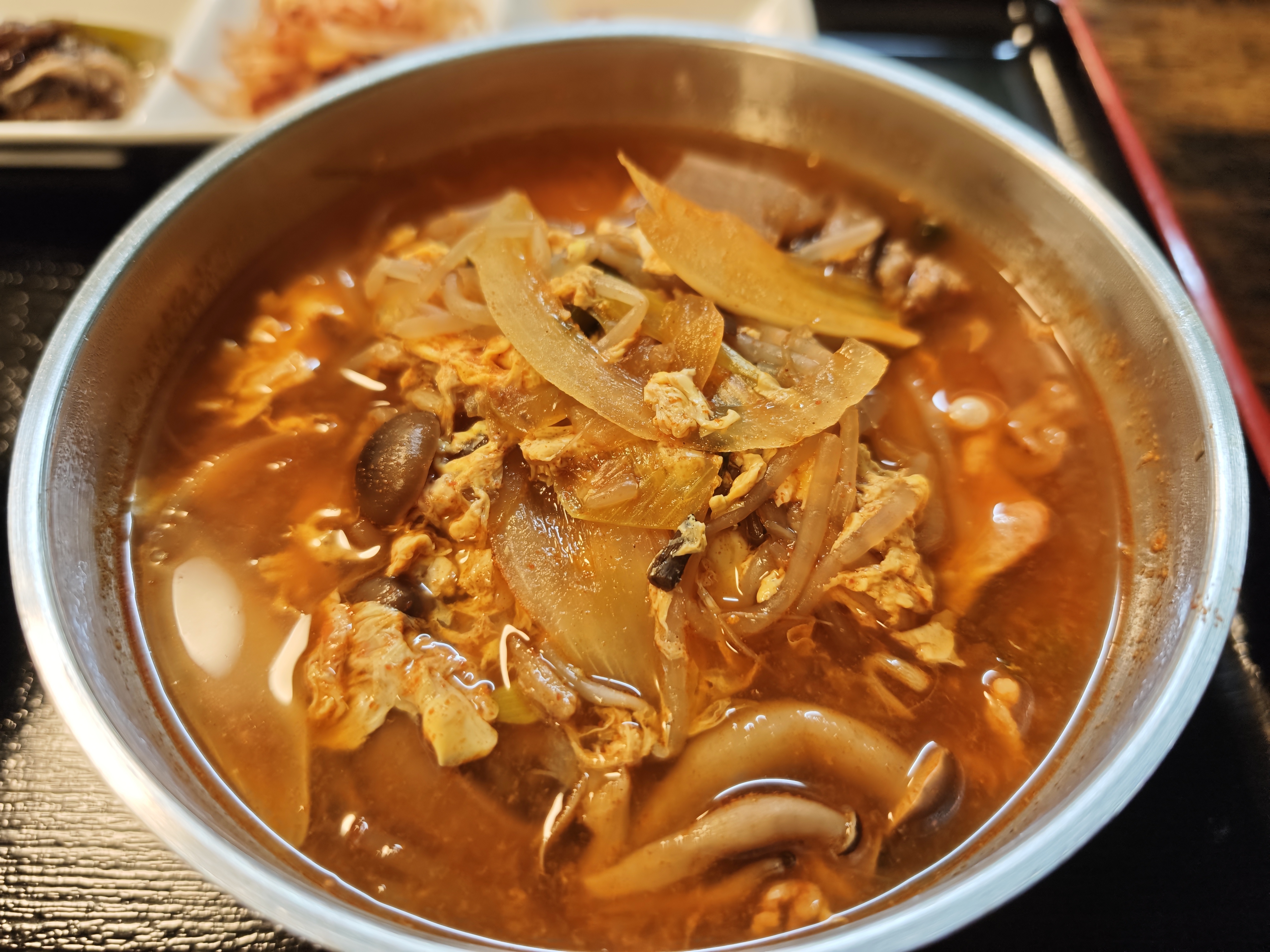 牛肉、玉ねぎ、もやし、ぶなしめじを煮込んで、卵で綴じられたユッケジャンは、辛味の中にも旨みがあり、とても食べやすく美味しいスープでした。