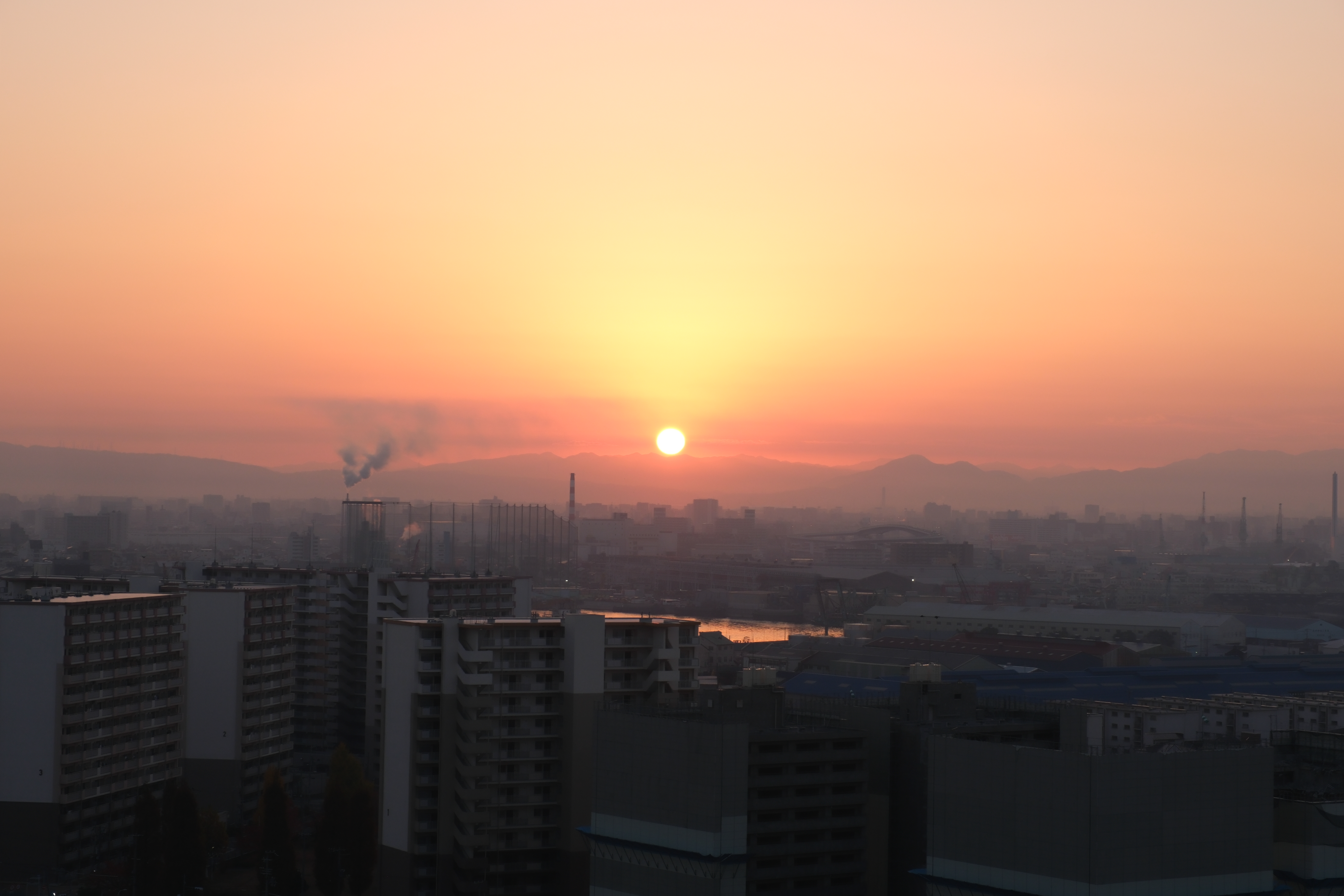 マンションとマンションの間から日の出が登ります。