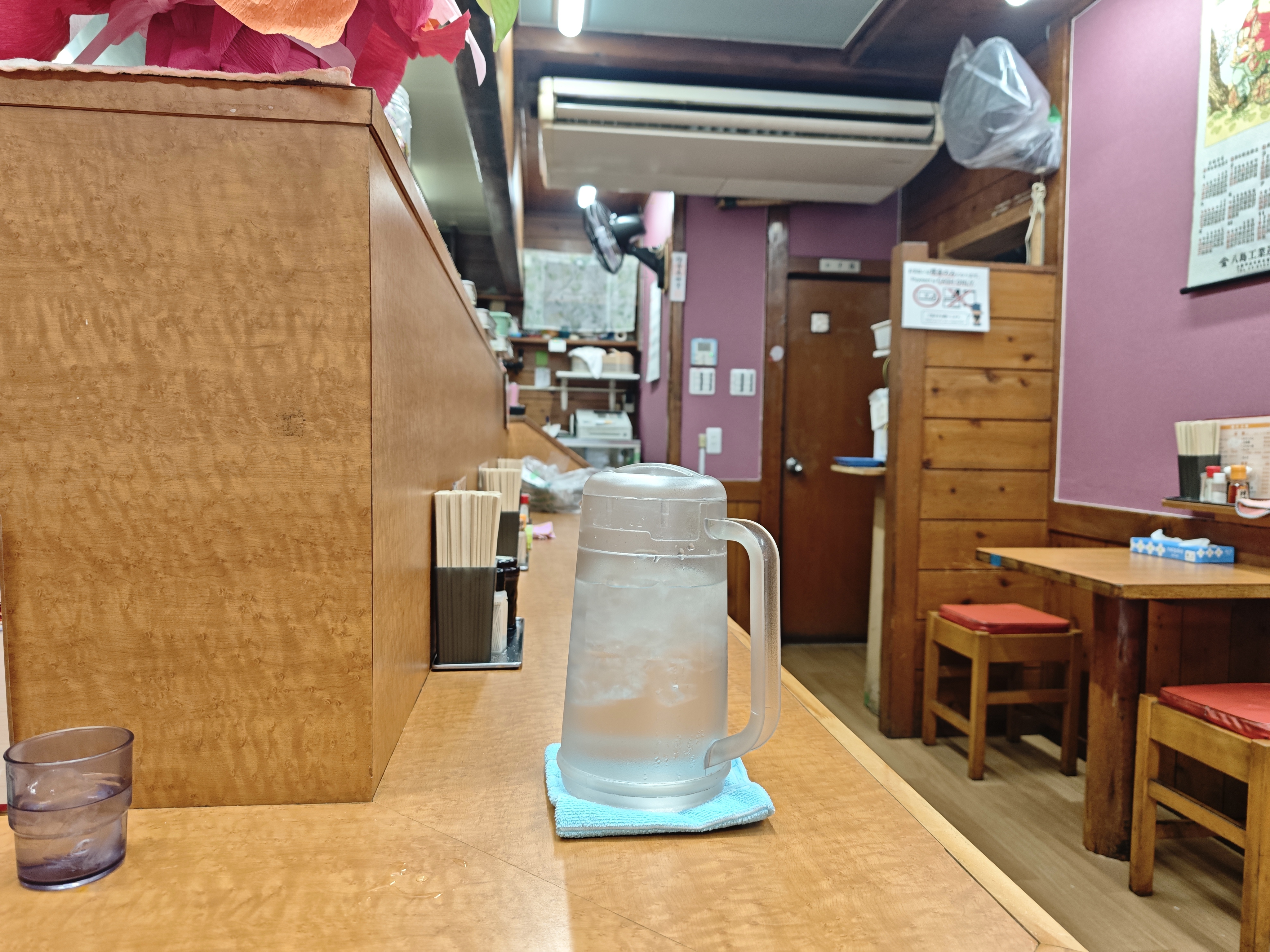 各座席に冷えた水と調味料が置いてあります。