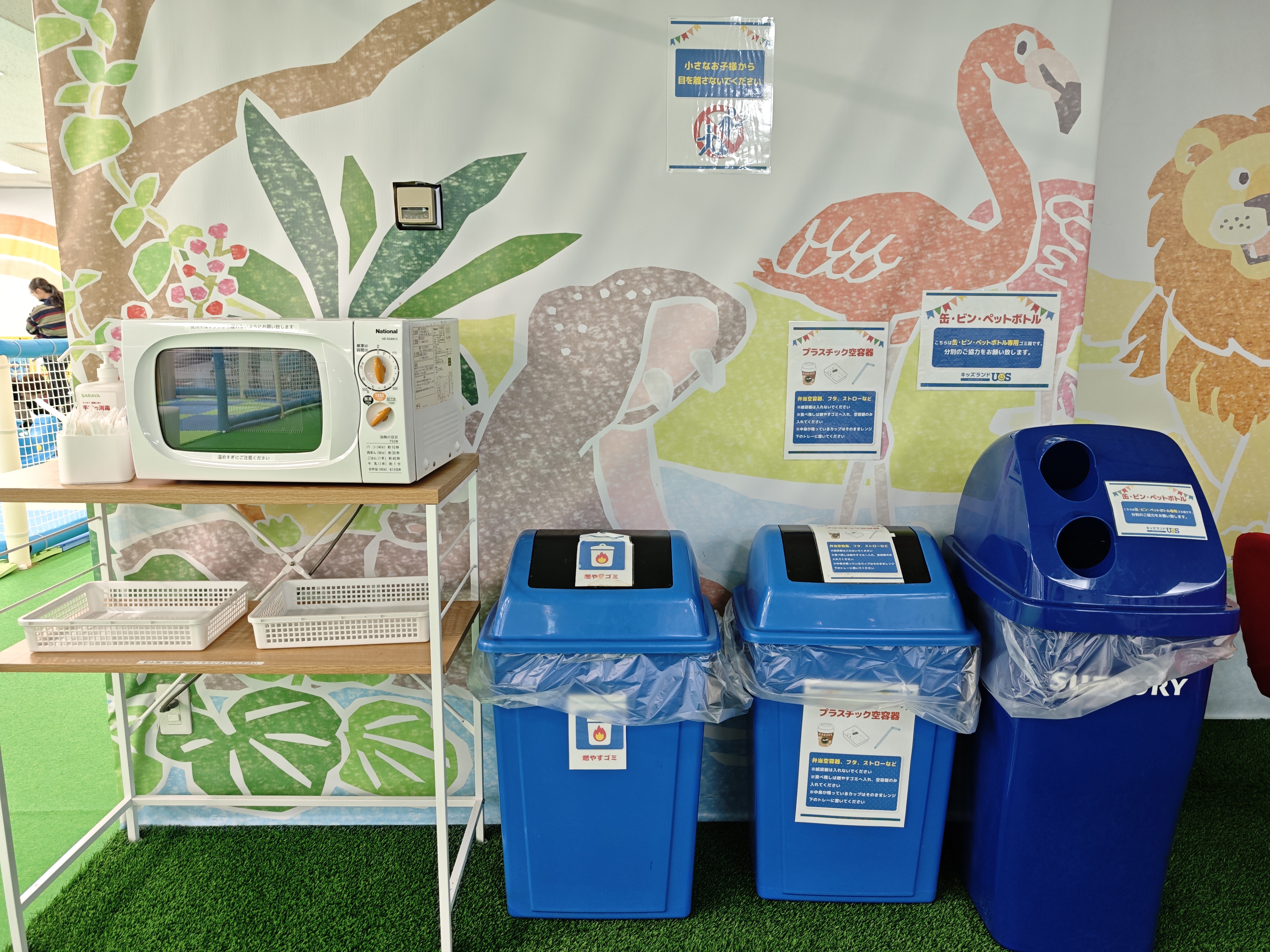 レンジやお手拭き、ゴミ箱も用意されています。