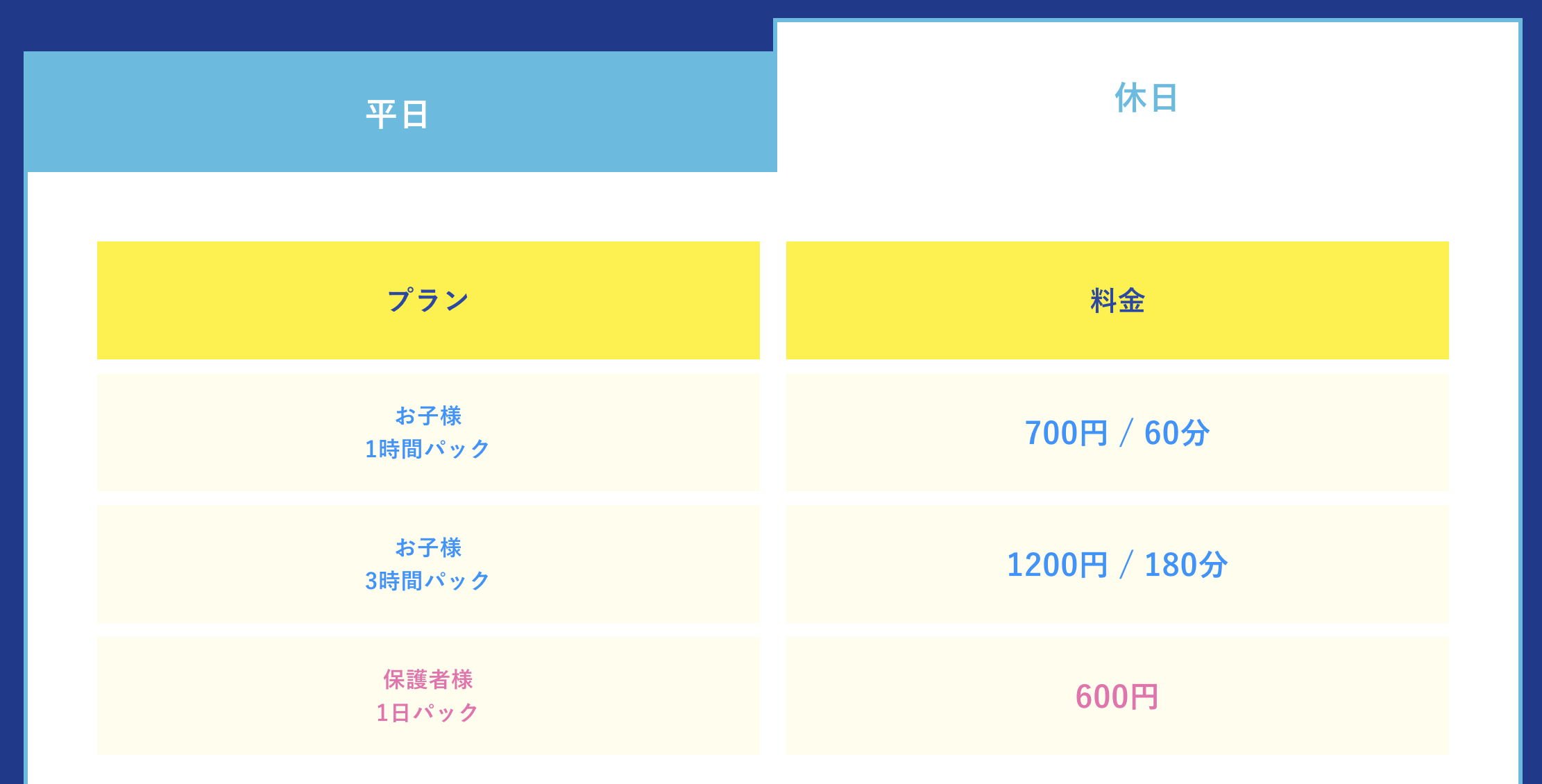 平日と休日で滞在可能時間と料金が変わります。