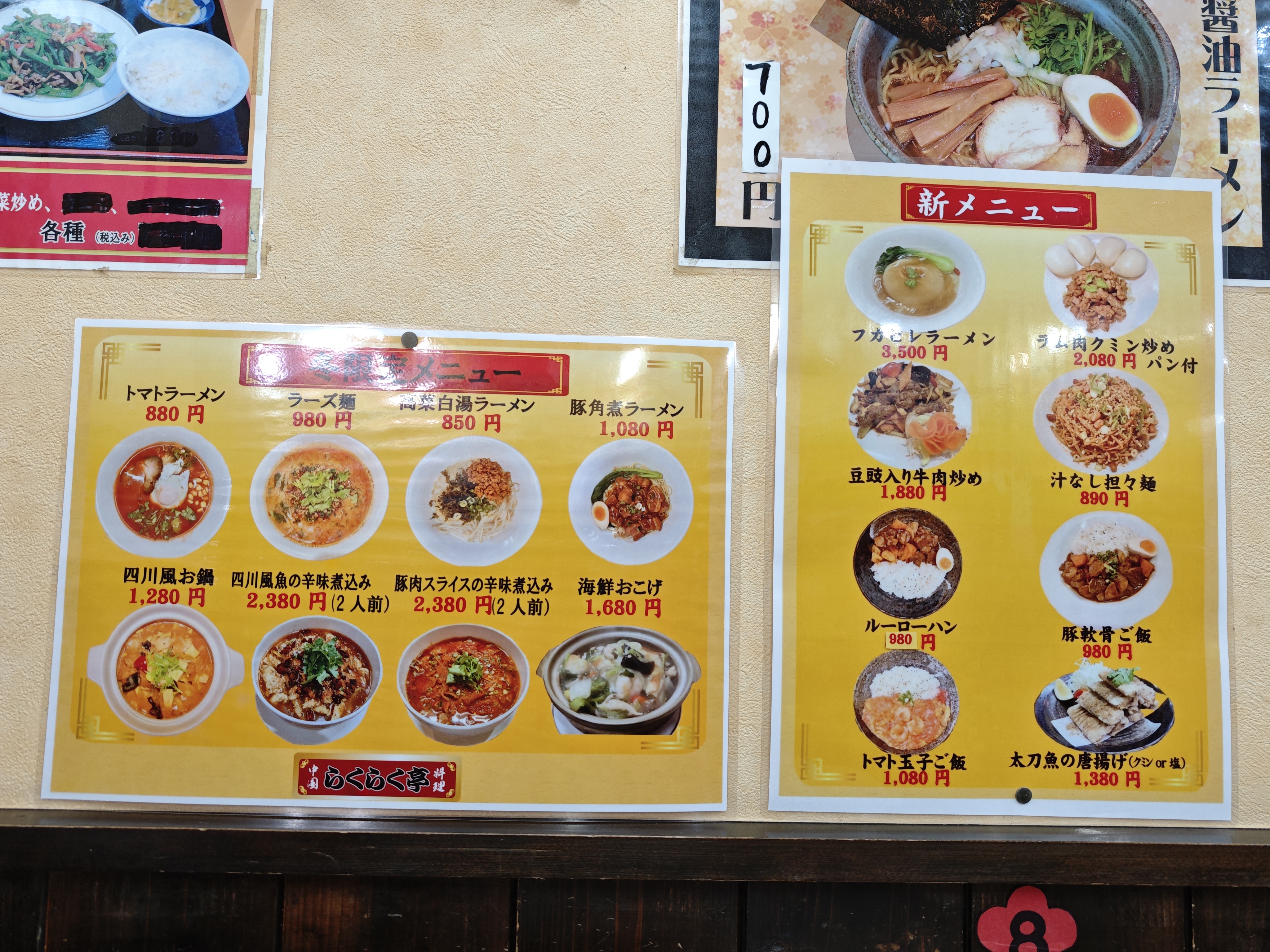 赤く大きな看板に、これでもかという位メニューが貼られていてとても目立つ外観です。