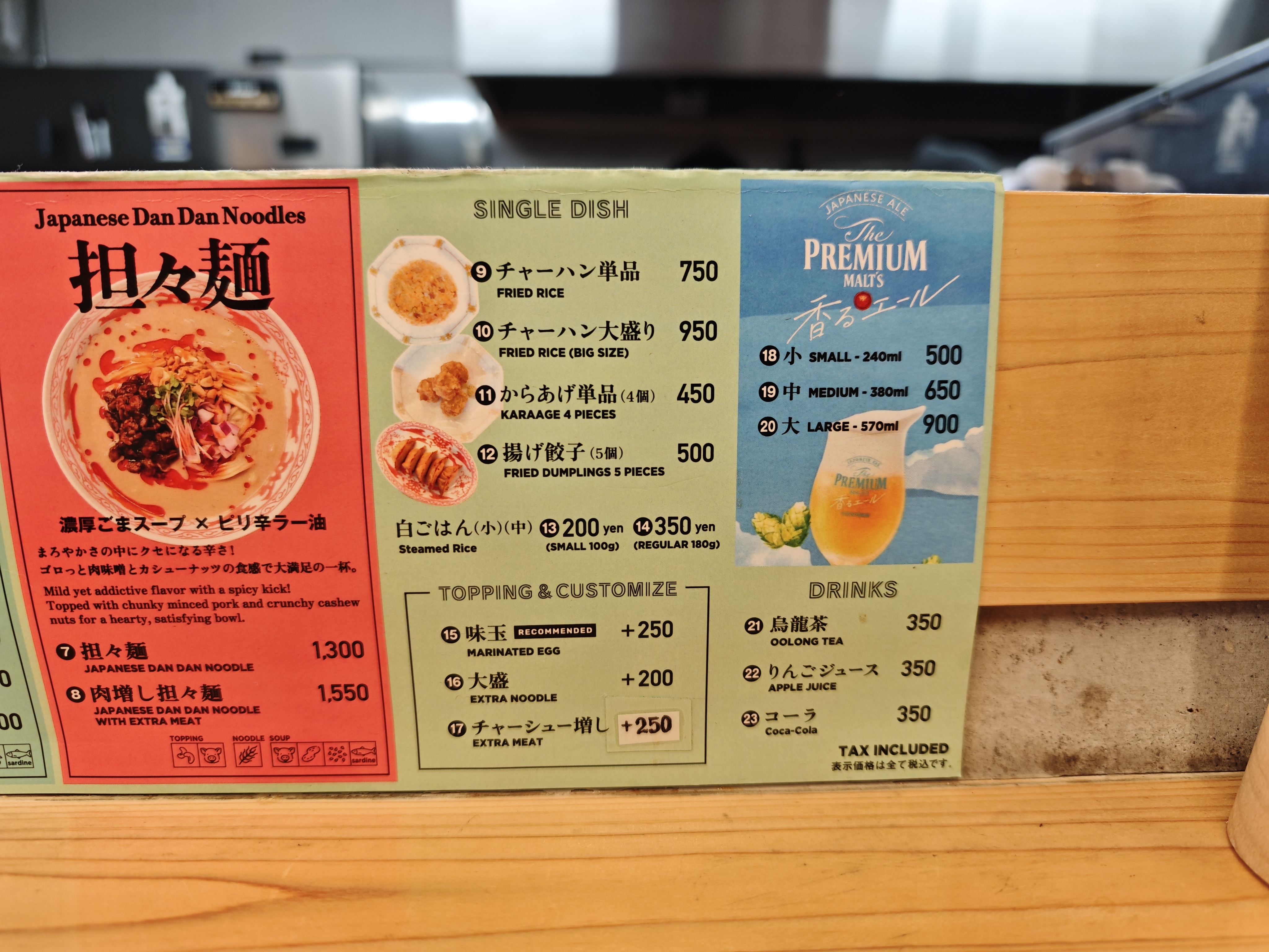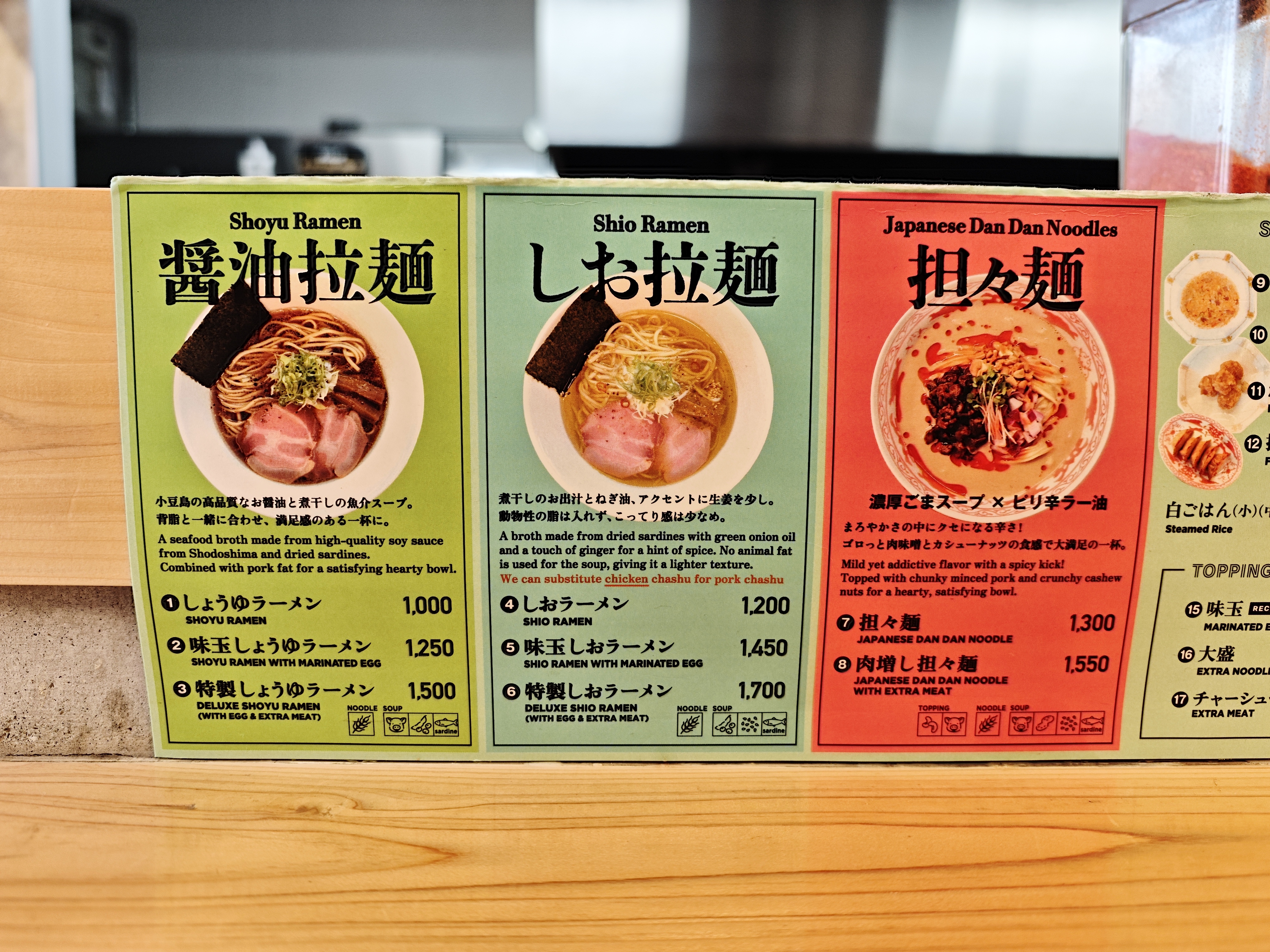 ラーメンの味は、醤油、しお、担々麺の3種類。