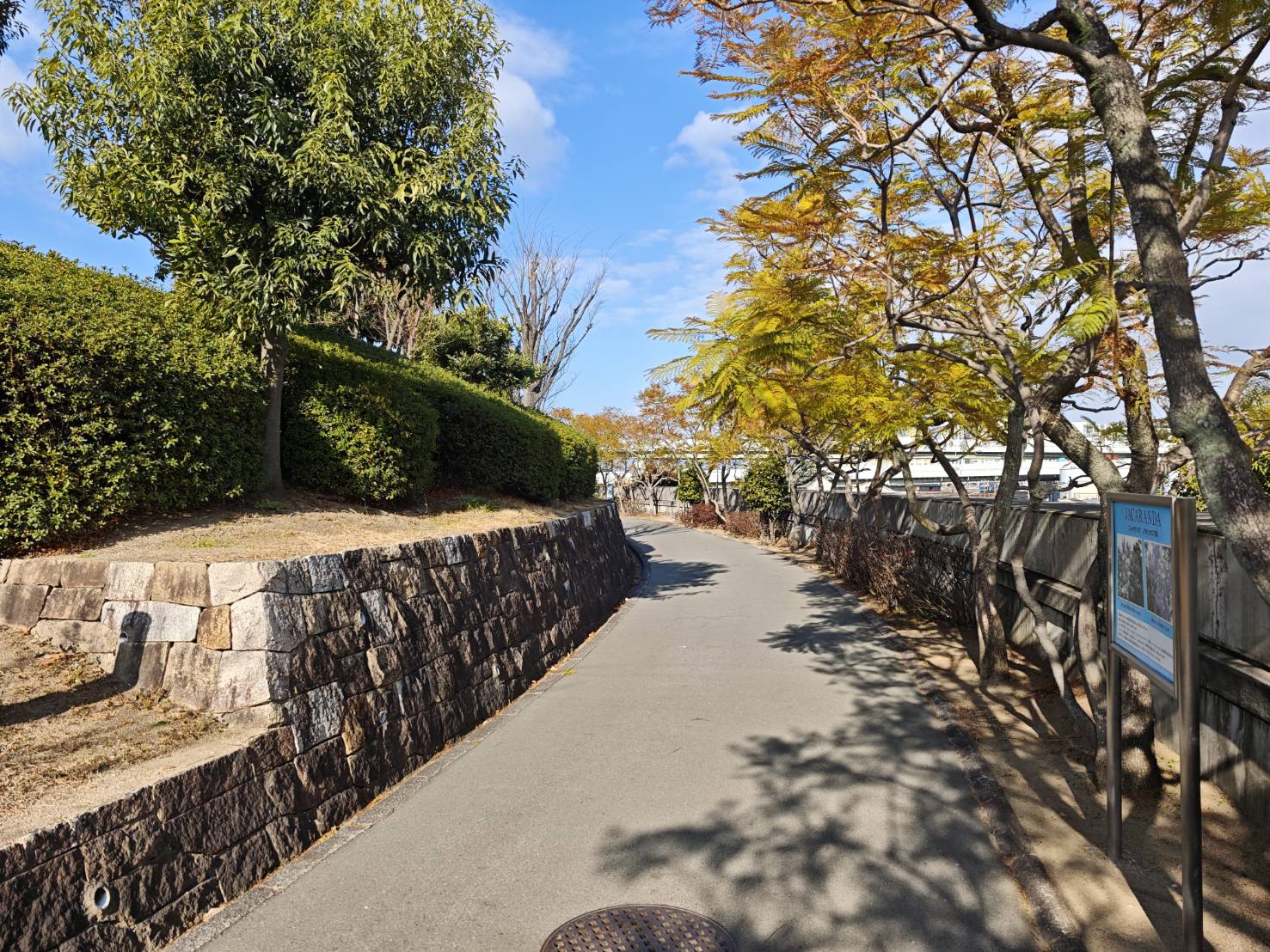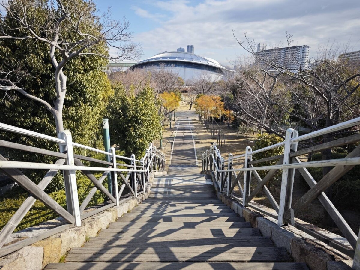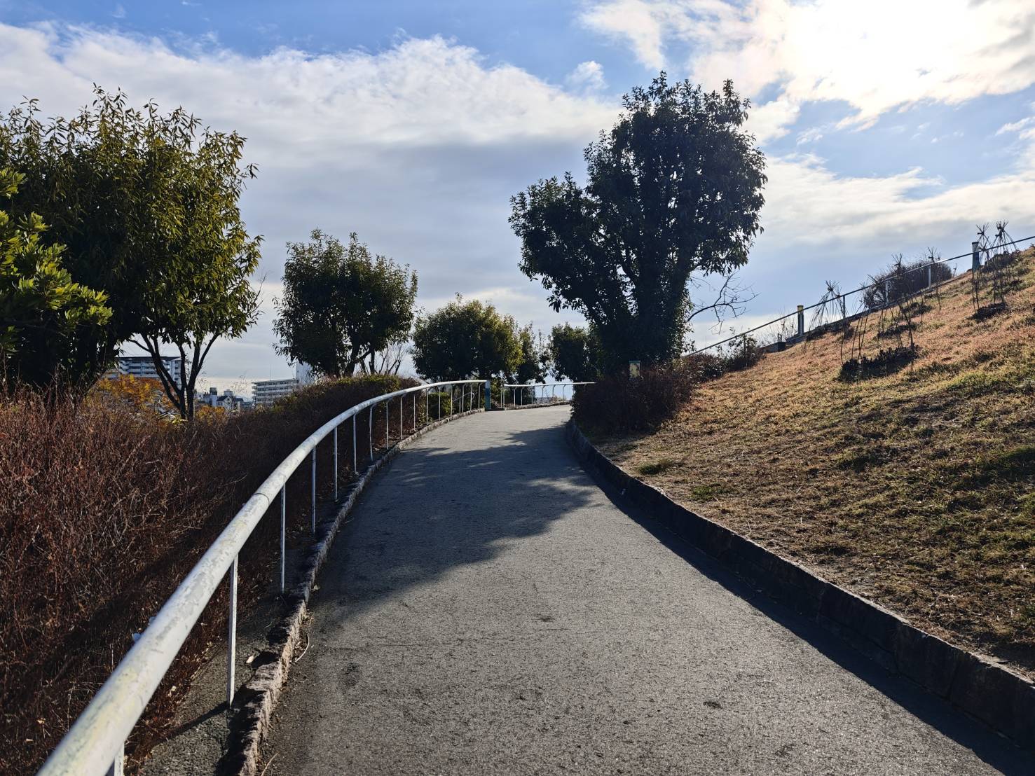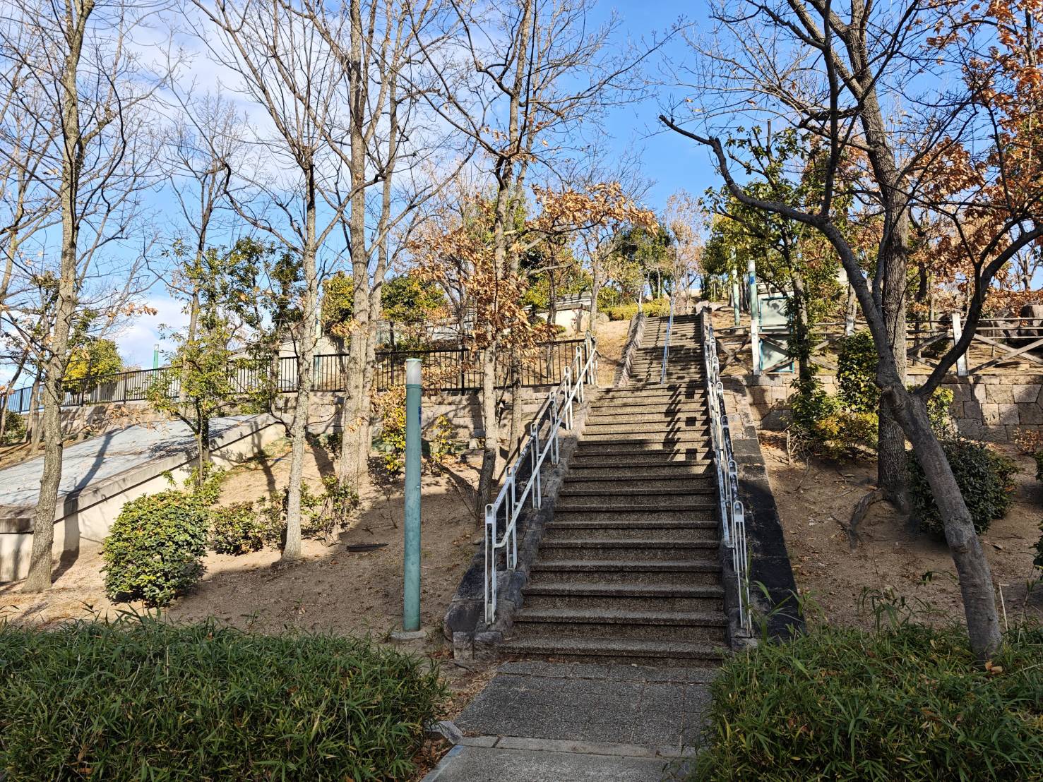 八幡屋公園には丘があり、頂上までには階段や坂道のコースがあります。