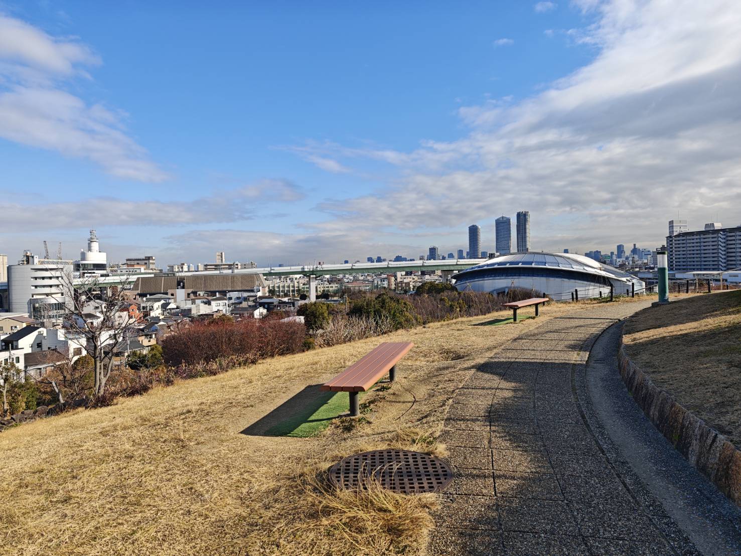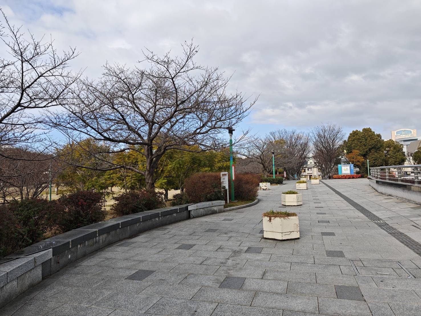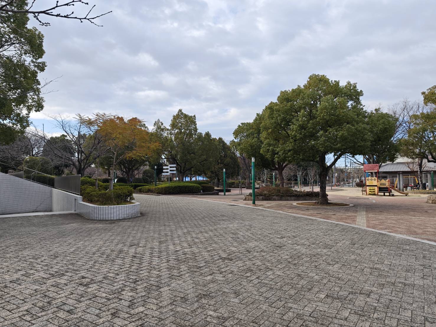 八幡屋公園には丘があり、頂上までには階段や坂道のコースがあります。