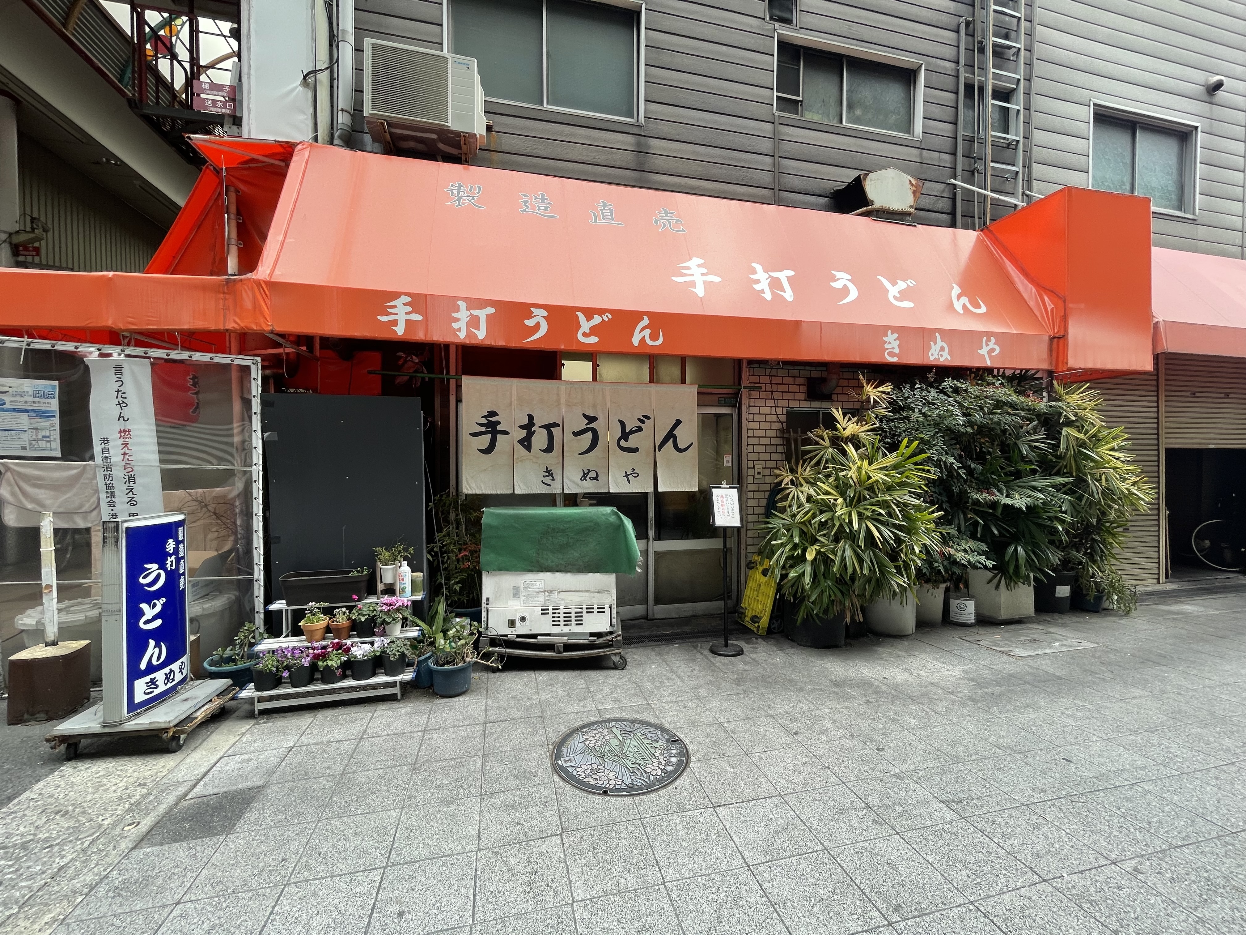 弁天町駅から徒歩10分程の場所にある繁栄商店街の入り口にあるのが、創業50年の地元から愛される「手打ちうどん きぬや食堂」