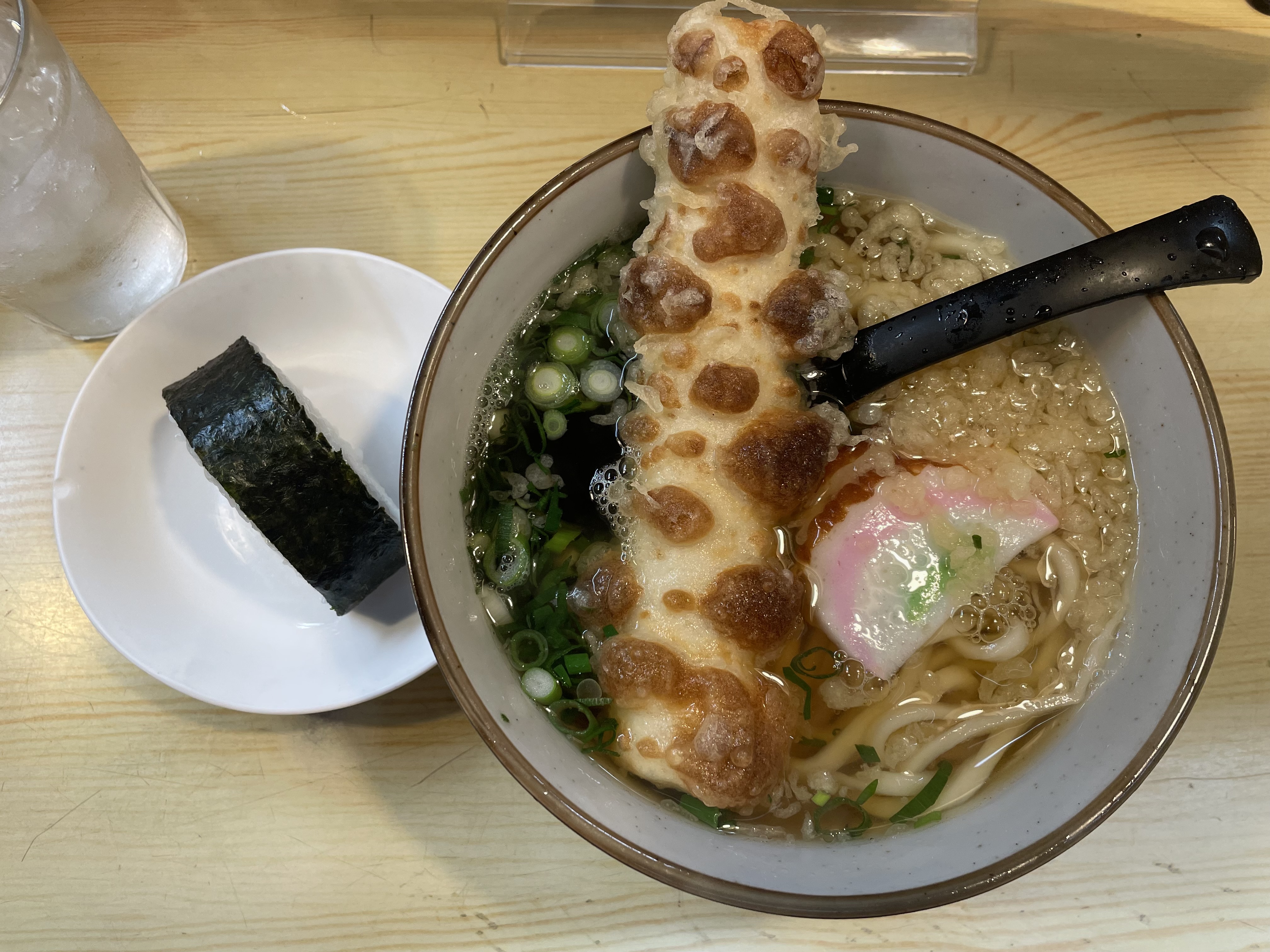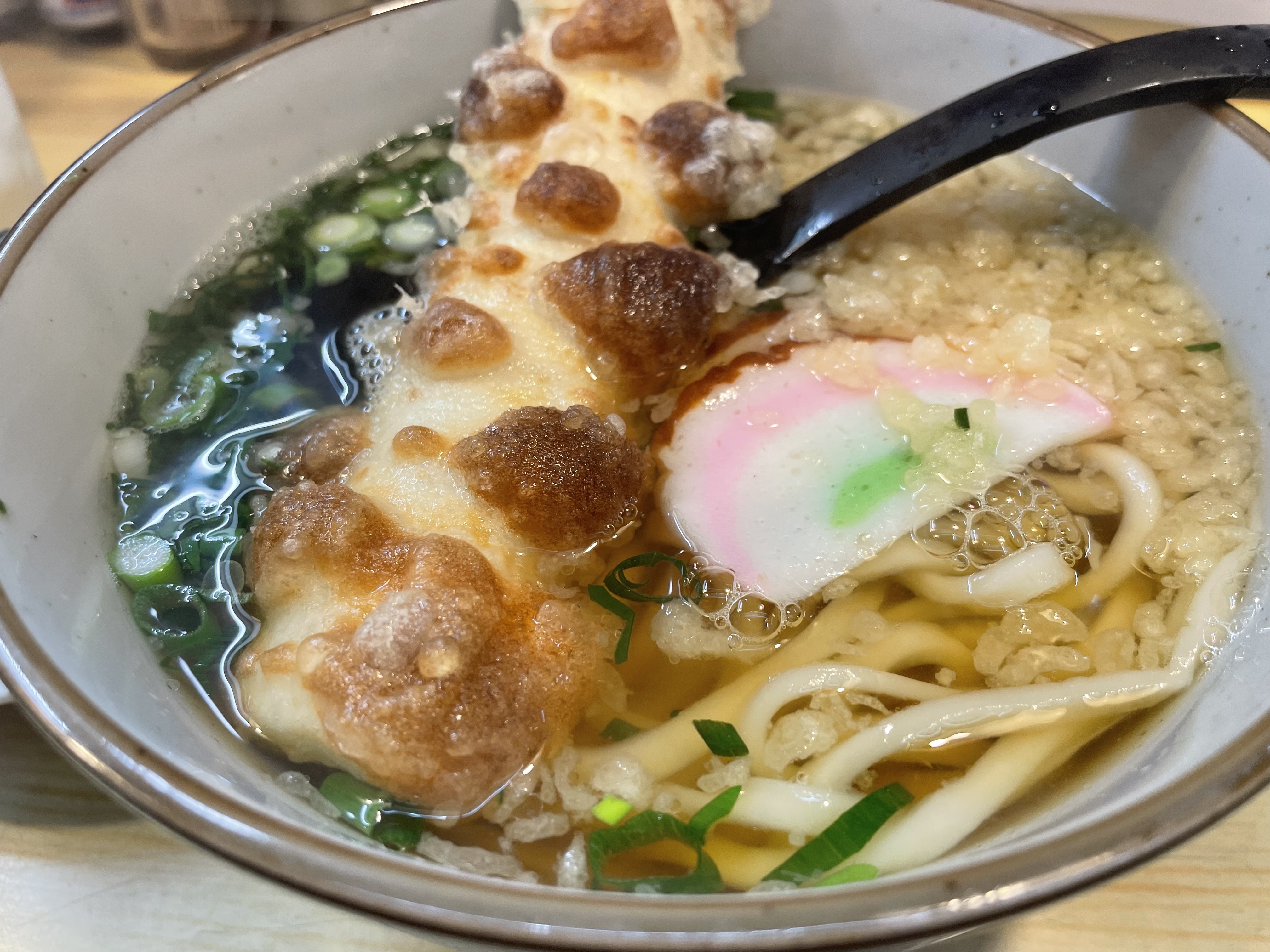 優しいお出汁はずっと飲んでいたい、そんなお味です。大阪のうどんはやはりお出汁が決め手ですよね。うどんは少し細め。どこか懐かしい、まさに大阪のうどんです。天かすが入っているのも個人的に嬉しいポイント。