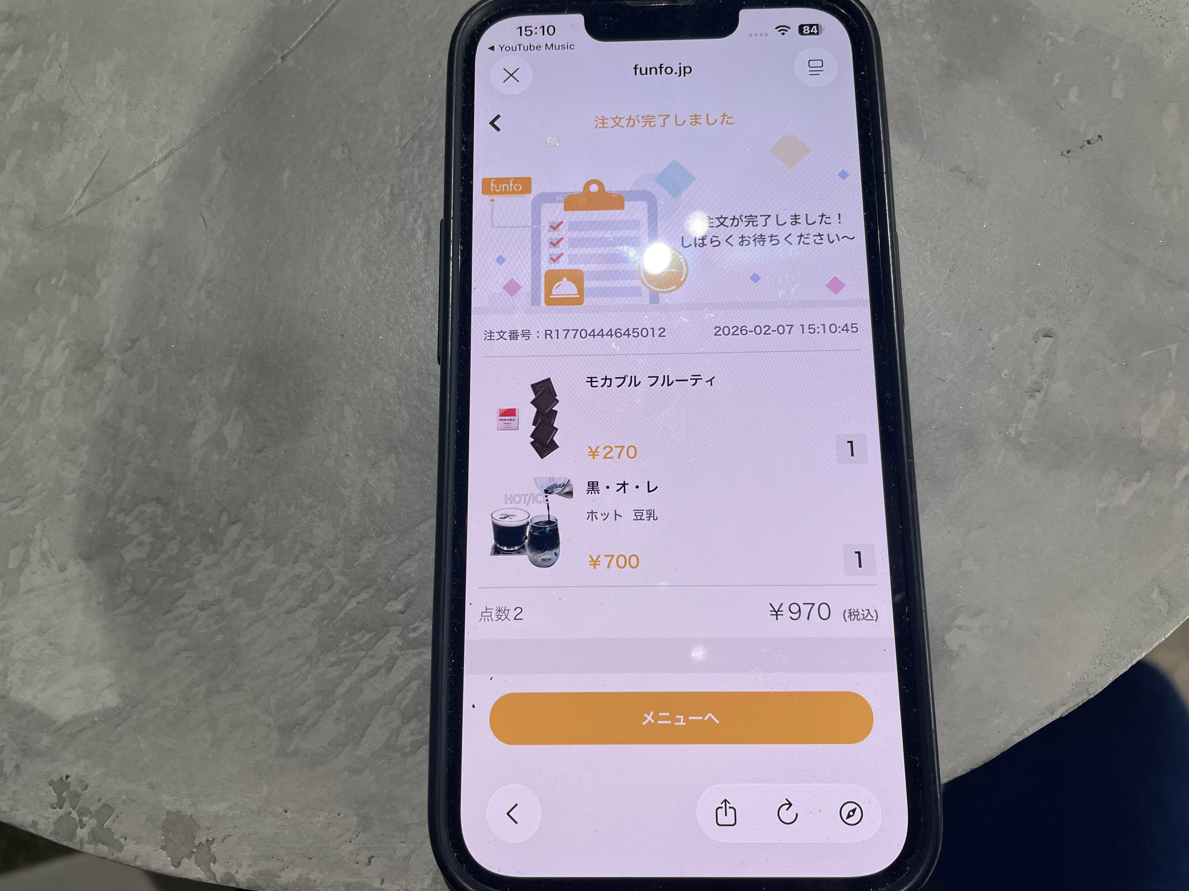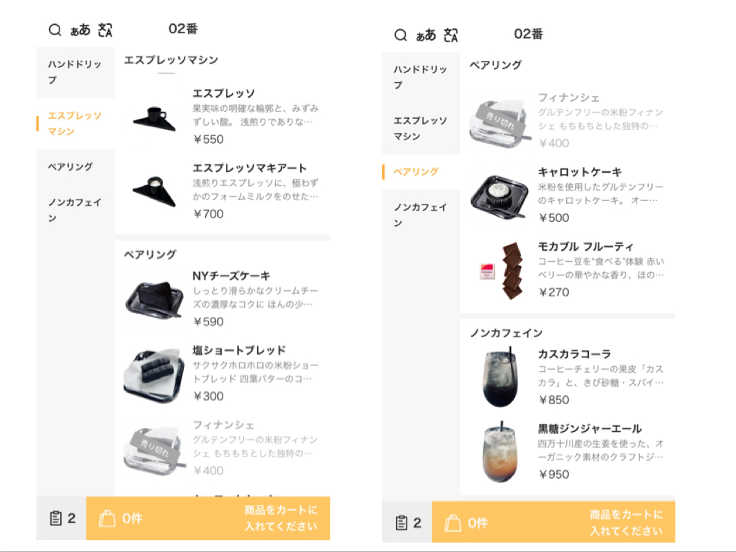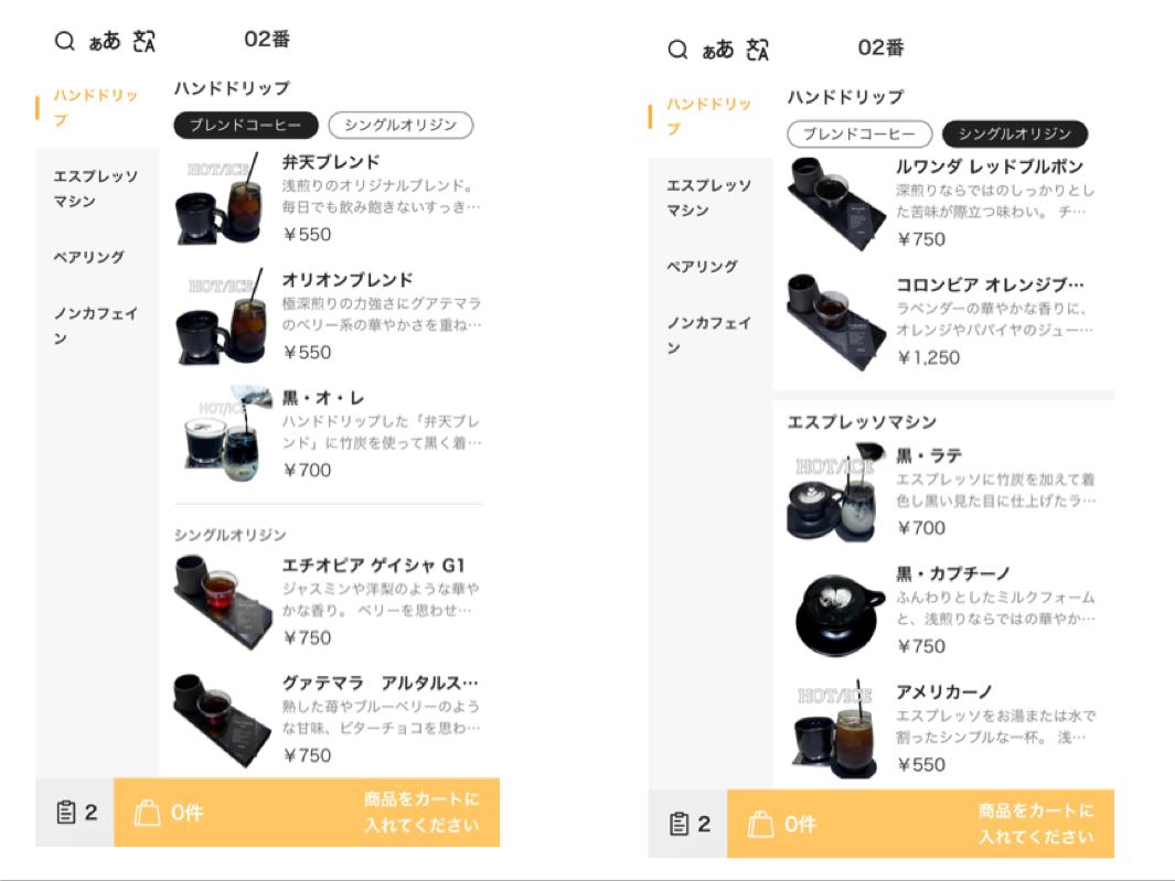 モバイルオーダー画面はこんな感じです。オリジナルブレンドや普通のコーヒーも良いですが、こだわり満載の竹炭を使用した黒いコーヒーが非常に気になります。