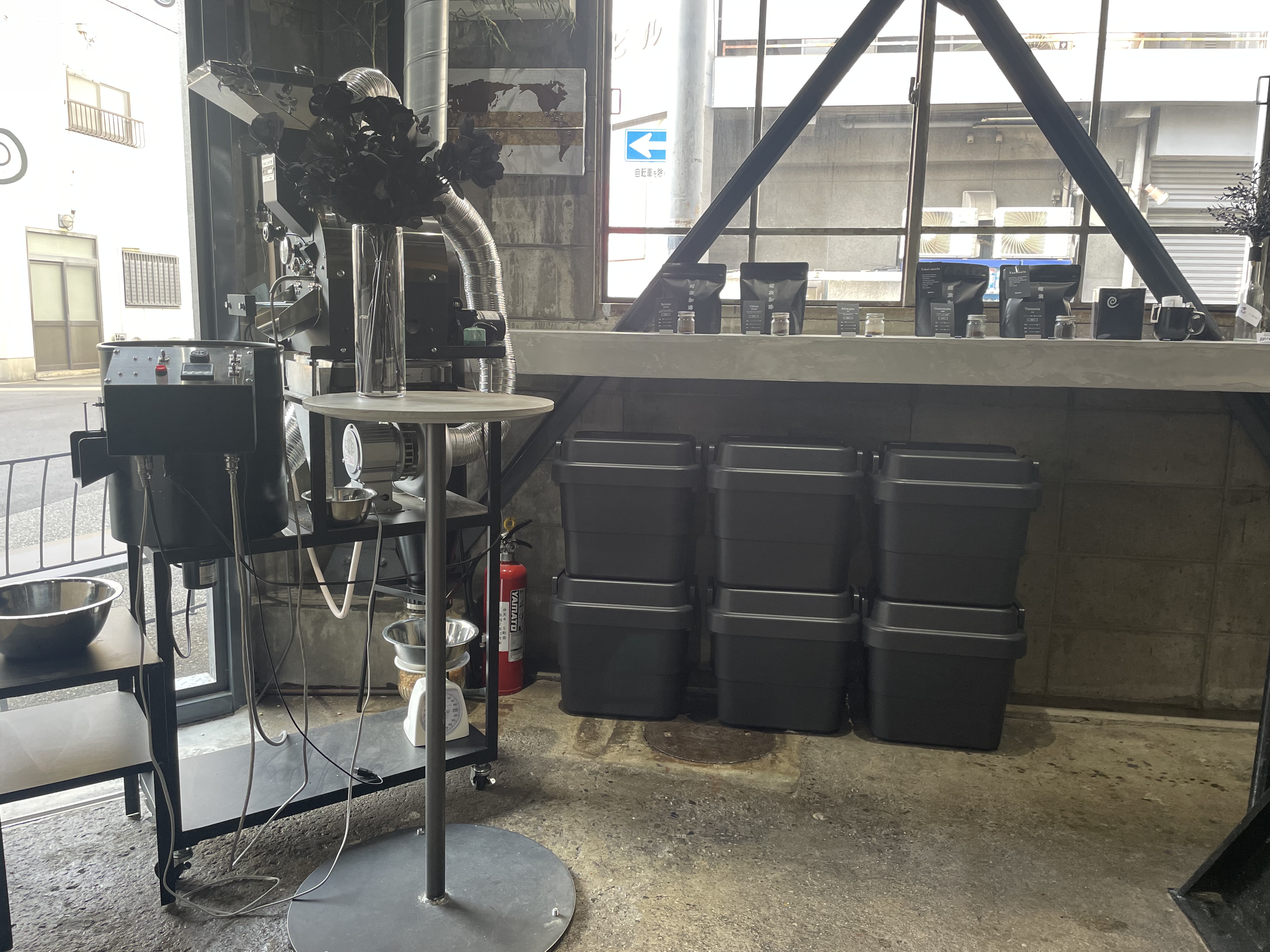 焙煎の機械でしょうか。置かれている物は全て黒で統一されたデザインがカッコよく、オシャレ感が増しております。