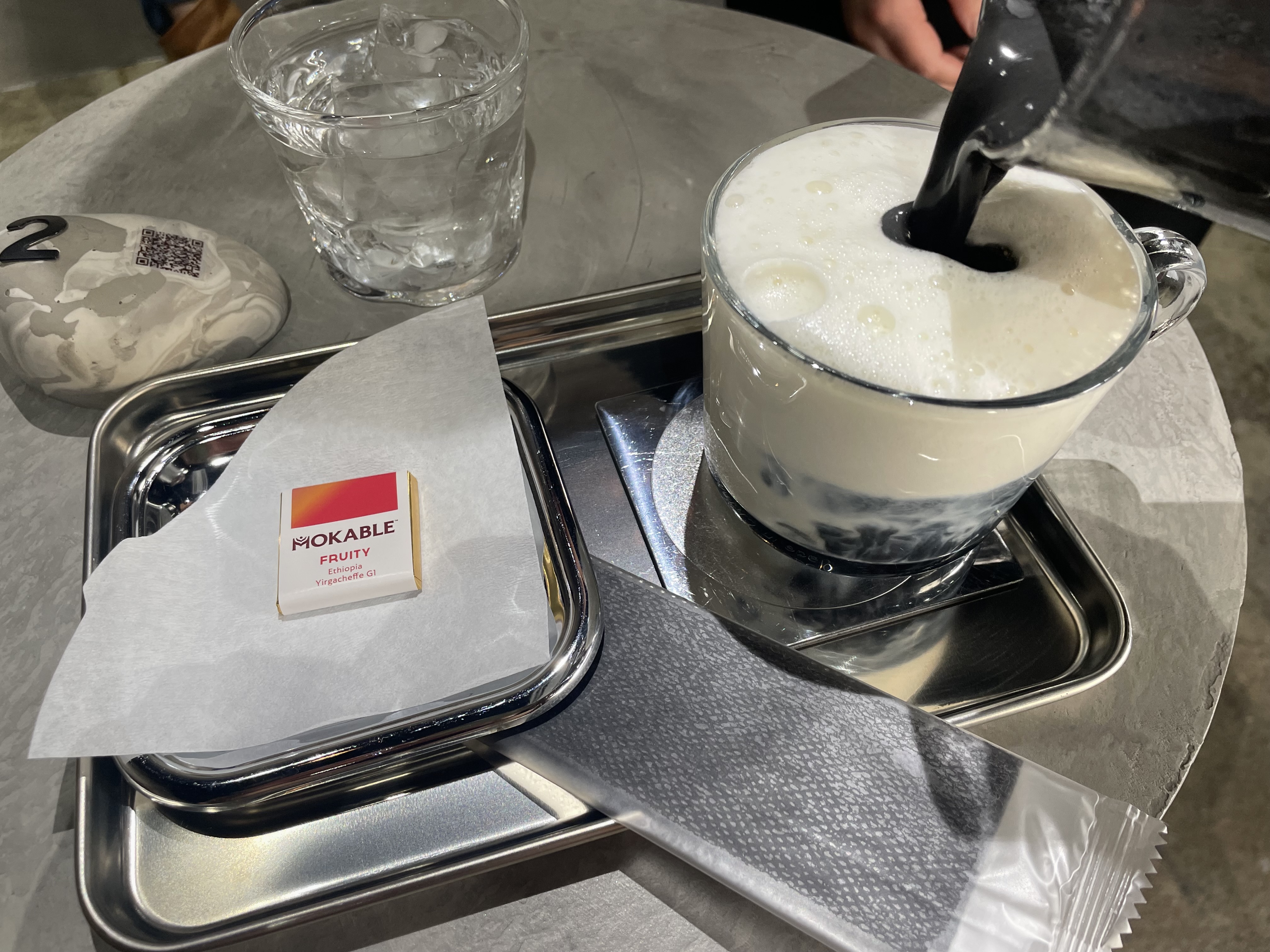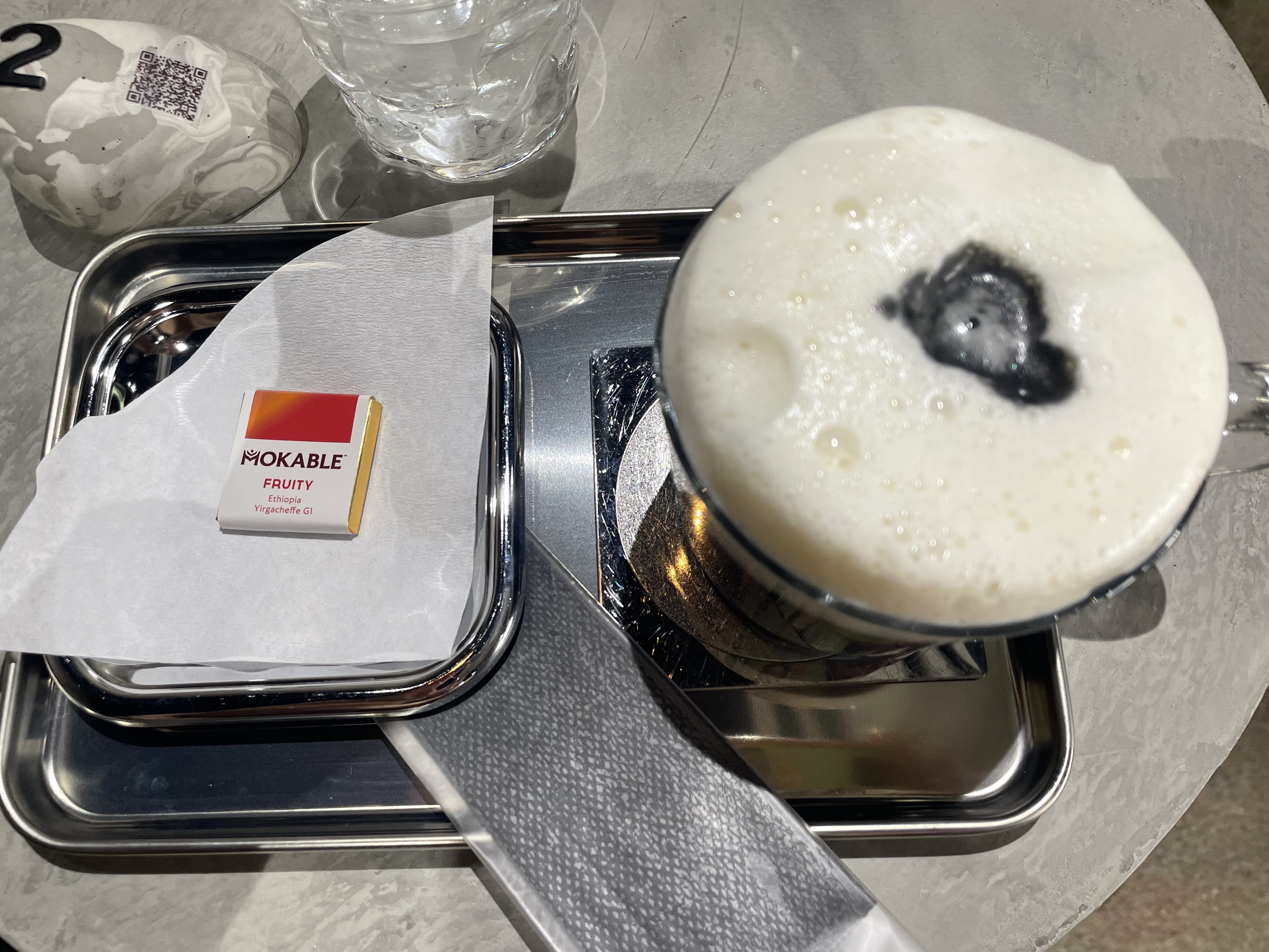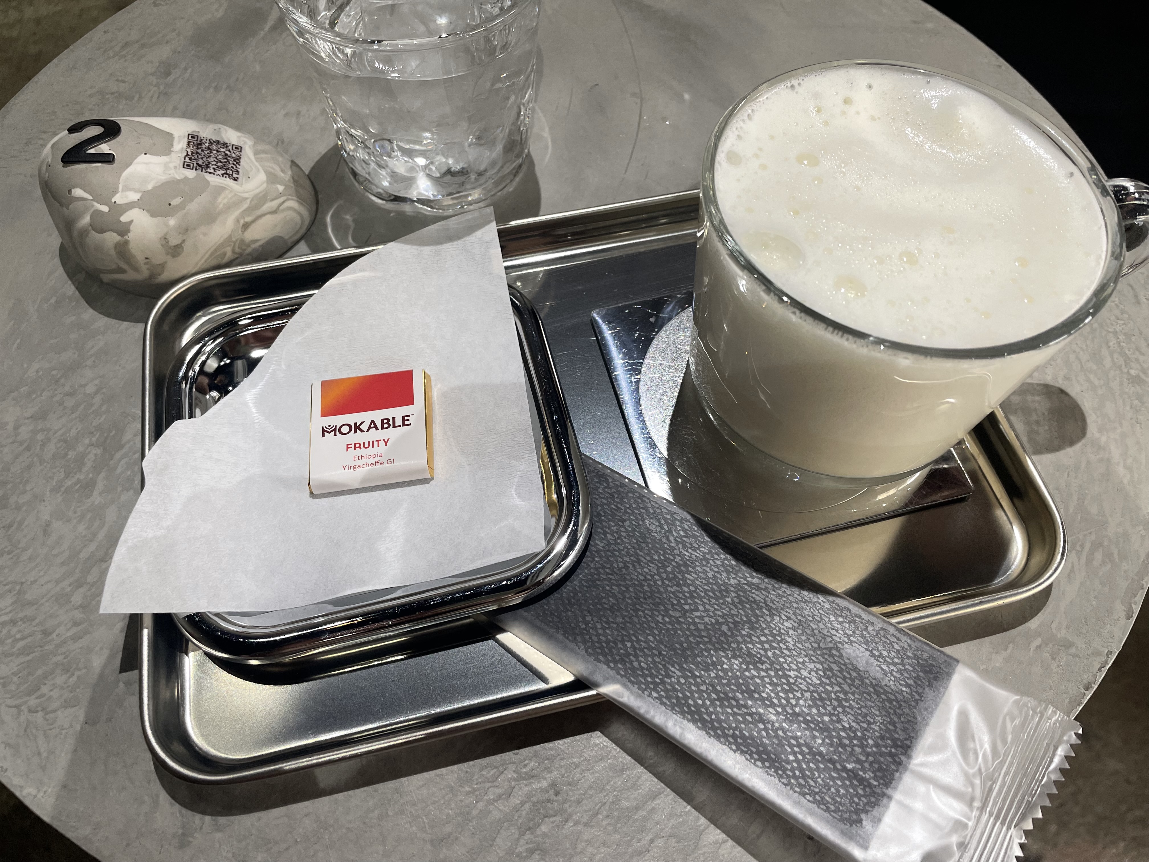 各テーブルには番号とQRコードが書かれたオブジェが置かれております。席が空いていて店内で飲食する場合は、ここからモバイルオーダーにて注文します。