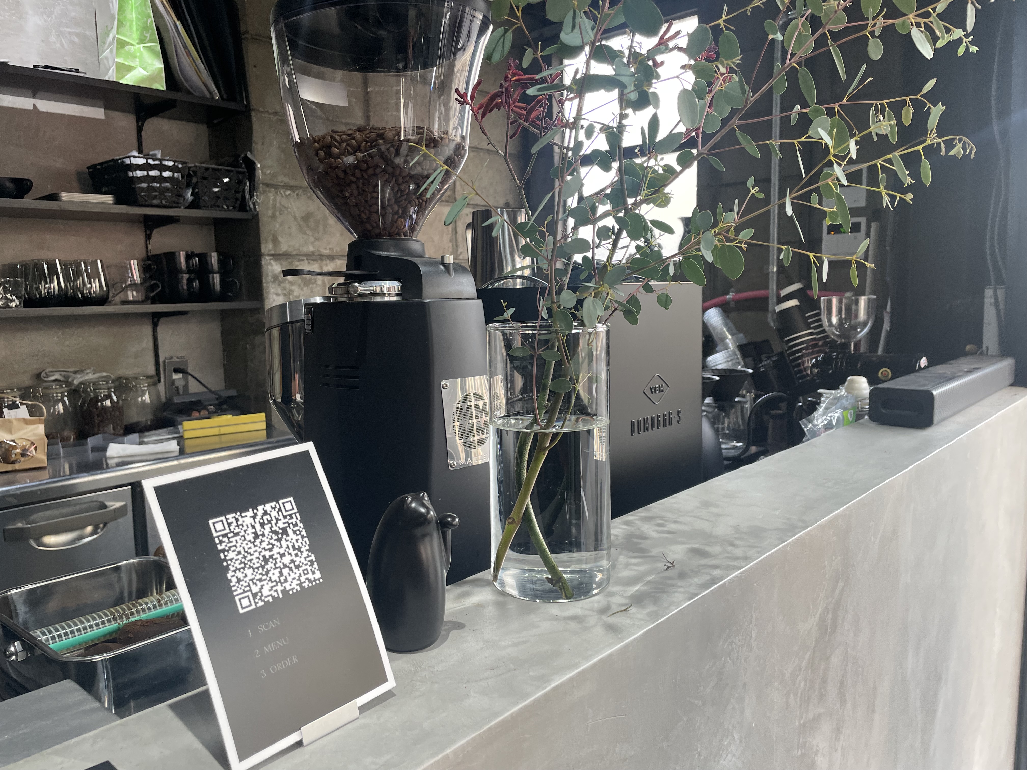 お店に入るとすぐに注文ができるカウンターがあります。注文はすべてQRコードからのモバイルオーダーになります。