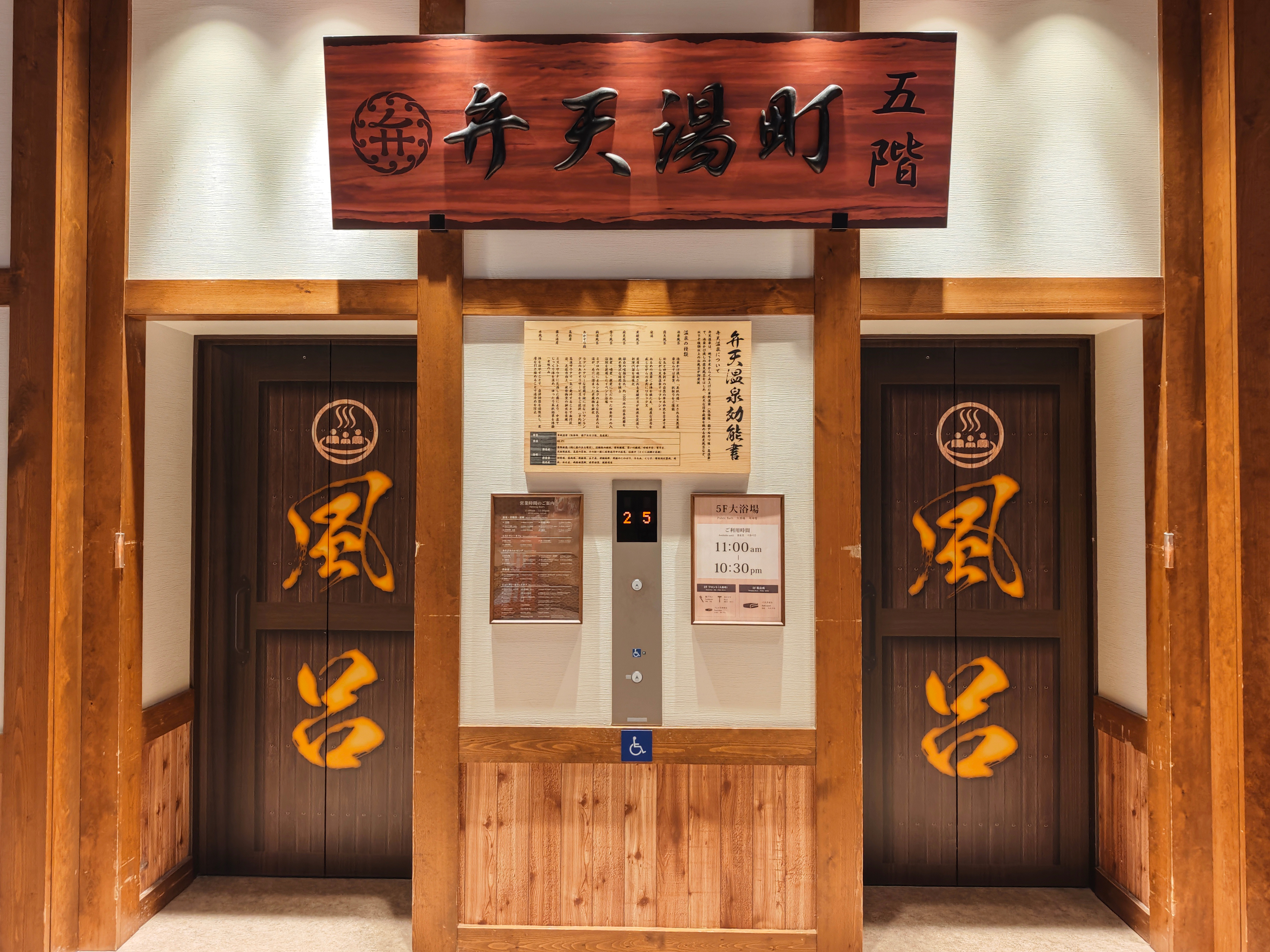 通路を進んだ奥にエレベーターがあり、5Fの大浴場に上がれます。