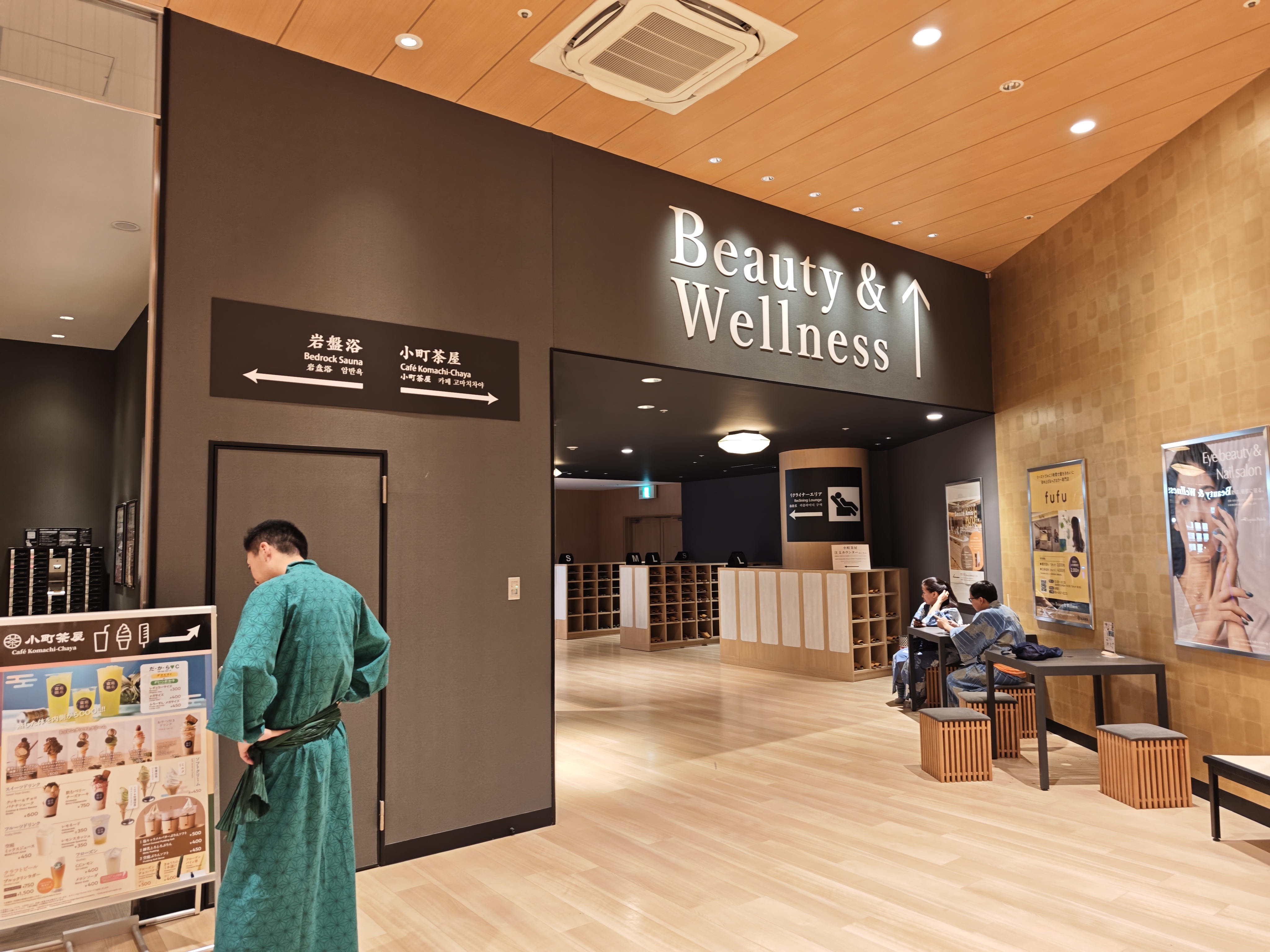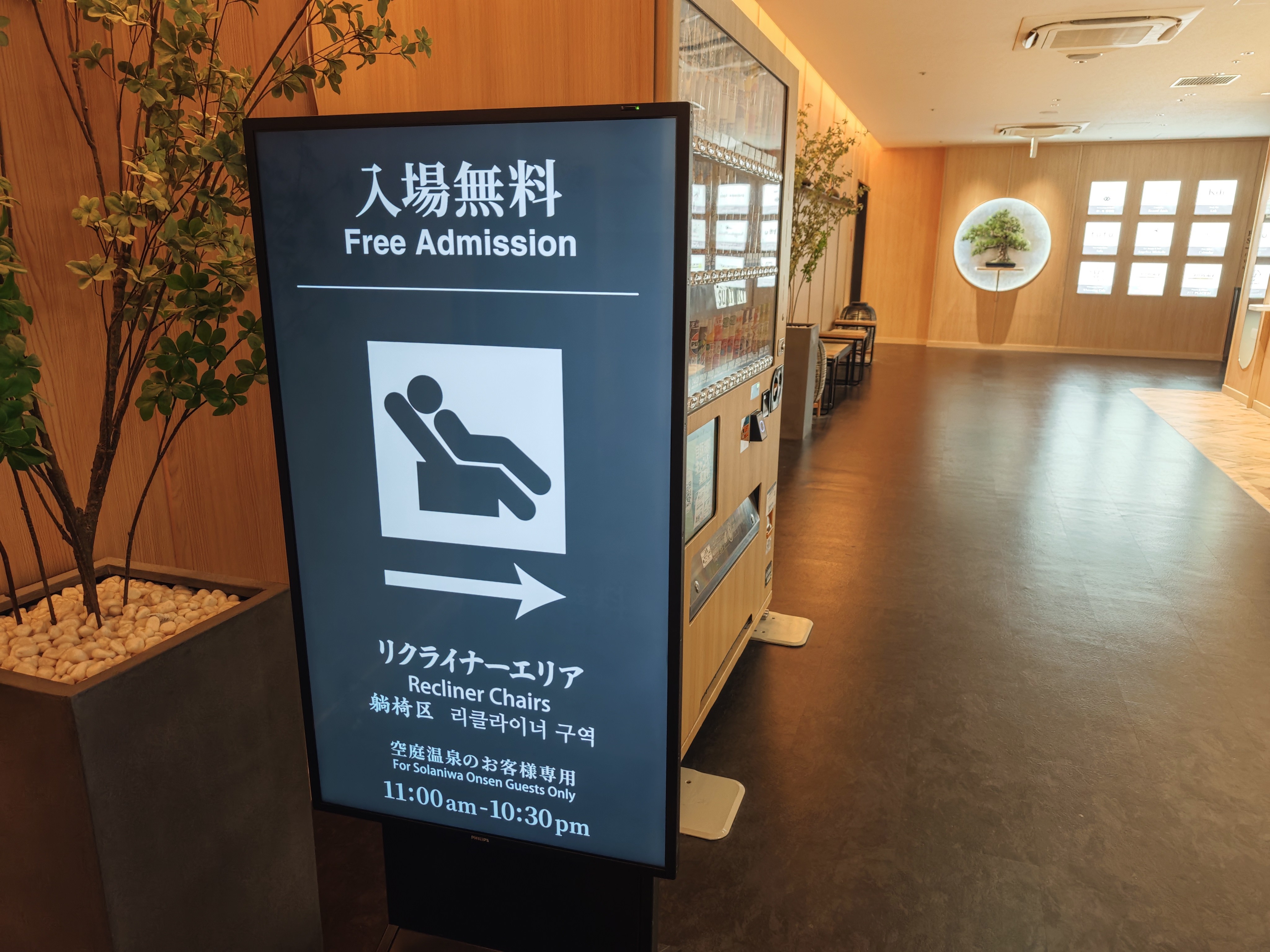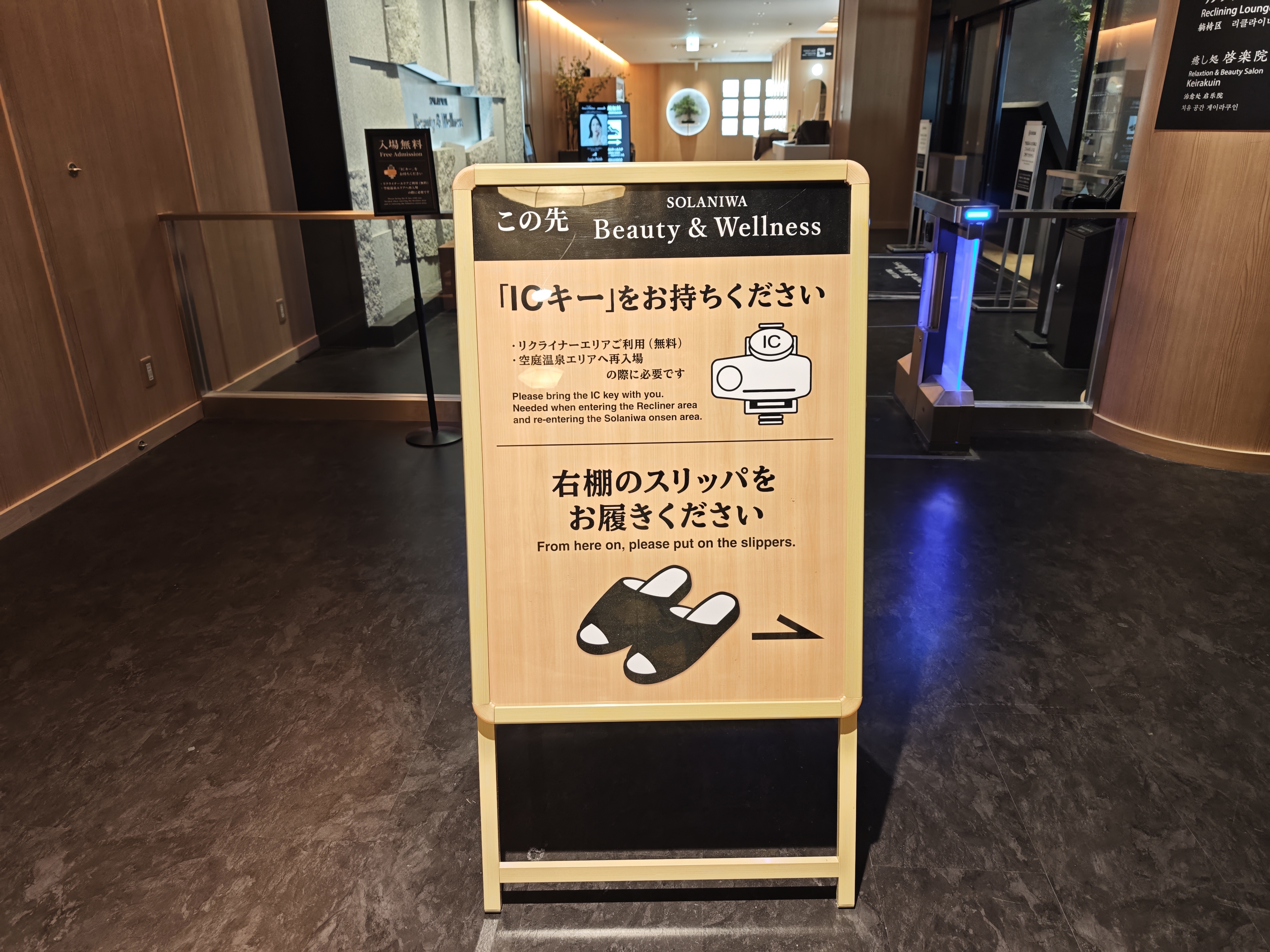 リクライナーエリアは温泉とは別の施設になるので、ここからスリッパを履いて外に出ます。