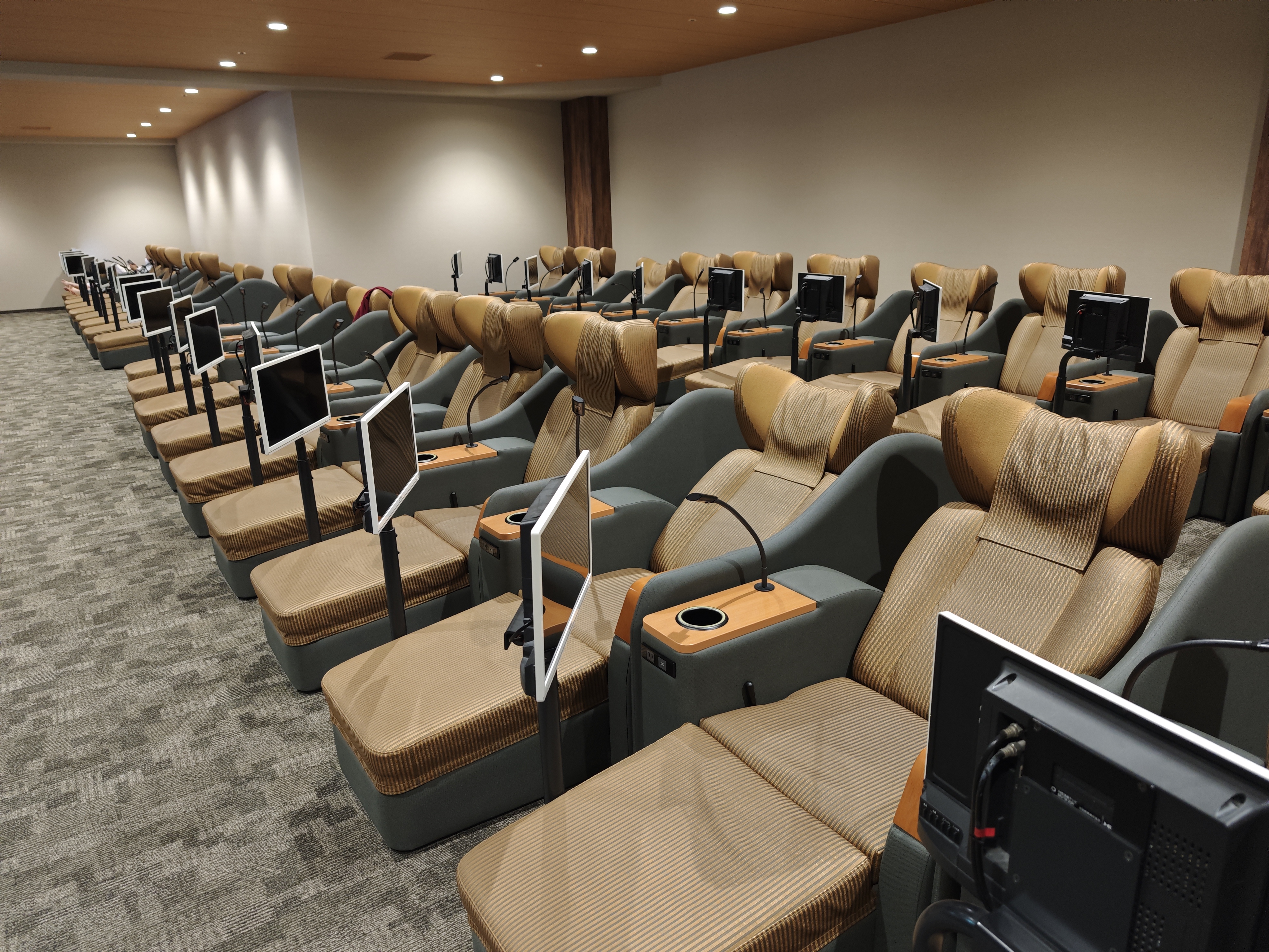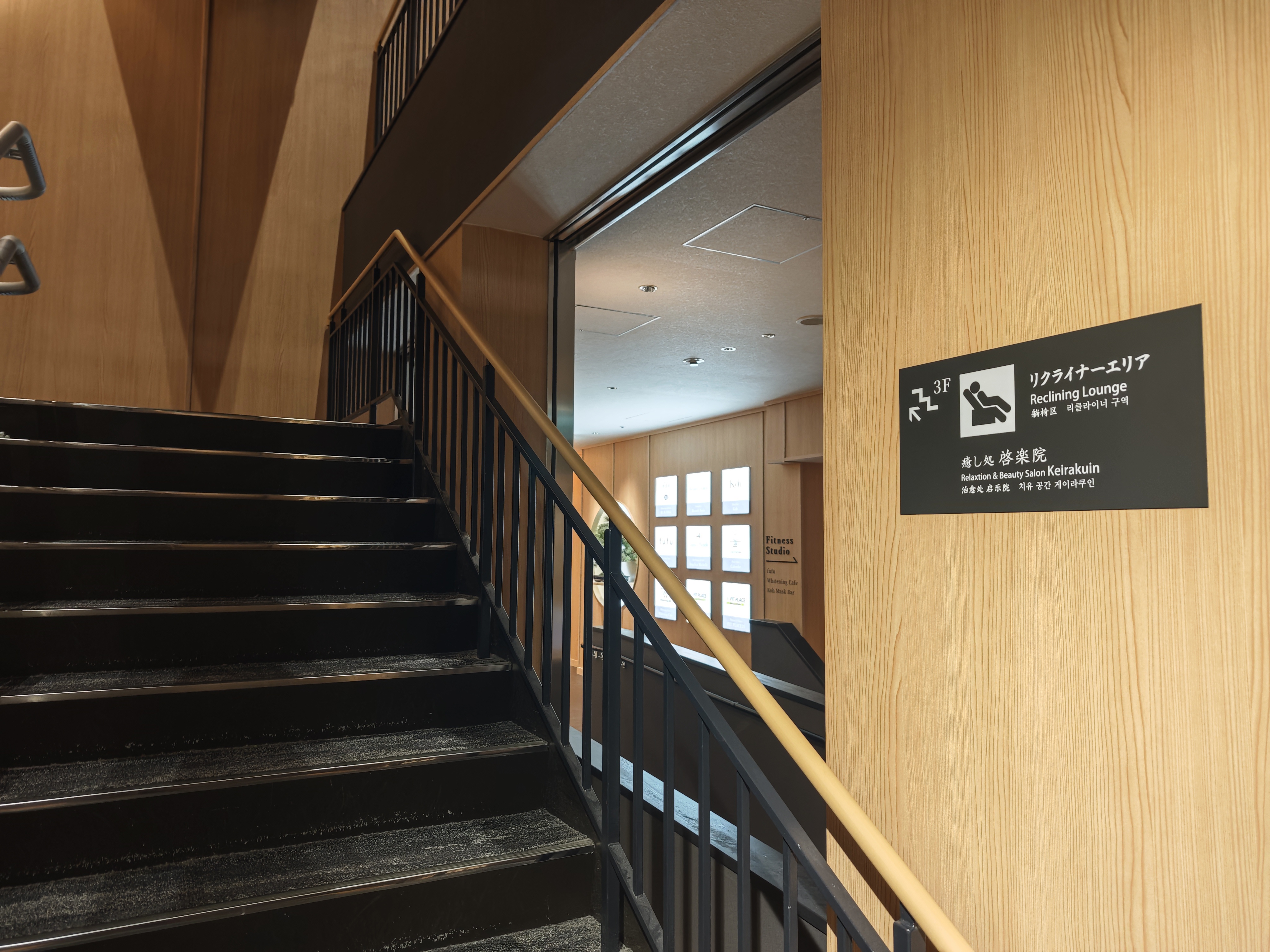 まっすぐ進んだ右側にリクライナーエリアに上がる階段があります。