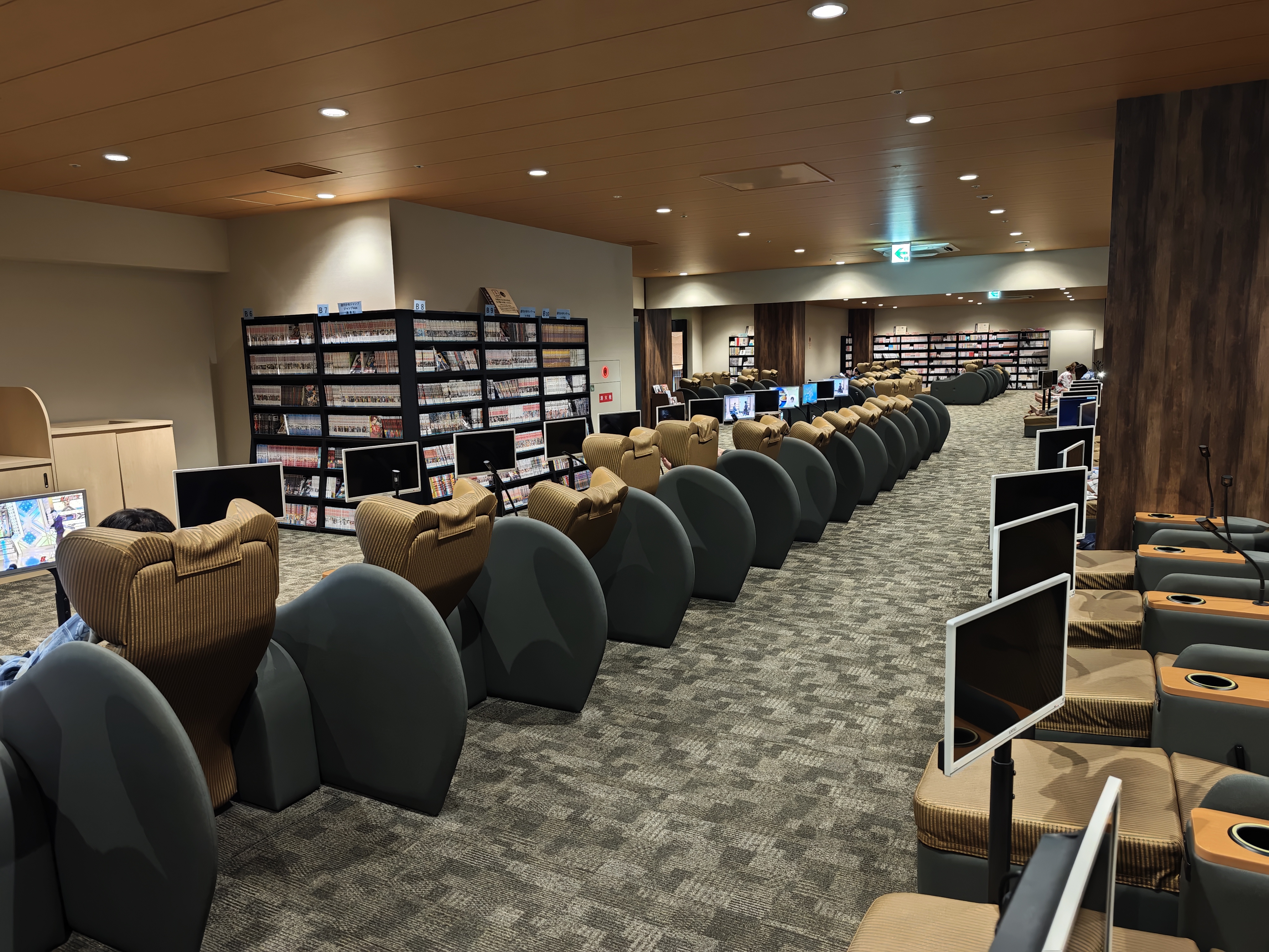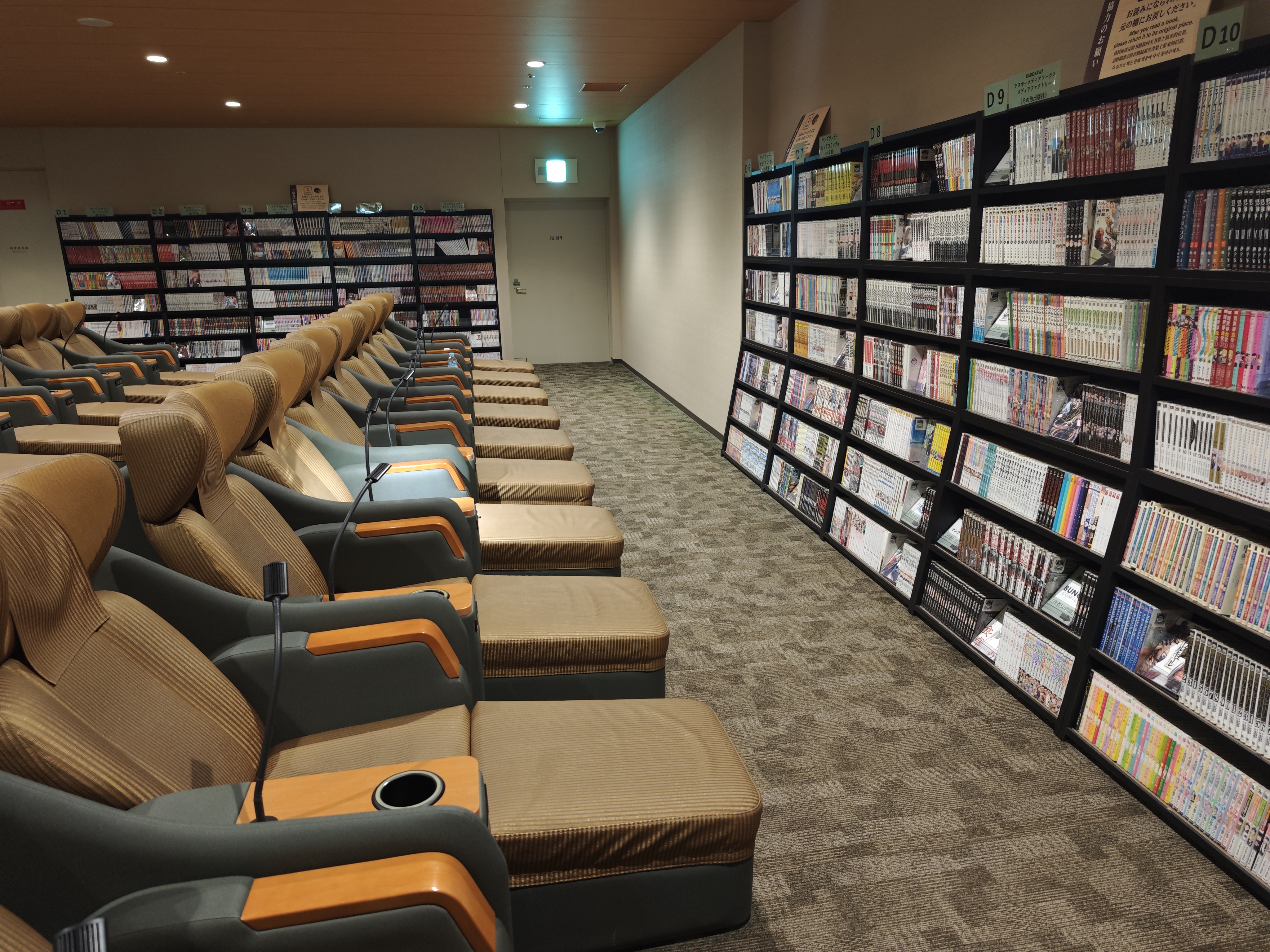 リクライナーエリアは、かなりの数のリクライニングチェアと沢山の漫画が置いてあり、ゆっくりとくつろぐ事が出来ます。