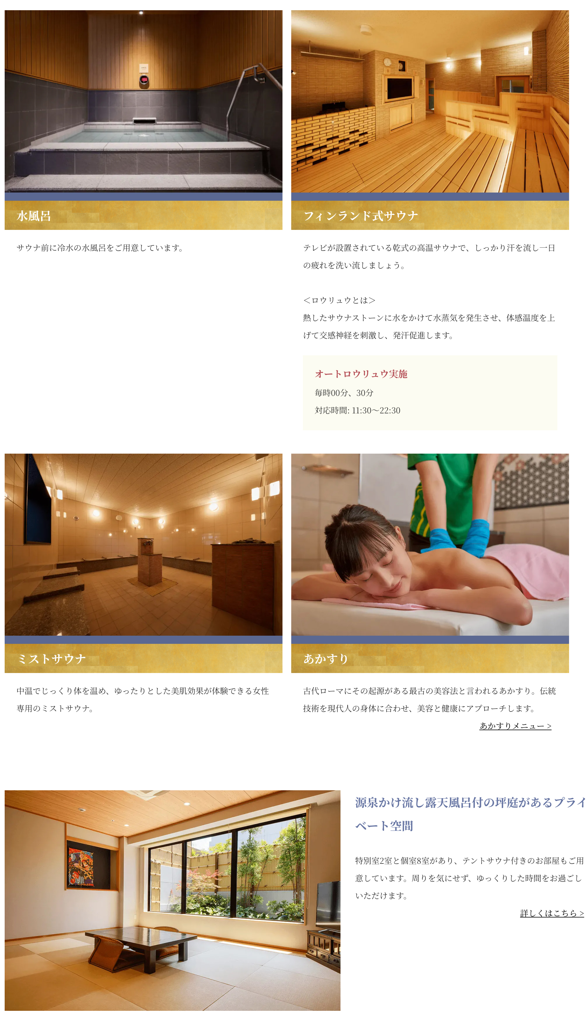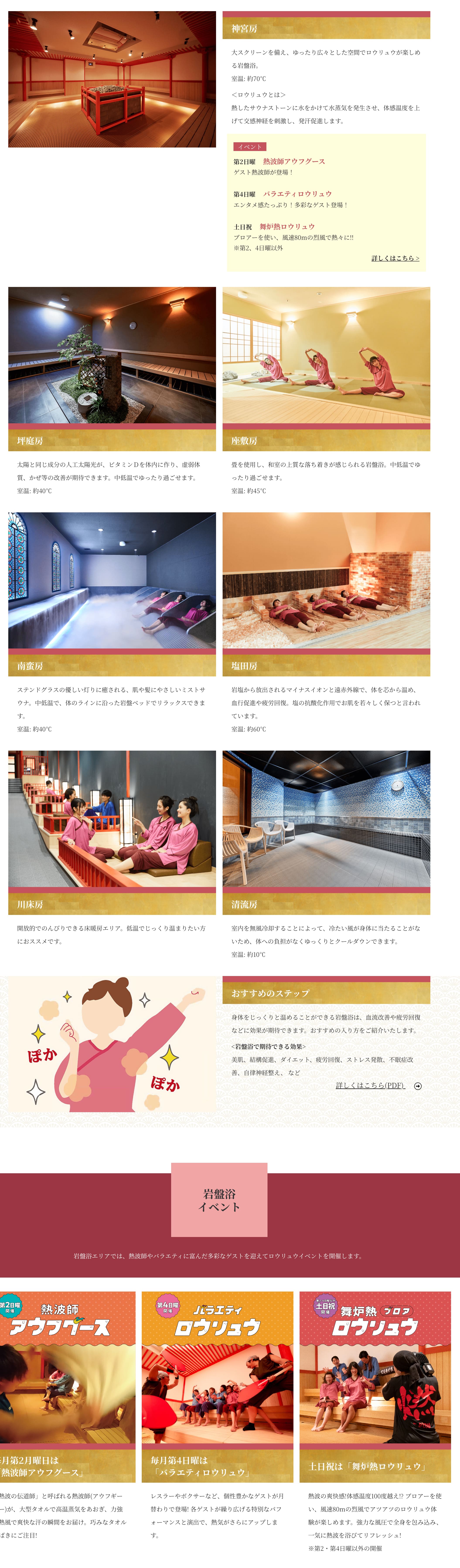 岩盤浴は7つのエリアと曜日によってロウリュウイベントが開催されています。