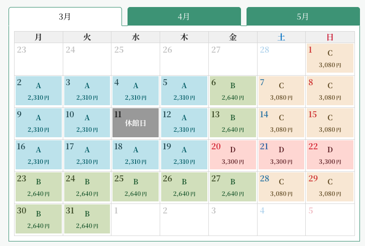空庭温泉の料金は日にちによって金額が変わる、ダイナミックプライシング制度が導入されています。
