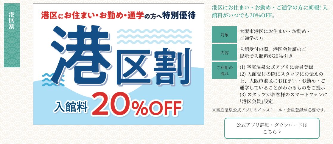 港区割を利用するには、事前に公式アプリをダウンロードしておいて、受付カウンターで港区在住(働いている)の本人確認が取れれば割引が利用できます。