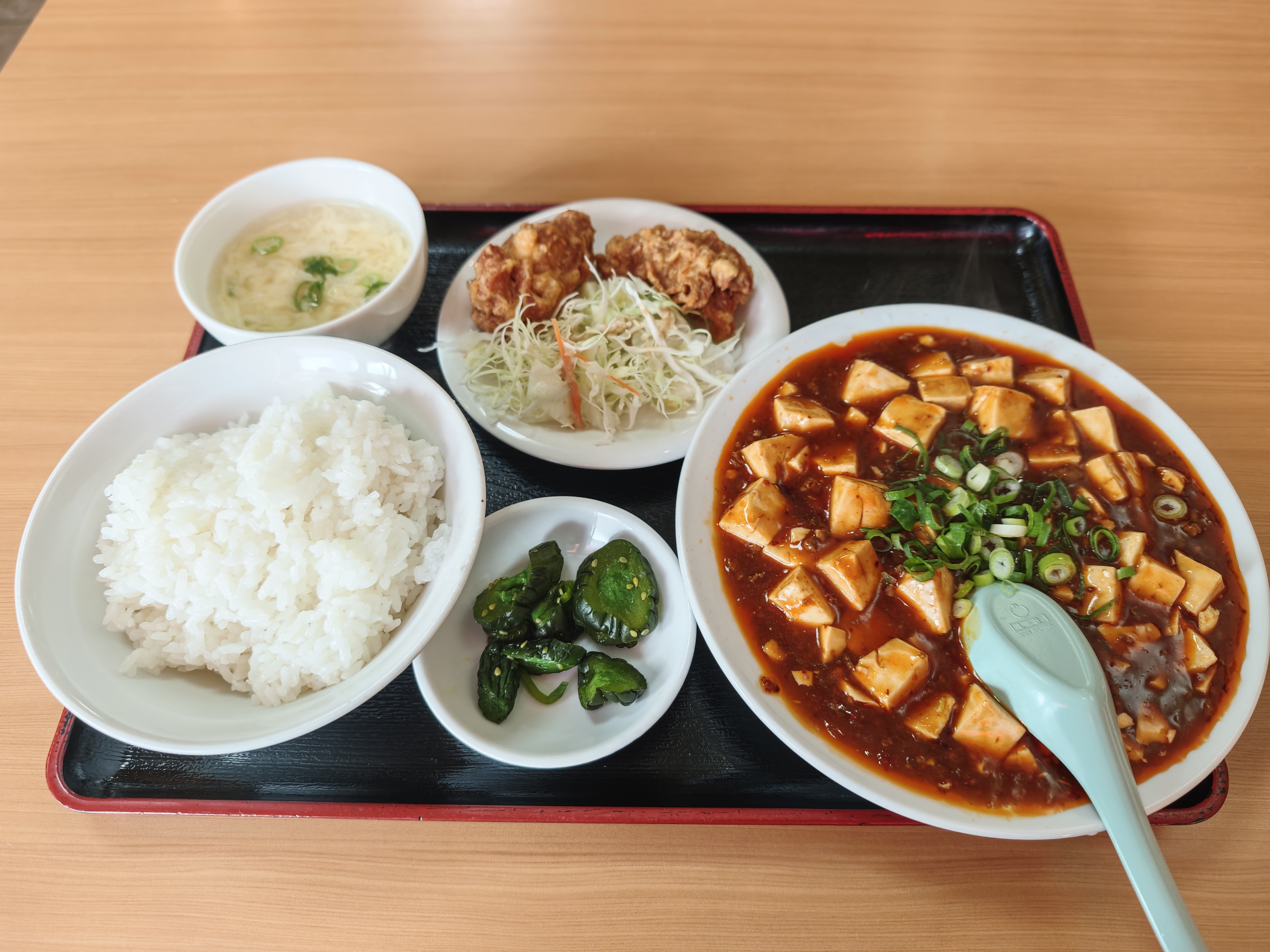 麻婆豆腐・鶏の唐揚げ・ライス・卵スープ・漬物・サラダがセットになった、ボリューム満点のお得なランチです。