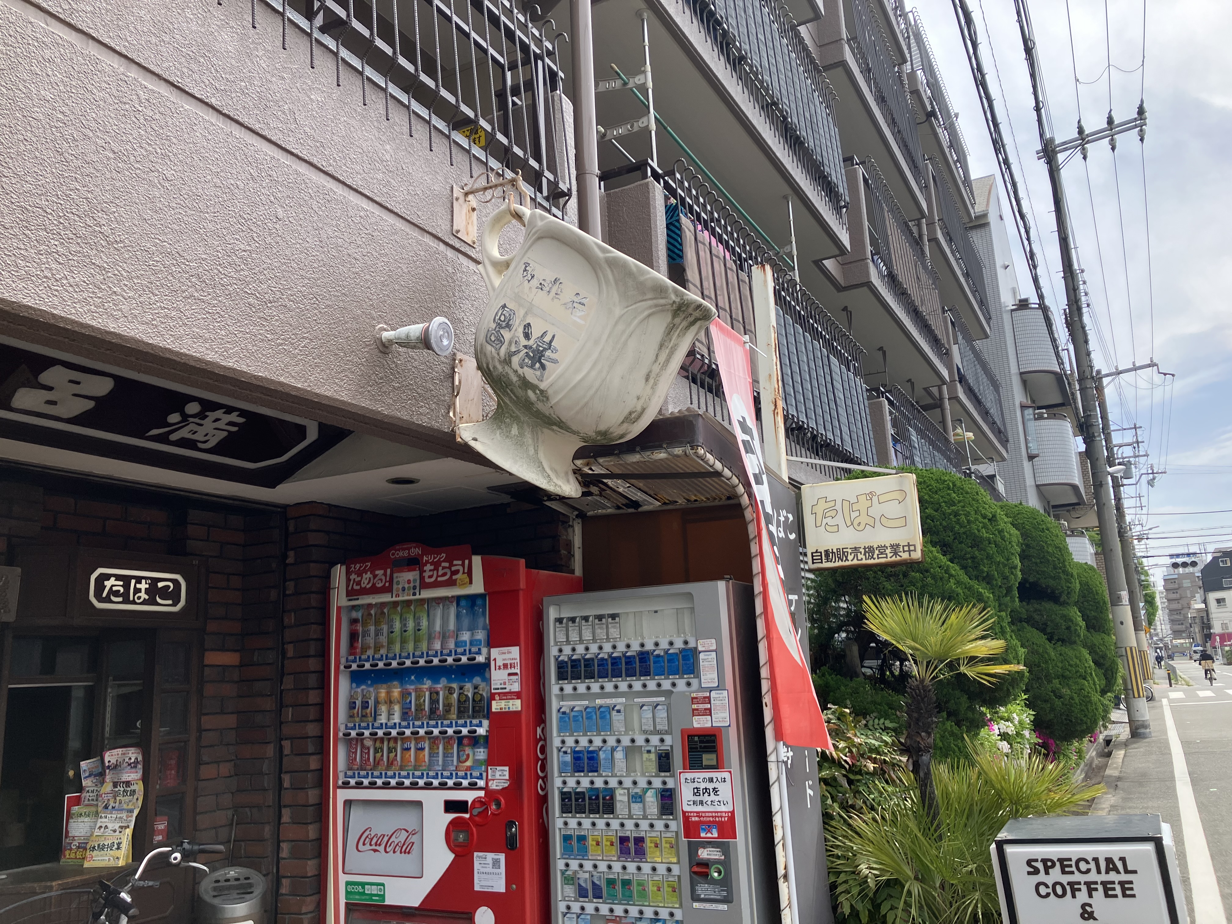 インパクト大なコーヒーカップが壁にぶら下がっており、遠くからでも見つけやすいです。店内は喫煙可能で、店外にも煙草の自販機が設置されています。