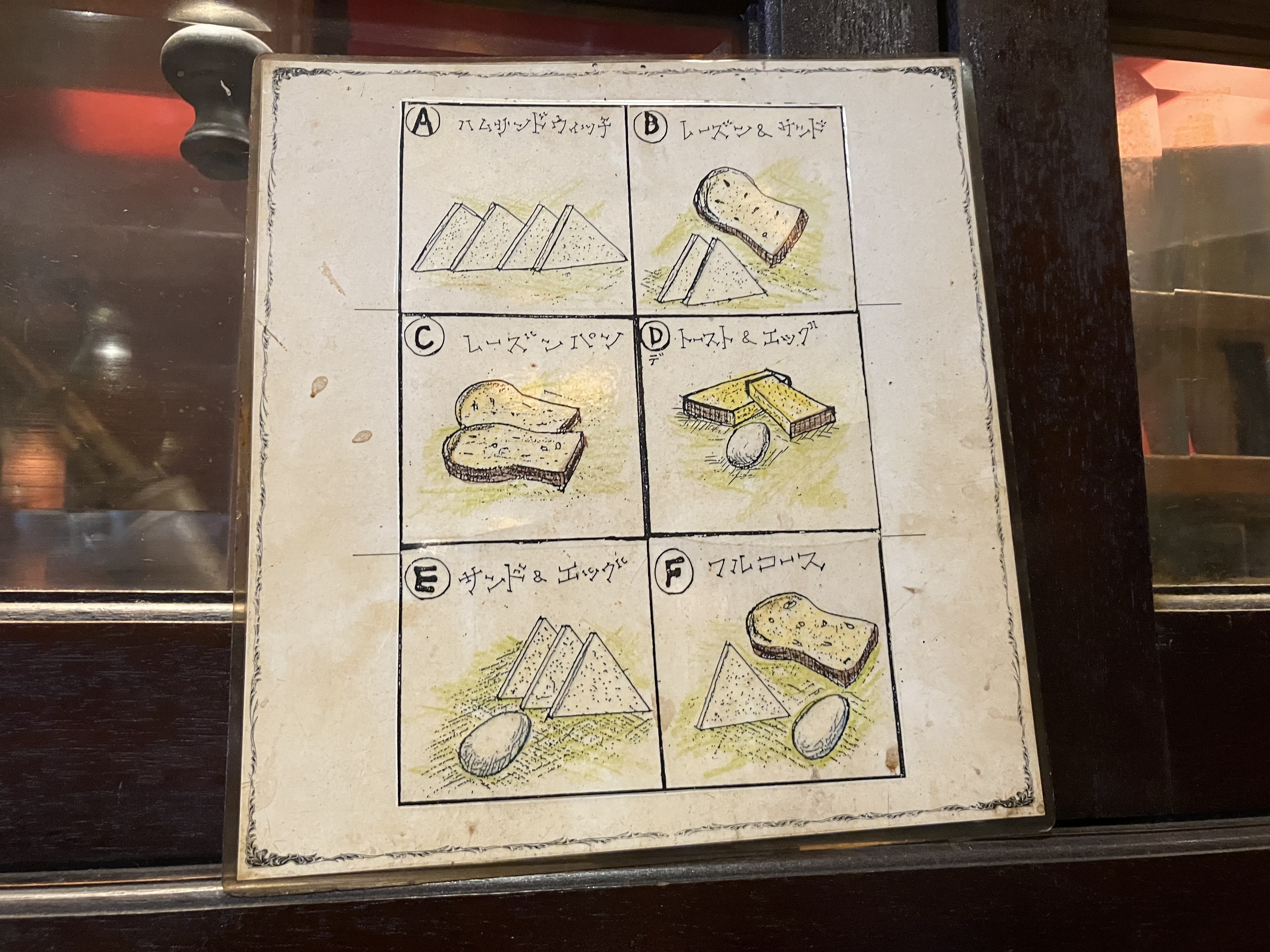 モーニングはA~Fの6種類。ハムサンドウィッチ、レーズンパン、トースト、ゆで卵の組み合わせを選ぶことができます。値段が書いてありませんでしたが、ドリンクの値段+50円で食べられるとのこと。