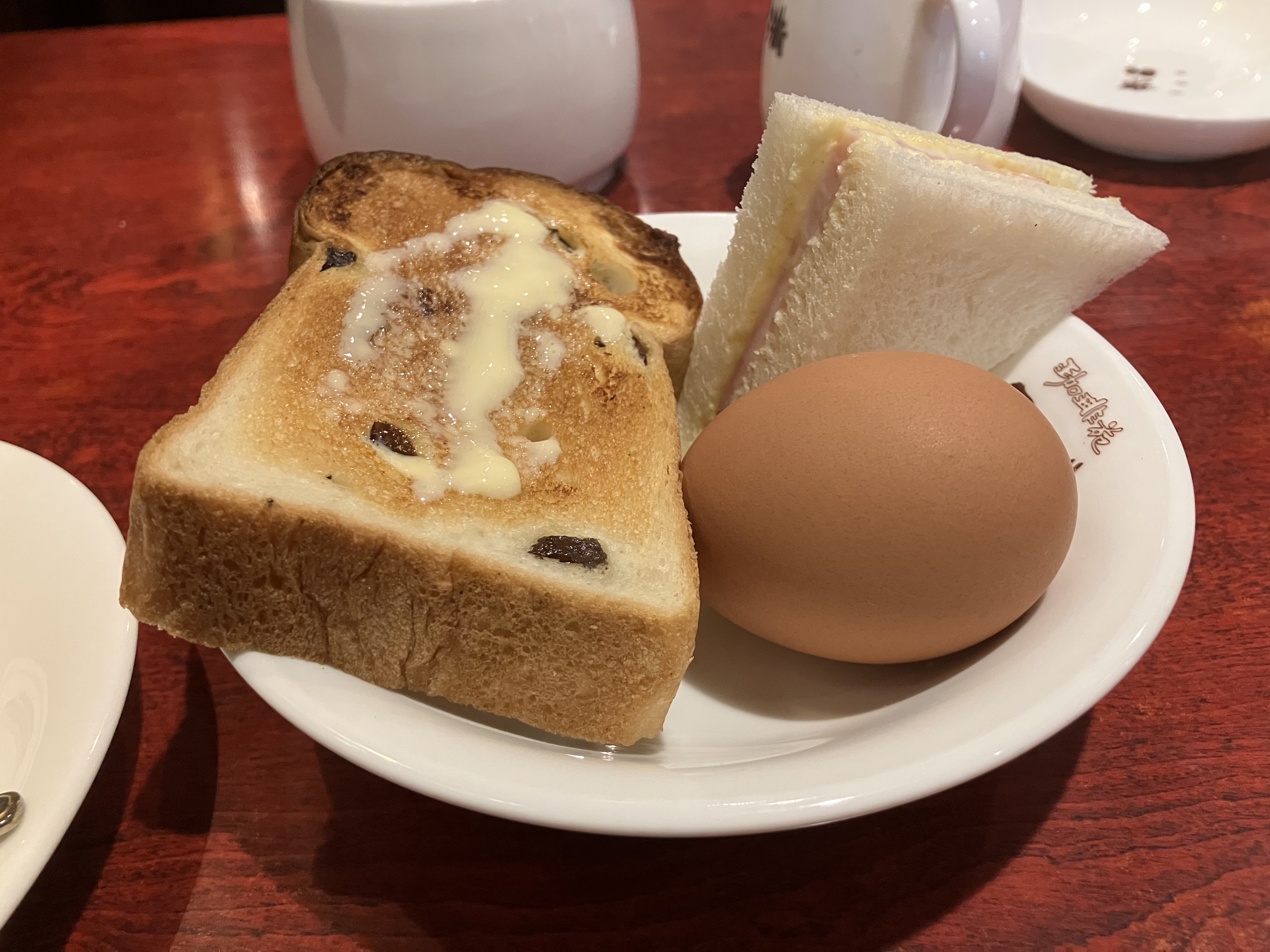 厚さ2センチほどのミニサイズのレーズンパンはカリッと香ばしく焼かれていて、噛むほどに小麦の甘みが感じられ、バターの塩気とレーズンの甘さがたまりません。ハムサンドはカラシの効いたマヨネーズとハムの相性が抜群で何個でも食べられそうな美味しさ。ゆで卵は温かく、半熟で、鮮やかなオレンジ色の黄身が食欲をそそります。