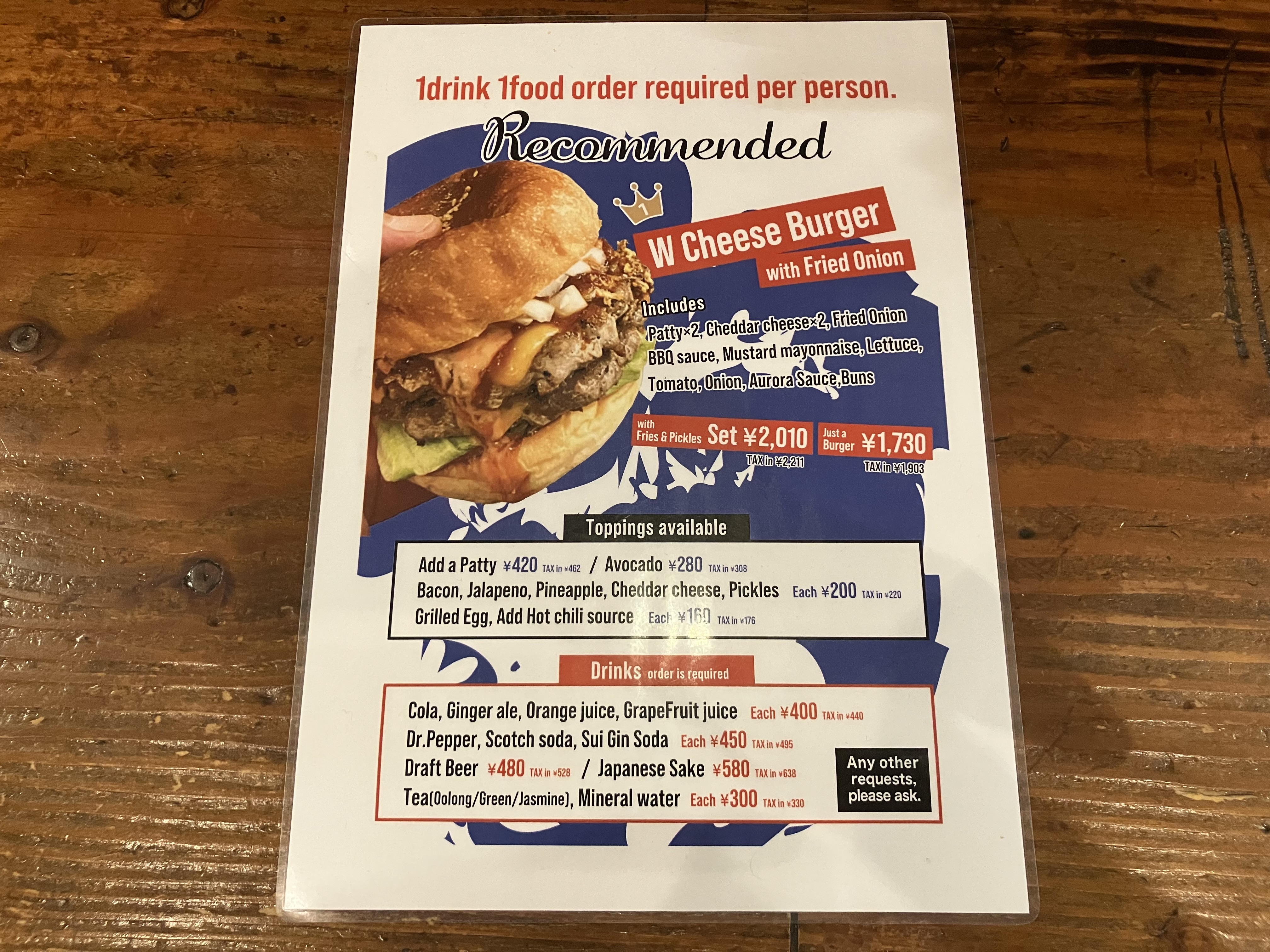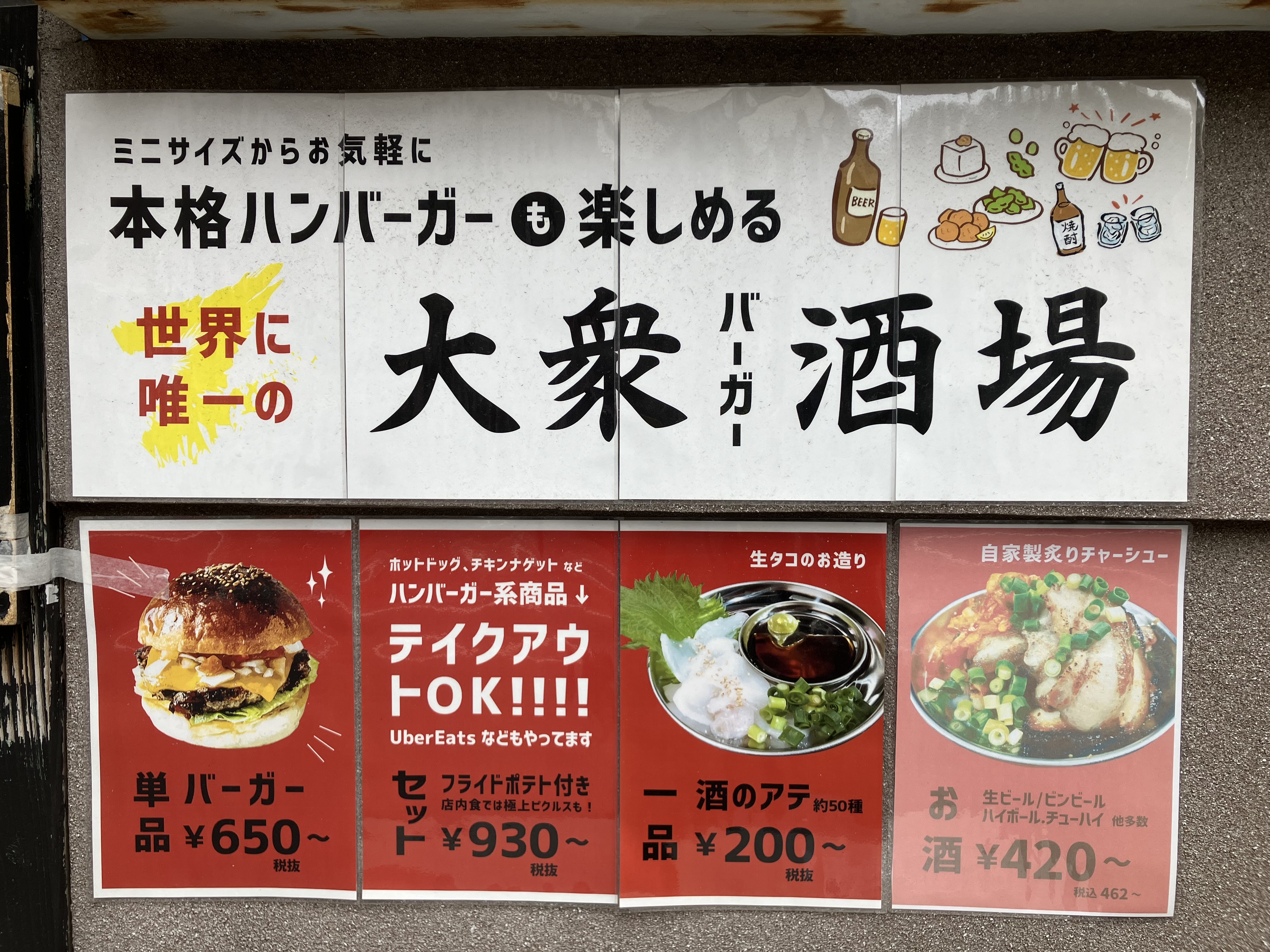 ハンバーガー系の商品はテイクアウトも可能とのこと。ハンバーガーとお酒、そして生タコのお造りが同じお店に共存するなんて…これは確かに世界に唯一と言えるかもしれません。
