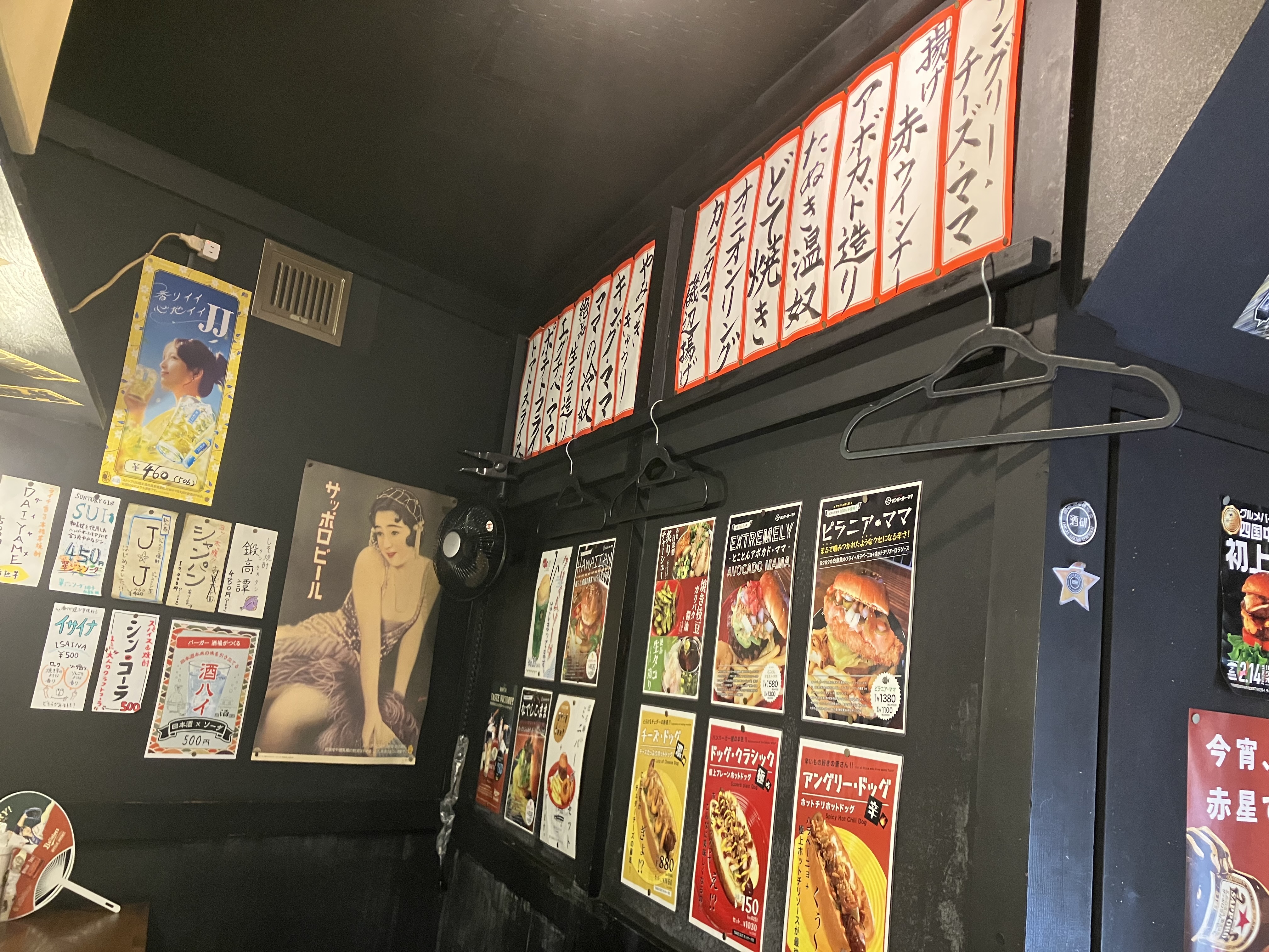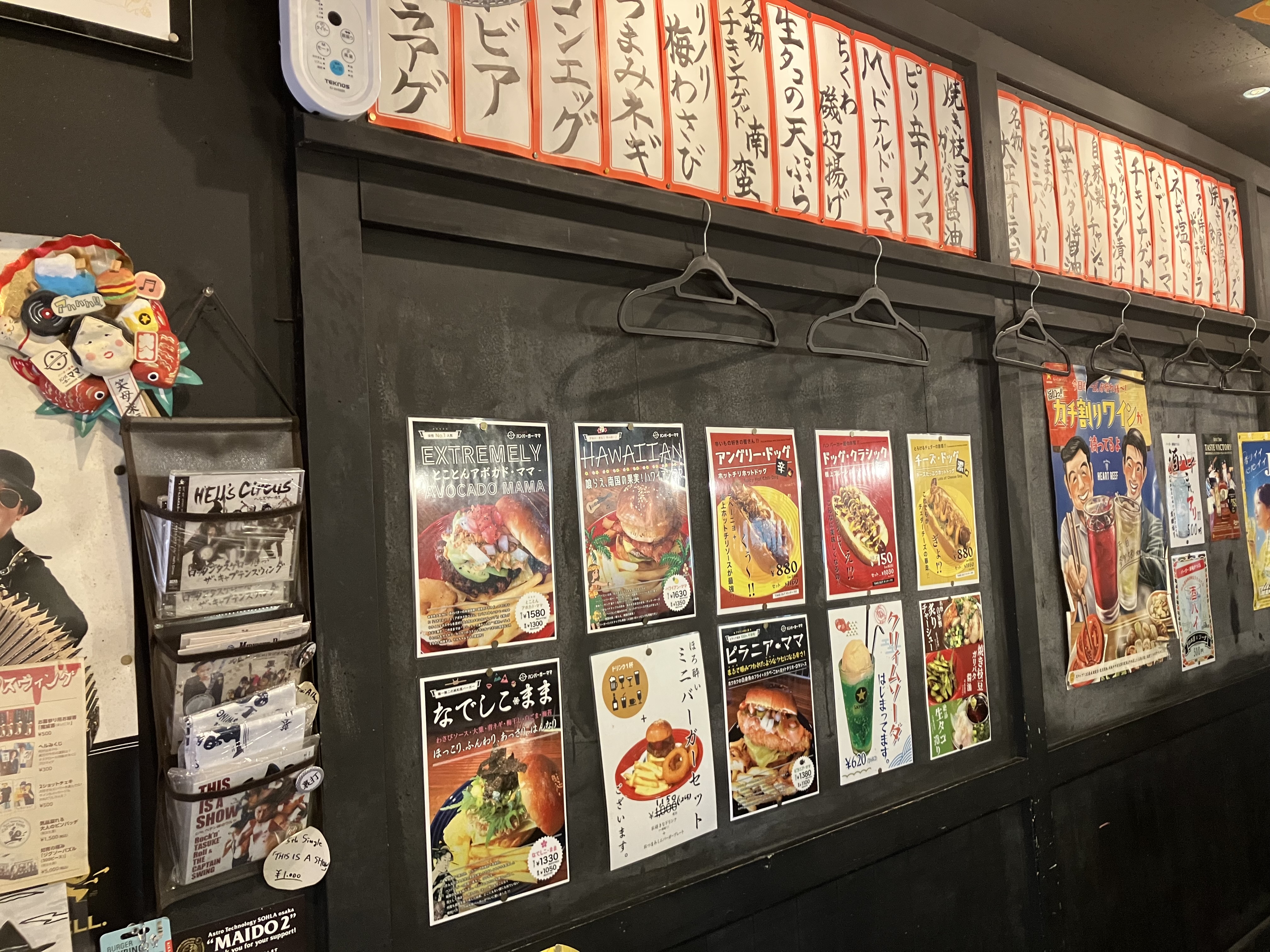 たくさんのハンバーガーメニューにまぎれて、昭和を感じるポスターもちらほら。この組み合わせ、斬新で素敵です。