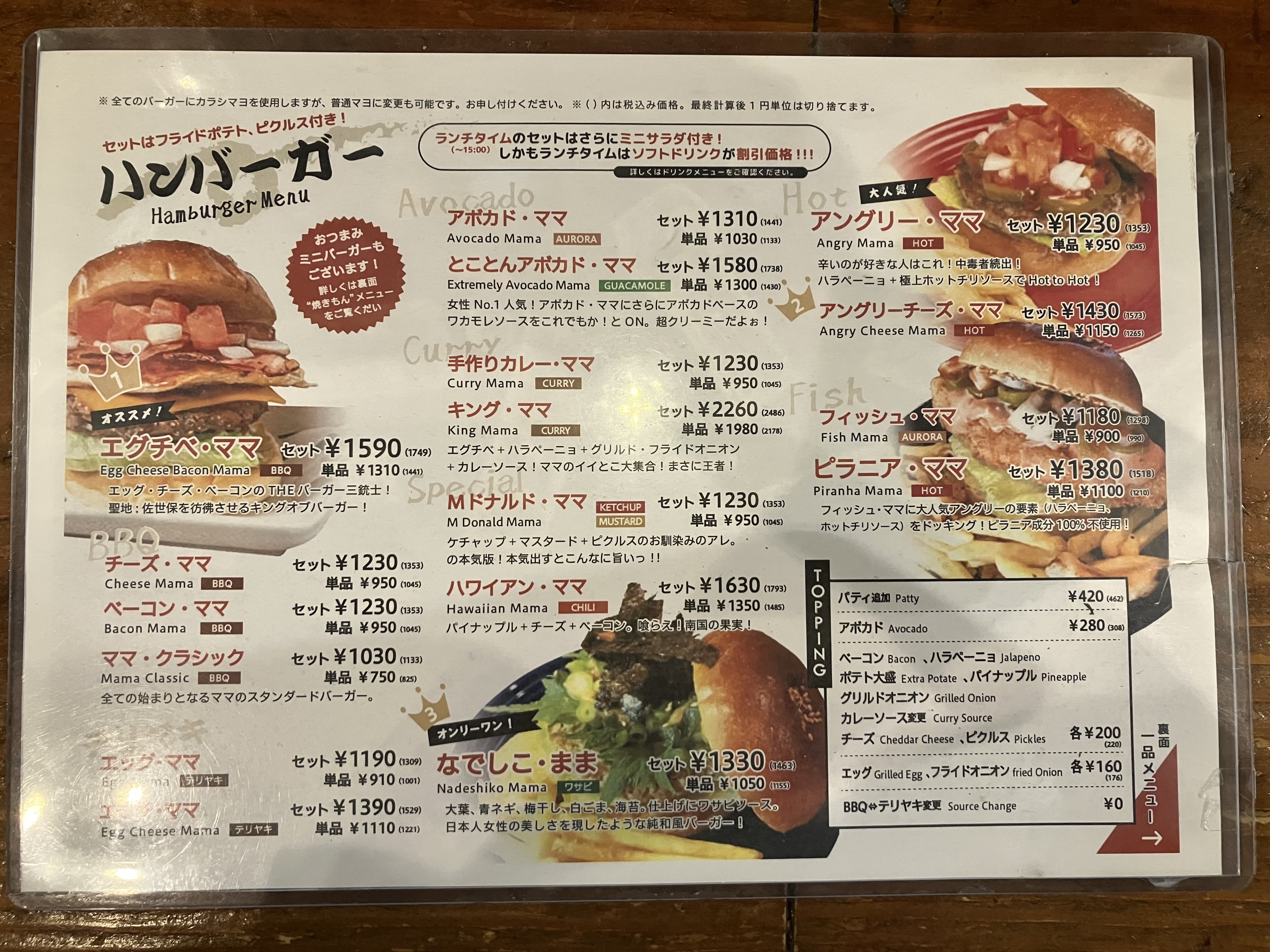 「バーガー酒場 ハンバーガー・ママ」メニュー