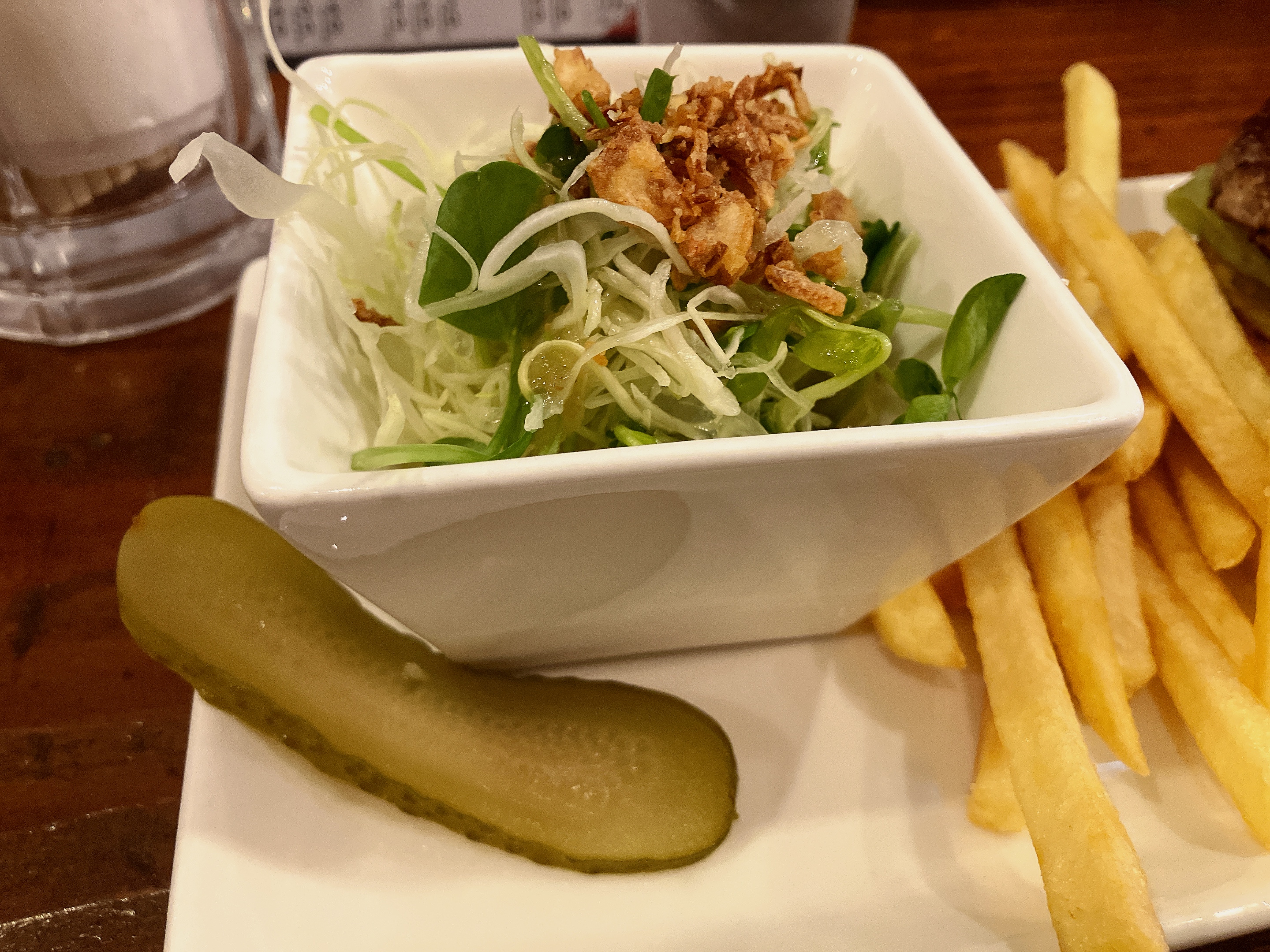 サラダに乗ったオニオンチップが、いいアクセント。ピクルスは別添えになっていますが、お好きな方は挟んで食べると、パティをさっぱりと食べられます。