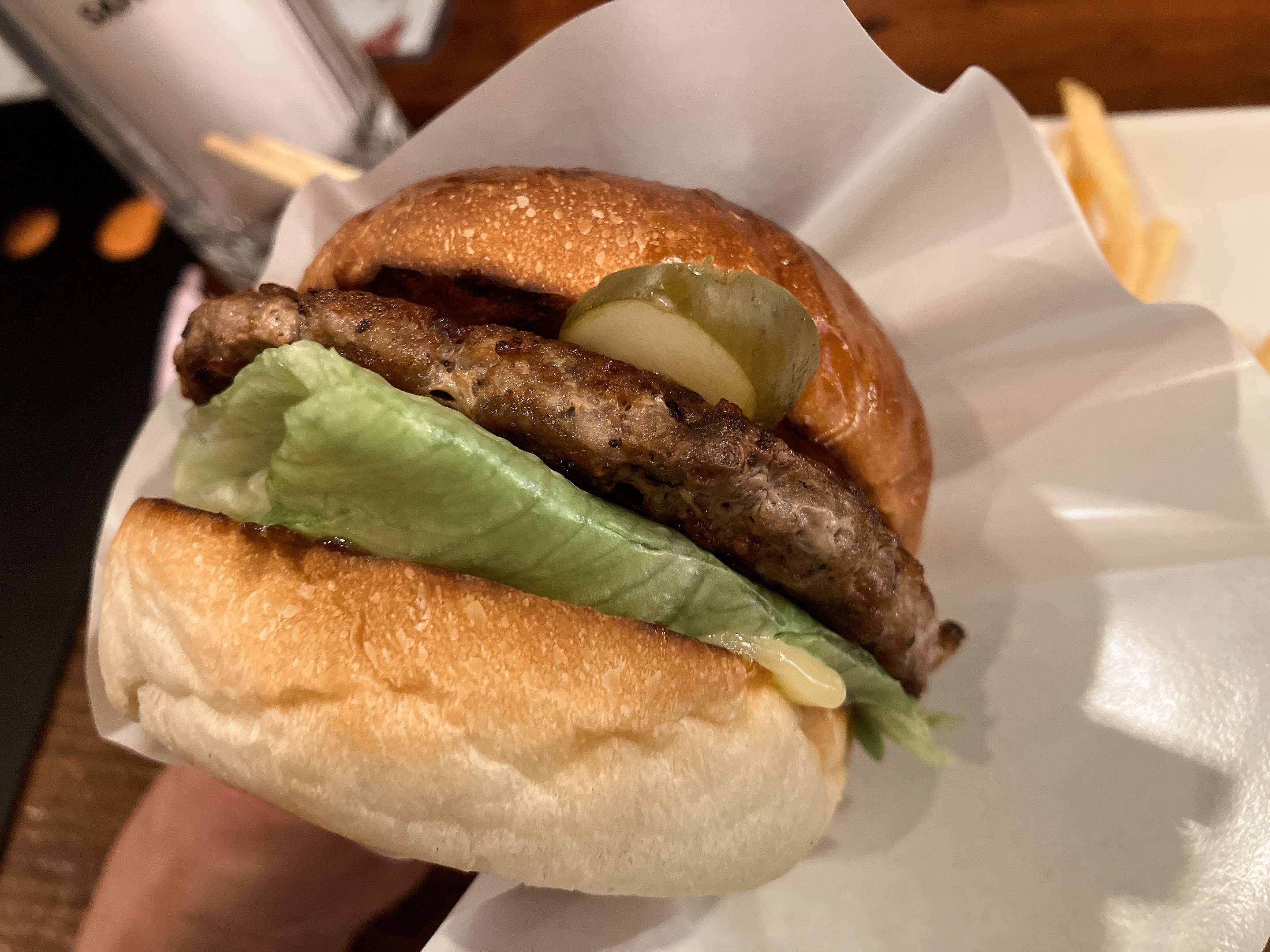 粗挽きの肉肉しいパティに、シャキシャキな野菜と少し酸味のあるピクルス、それぞれの食感と味が見事に調和されています。見た目以上にボリュームがあり、ガッツリとした食べ応え。