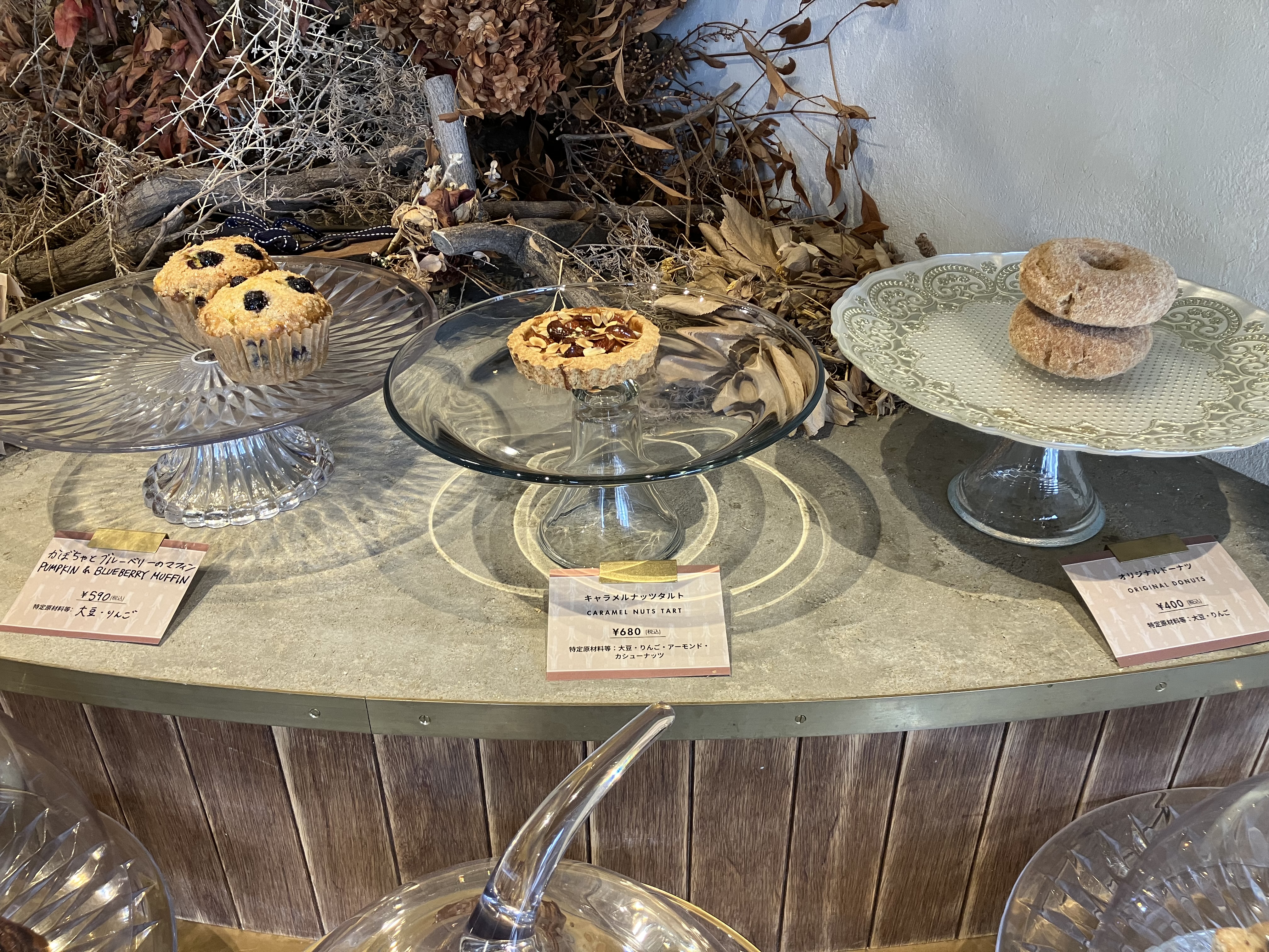 店内は明るく清潔感のある空間。入った瞬間に目に入る、ずらりと並んだ焼菓子たちに心が躍ります。ドーナツにタルト、マフィンにクッキーと、さまざまな焼菓子のふんわりとした甘い香りが漂っています。