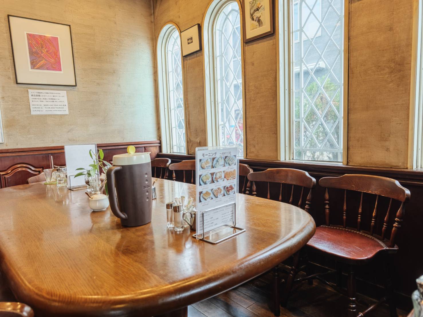 店内はクラシカルな雰囲気です。カウンターにはハイチェアが数席あります。