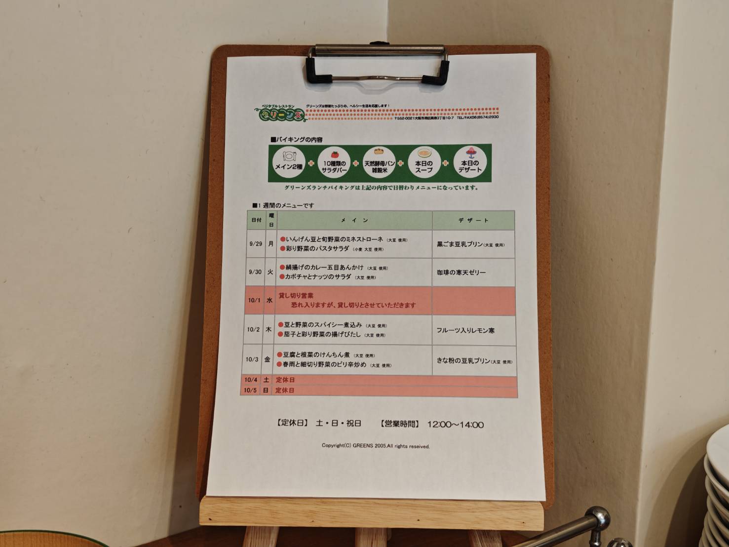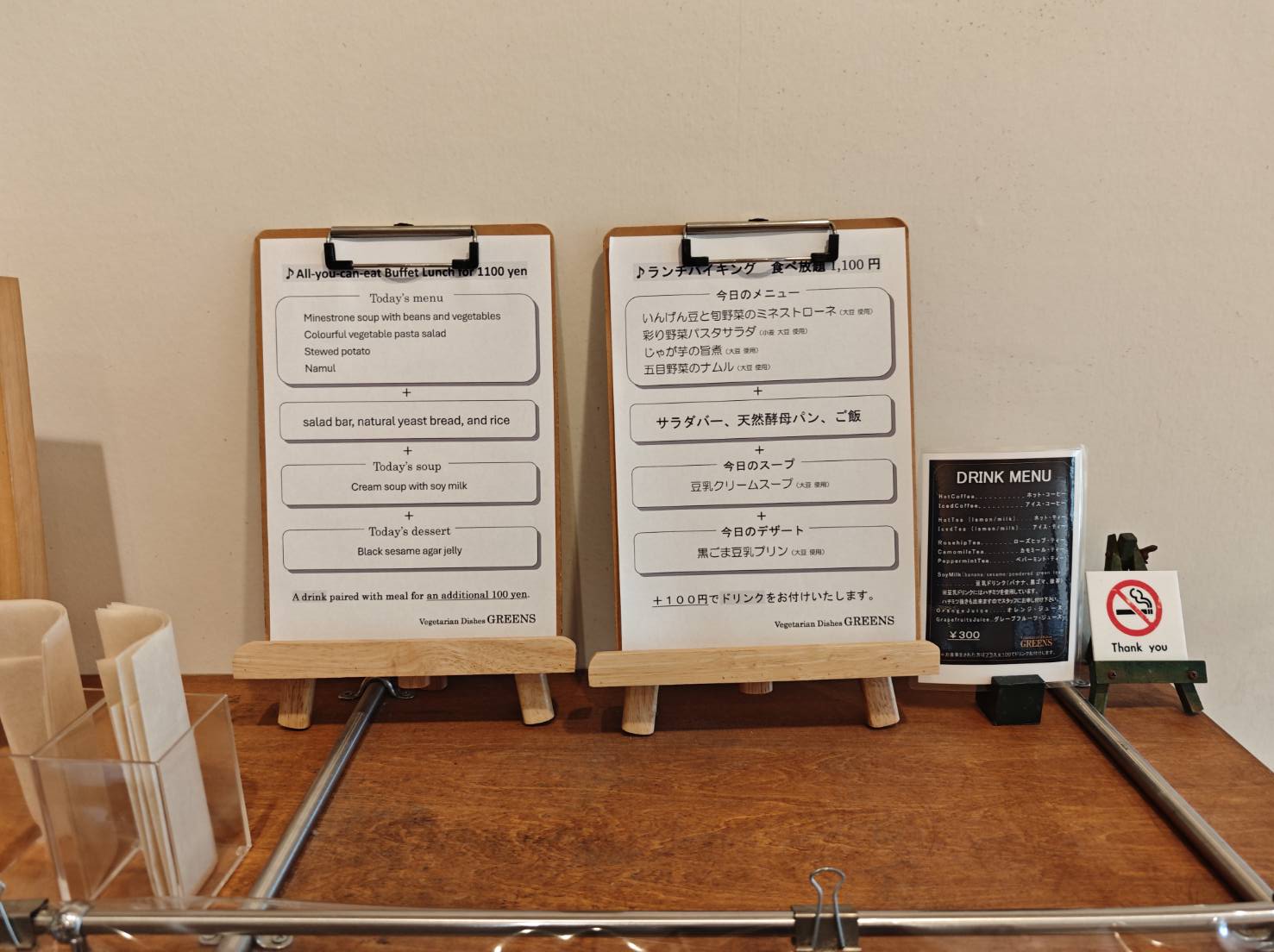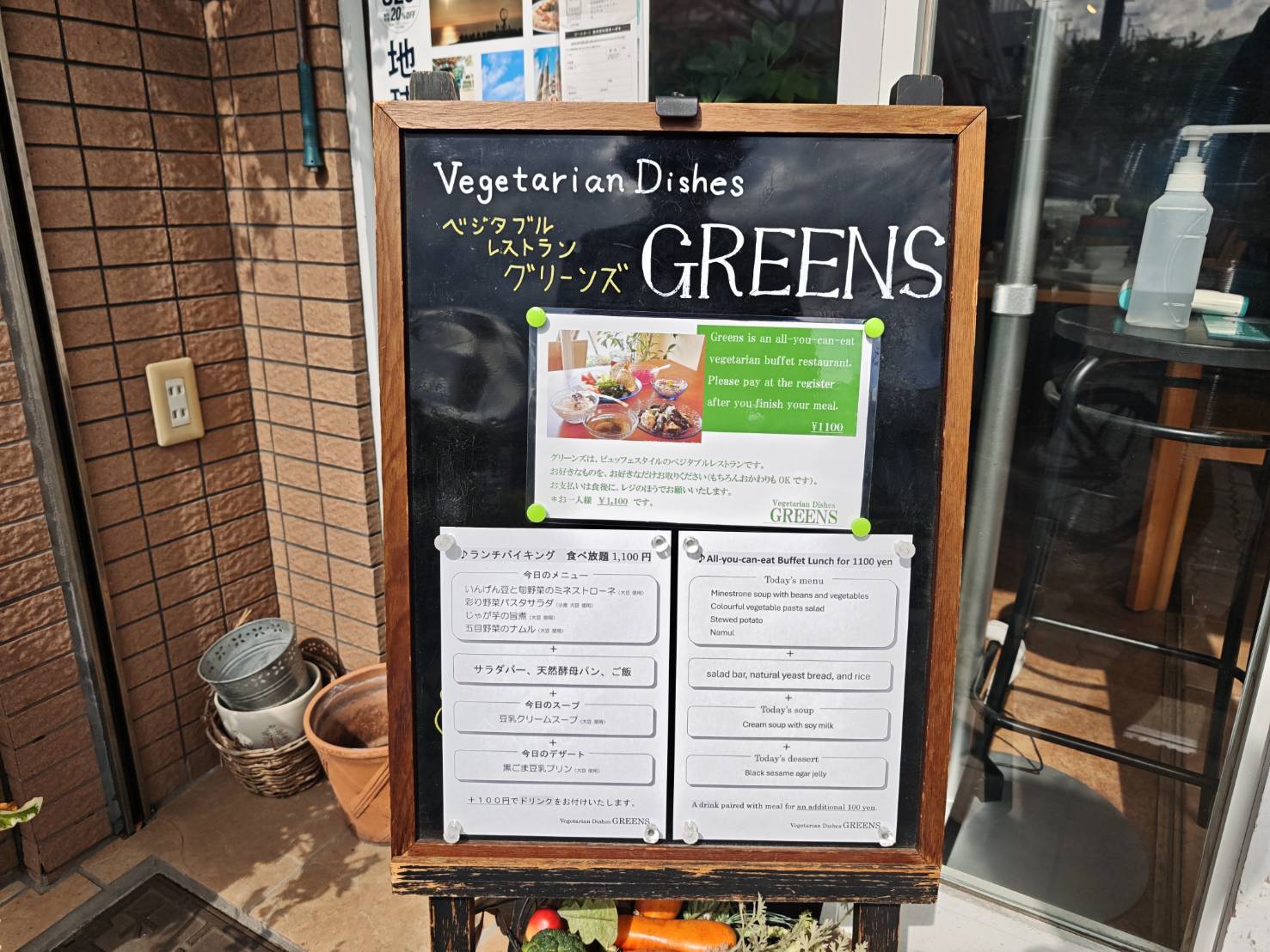 「VEGETARIAN DISHES GREENS – ベジタブルレストラングリーンズ」メニュー