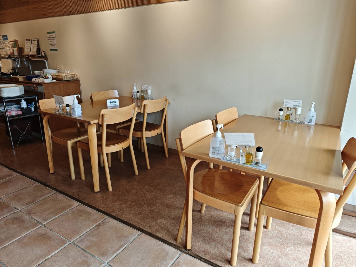 店内は左側に2人用のテーブルが4つと、奥にバイキングテーブルがあります。
