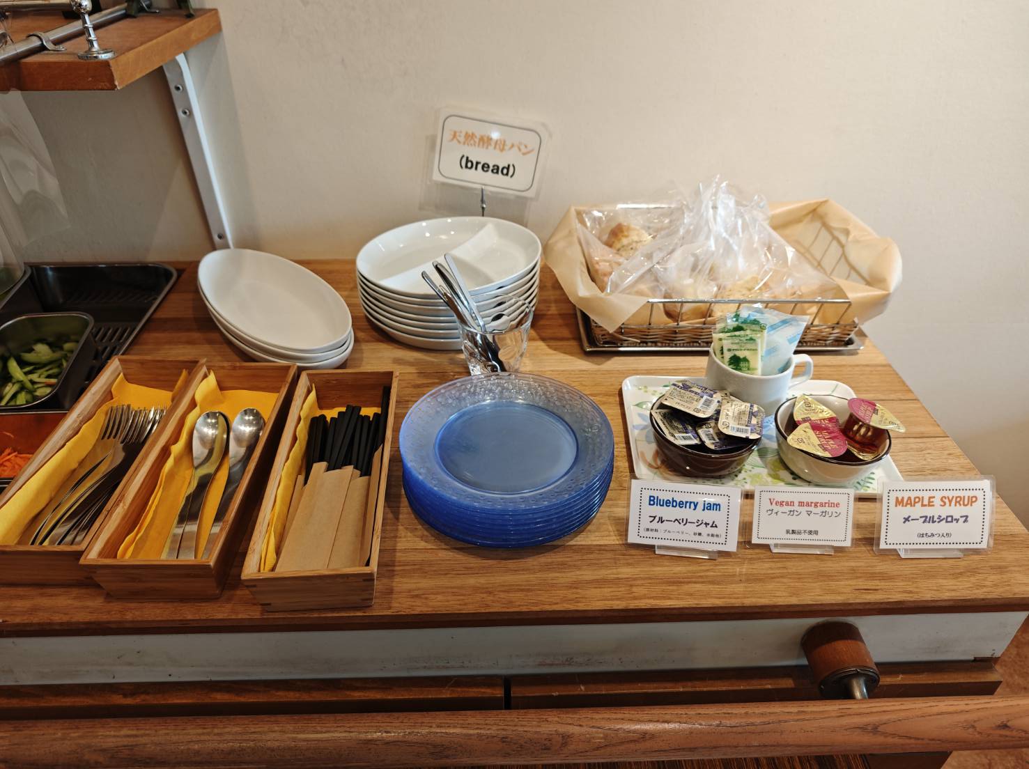 パンは一つずつ袋に入っており衛生的。パンに付けるジャム、マーガリン、メープルシロップも置いてあります。